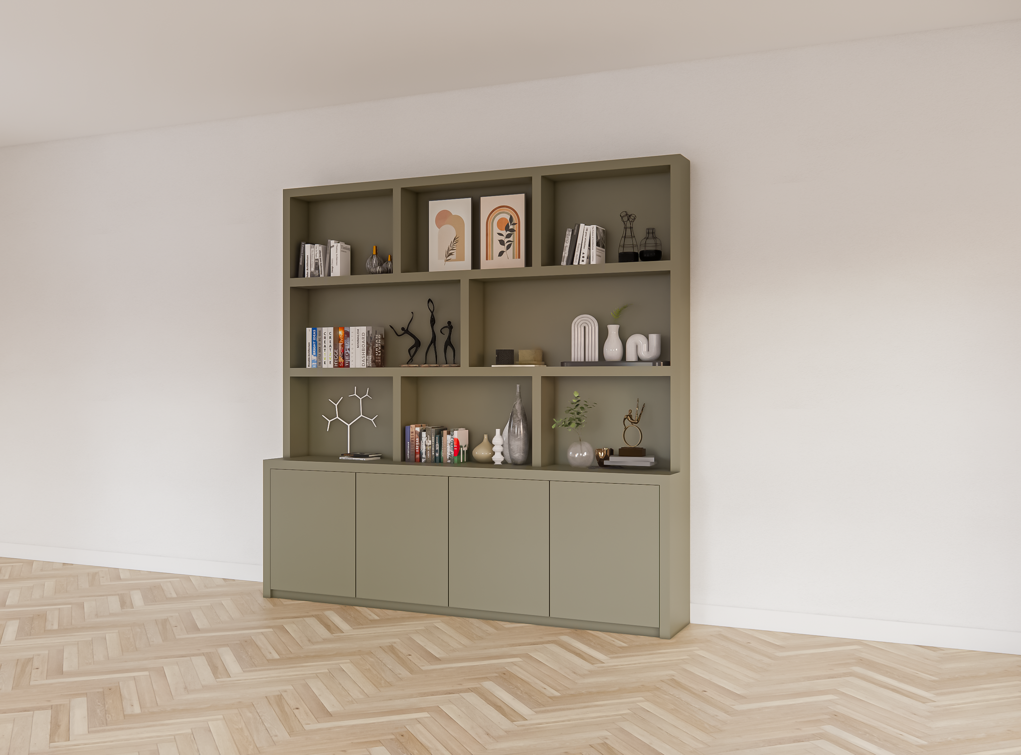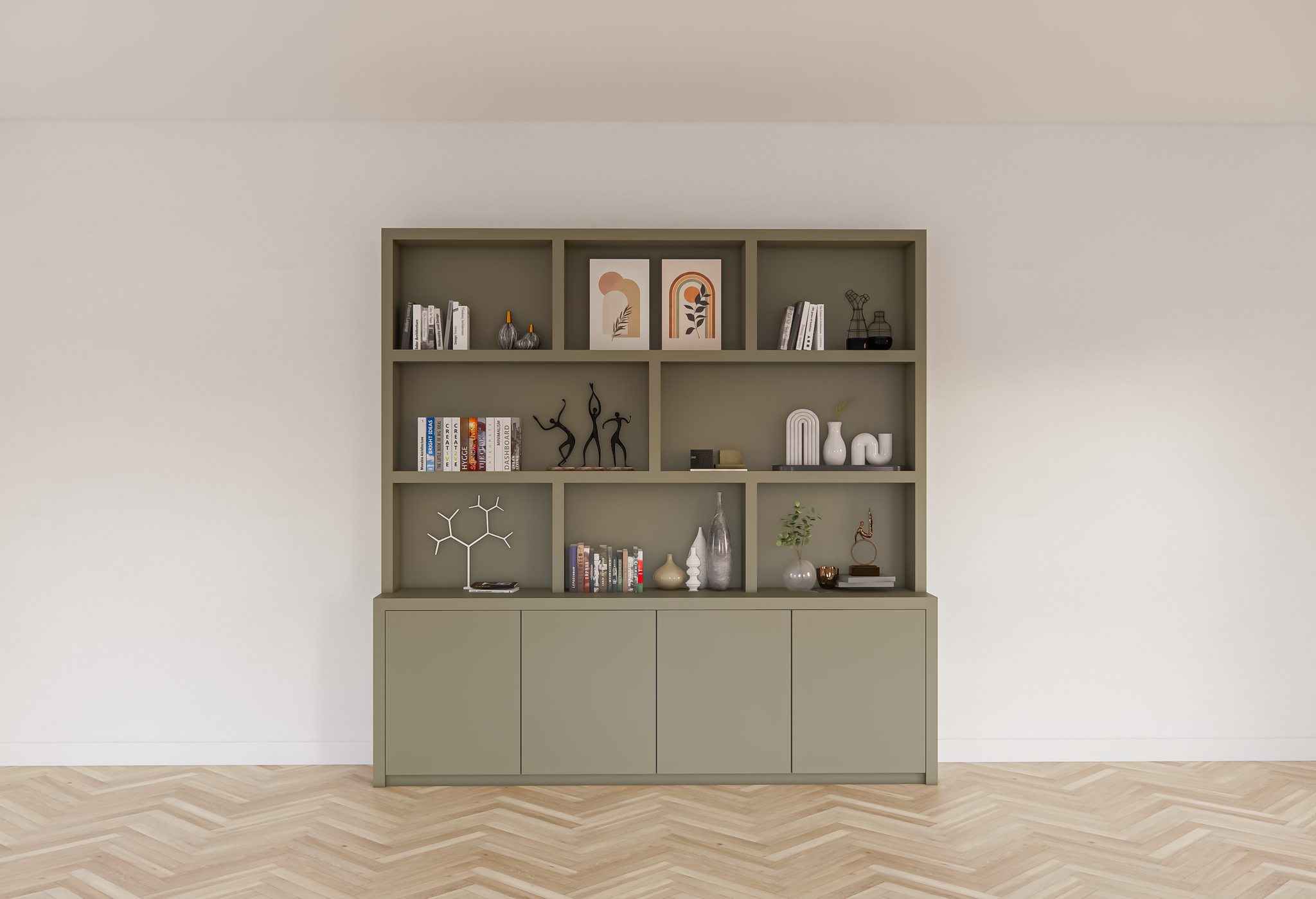 Der Schrank verfügt über Push-to-Open-Türen, die Griffe überflüssig machen und dem Design ein minimalistisches und modernes Aussehen verleihen, aber dennoch einen einfachen Zugang zu Ihrem Stauraum ermöglichen. Die offenen Fächer sind ideal, um Bücher, Kunstobjekte, Dekorationen oder andere persönliche Gegenstände zu präsentieren. Die Einlegeböden haben eine robuste Stärke von 5 cm, die nicht nur für zusätzliche Festigkeit sorgt, sondern auch zum robusten und luxuriösen Aussehen des Schranks beiträgt.
