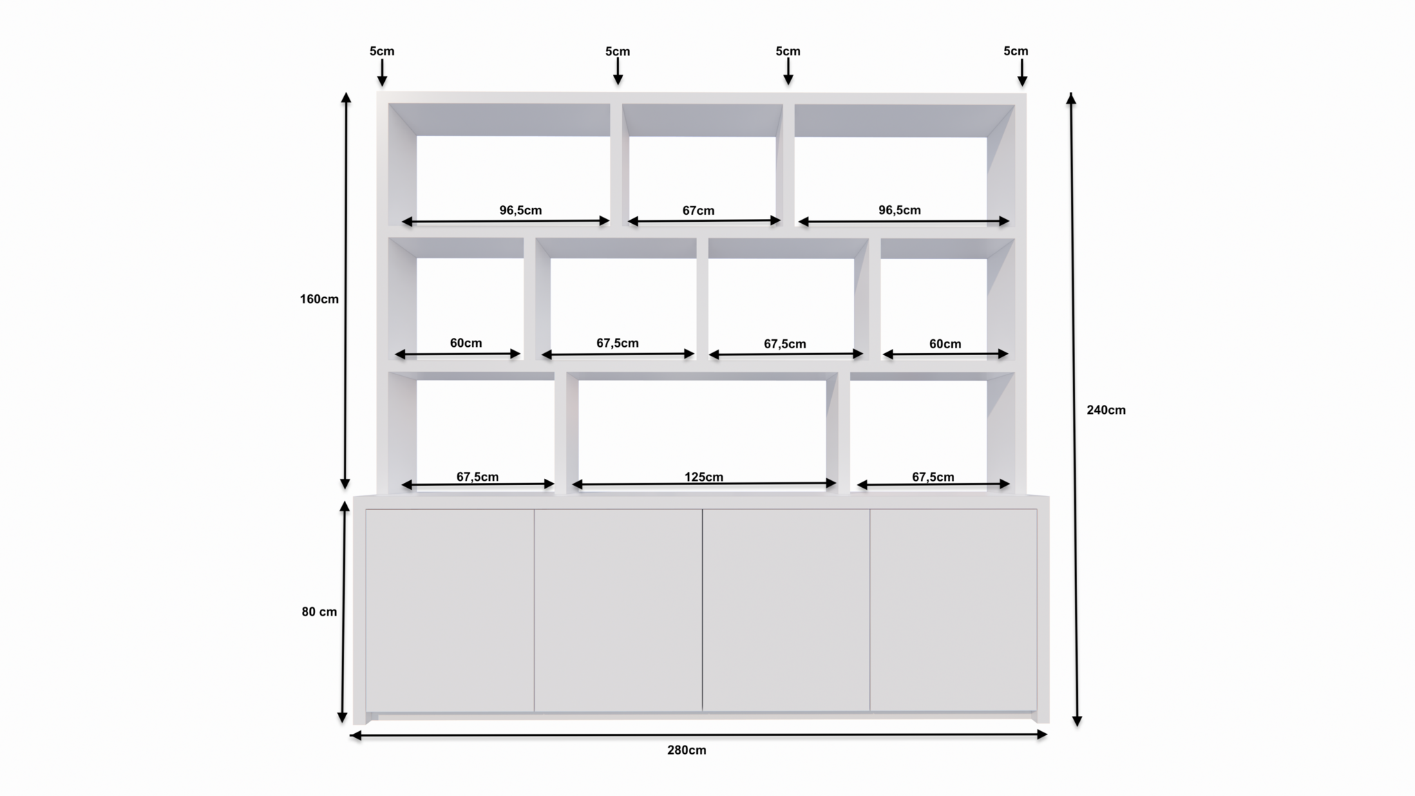 Fächerschrank Corsica - 280x20/40x240H cm - 5cm Fachbodenstärke - push-to-open Türen - offene Fächer - ohne Rückwand - schlichte Ausführung