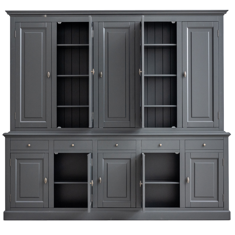 Ein breites Sideboard mit geschlossenen Türen? Das ist das Landhaus-Sideboard Santa Maria! Mit 5 geschlossenen Türen im oberen Bereich bietet diese Anrichte viel Stauraum. Die Einlegeböden hinter den Türen sind verstellbar und können auf die gewünschte Höhe eingestellt werden. So können Sie den Platz optimal ausnutzen. Das Sideboard hat außerdem 5 Schubladen, die auf einer luxuriösen Soft-Close-Schiene laufen. Bestellen Sie es in einer beliebigen RAL-Farbe. Dieses Sideboard wartet auf Sie!