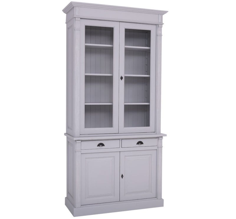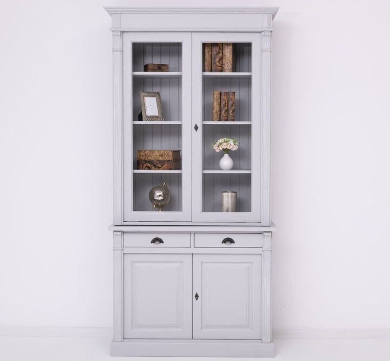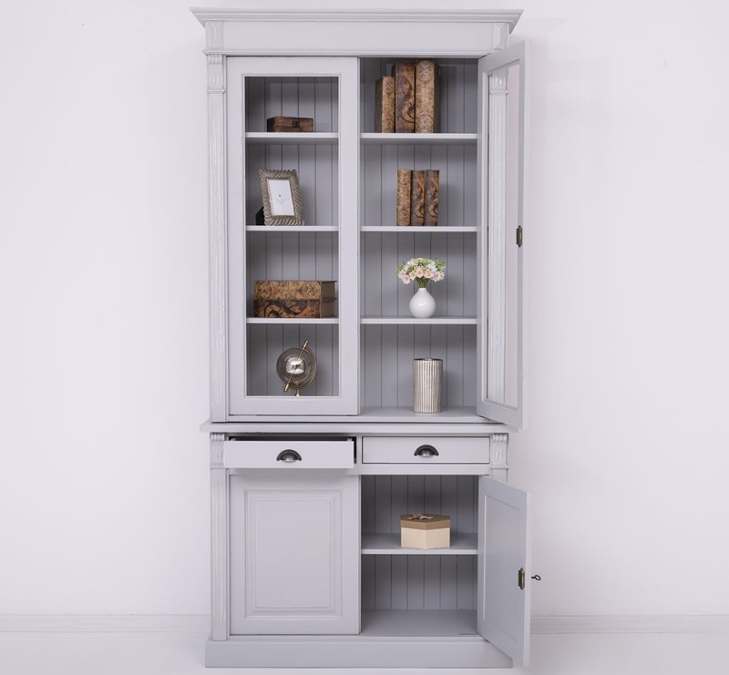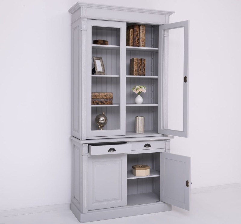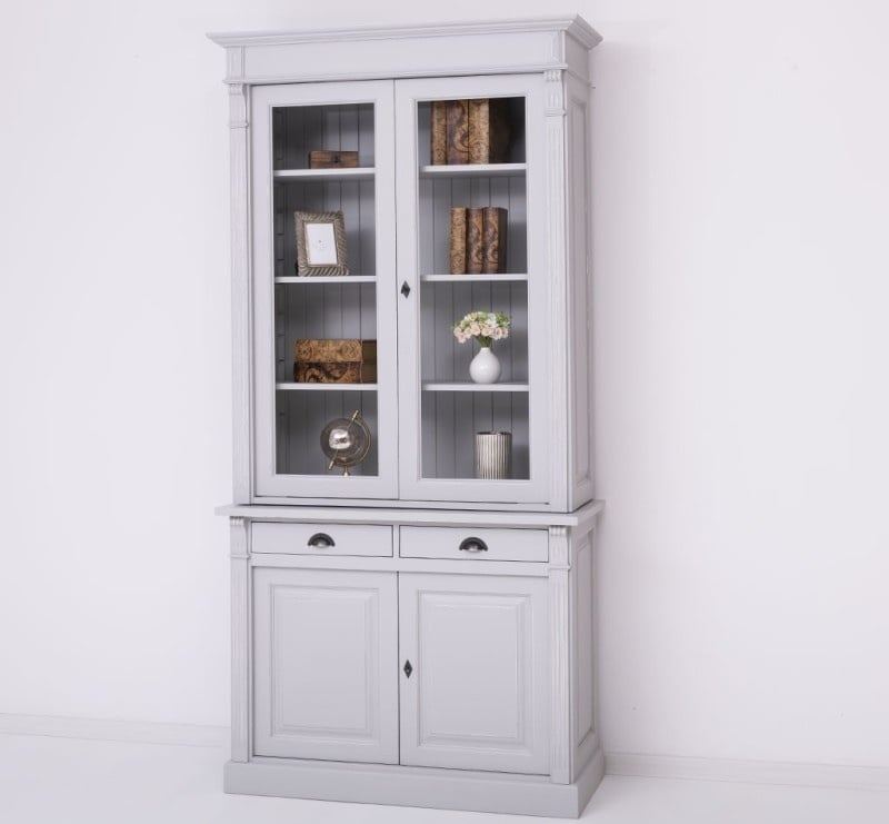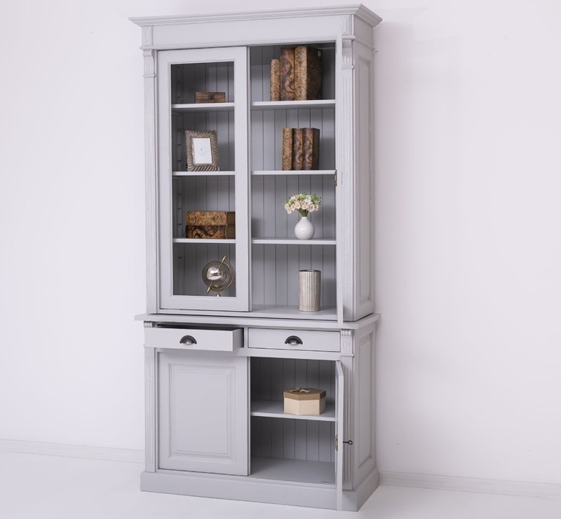 Der obere Schrank verfügt über elegante Viteline-Türen, die es Ihnen ermöglichen, Ihr feinstes Geschirr, Ihre Gläser oder Dekorationen schön zu präsentieren. Der Unterschrank mit versiegelten Türen und praktischen Schubladen bietet Ihnen zusätzlichen Platz, um Dinge ordentlich und außer Sichtweite zu verstauen.