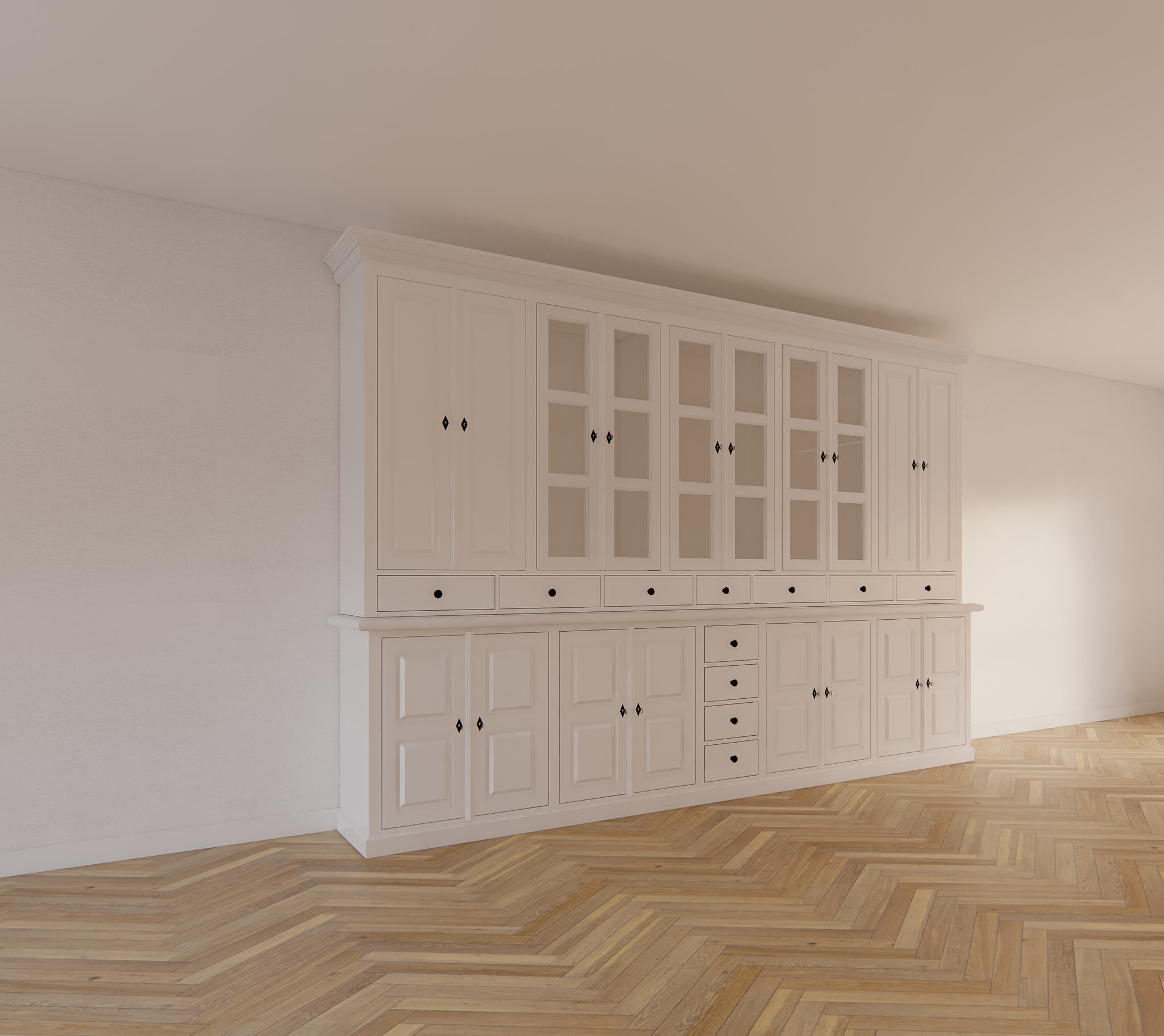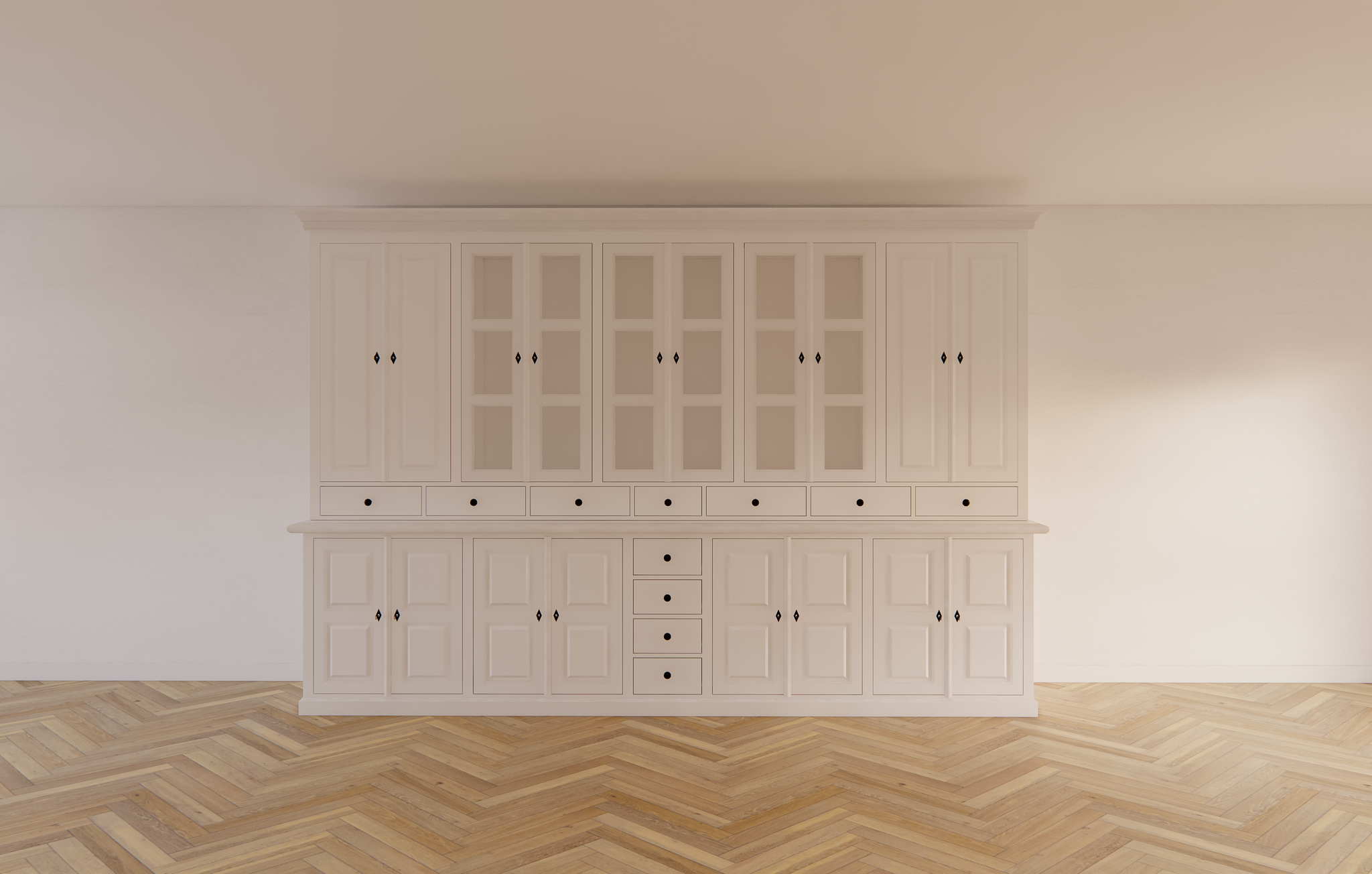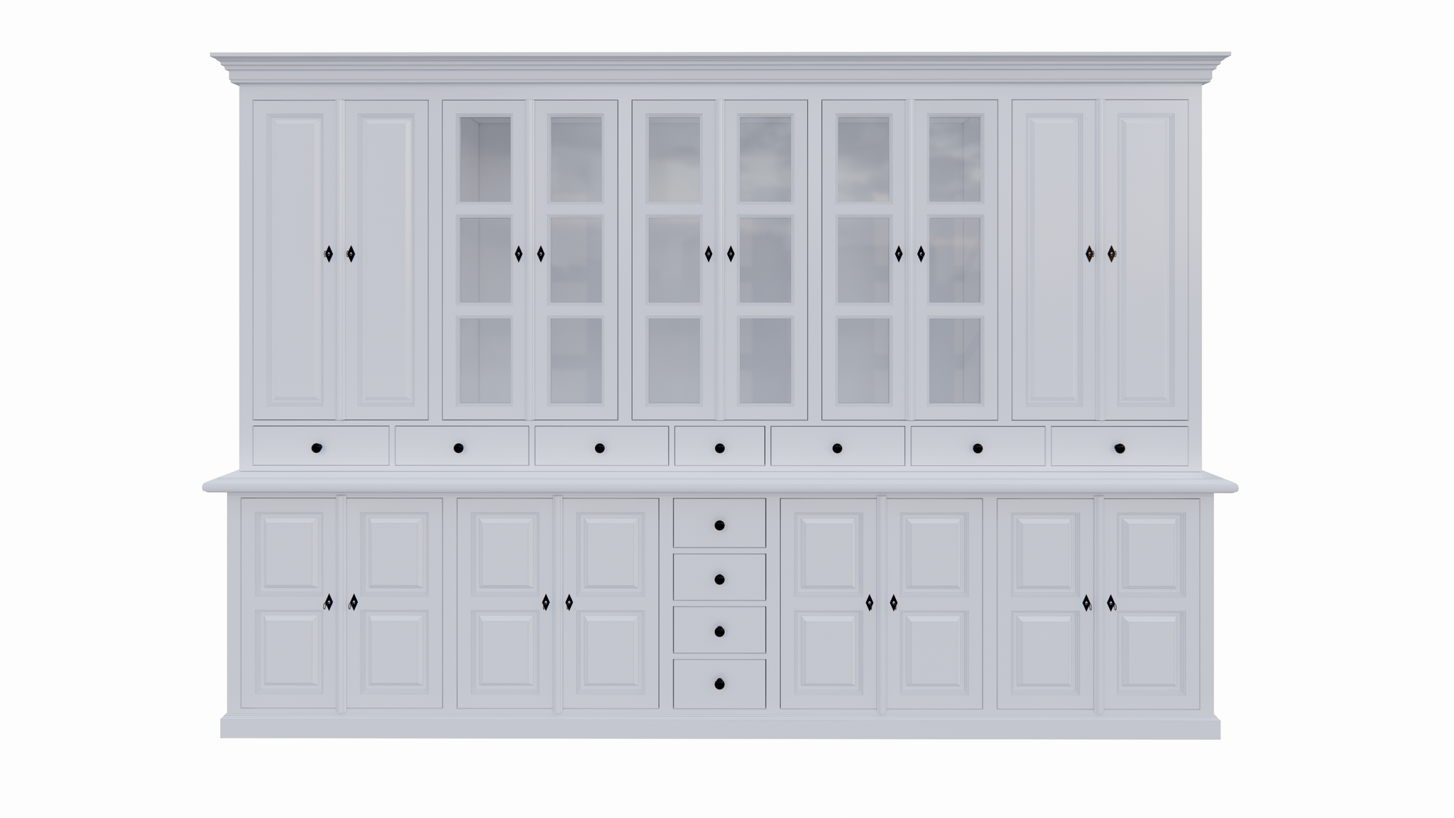 Der Oberschrank ist mit einer Kombination aus Vitrinen und geschlossenen Türen ausgestattet. Die Glastüren bieten Platz, um Geschirr, Gläser oder Deko-Objekte schön sichtbar zu präsentieren. Die geschlossenen Türen sorgen für ein ruhiges Gleichgewicht des Ganzen und ermöglichen auch die ordentliche Aufbewahrung von nicht-dekorativen Gegenständen.