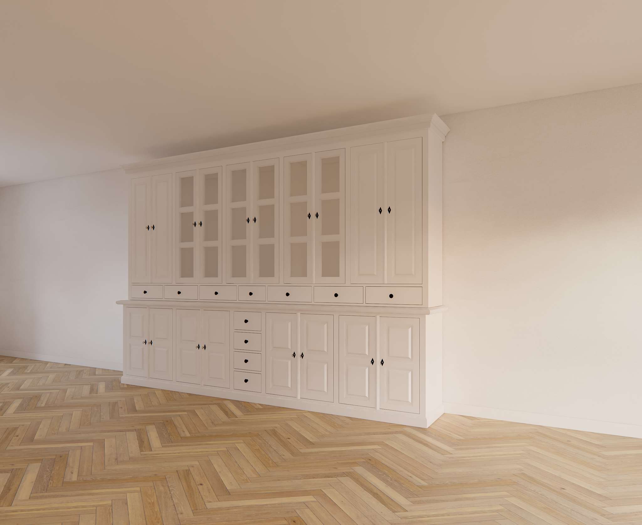 Der Schrank ist komplett aus hochwertigen Materialien gefertigt und kann in jeder RAL- oder NCS-Farbe lackiert werden. Auch eine individuelle Gestaltung ist möglich: Sowohl der Grundriss als auch die Abmessungen können an Ihre Räumlichkeiten und Bedürfnisse angepasst werden.