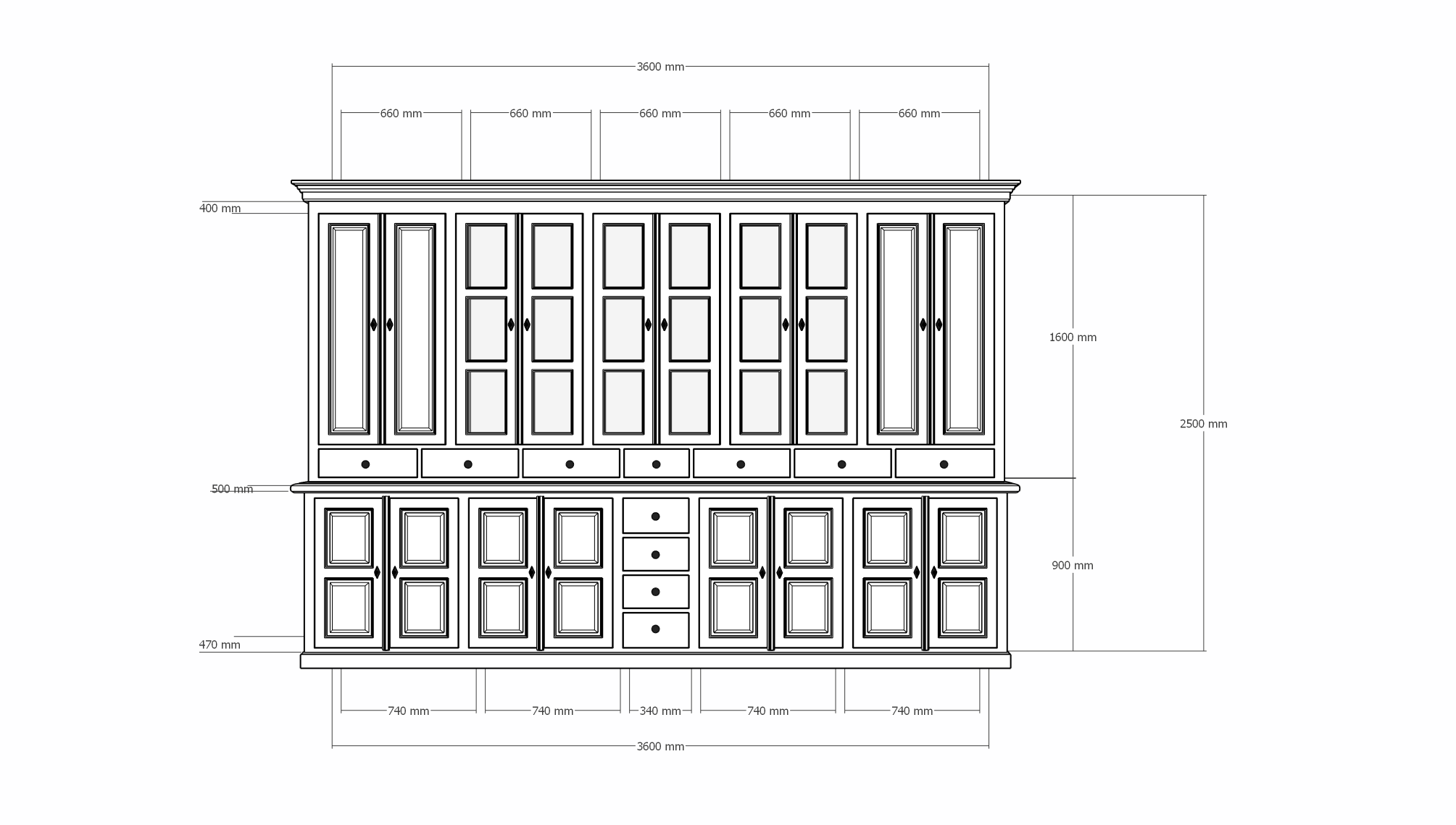 Der Buffetschrank Bursa ist ein großzügiges und klassisch gestaltetes Möbelstück mit einer beeindruckenden Größe und einer reichen Optik. Mit einer Breite von 360 cm, einer Tiefe von 50 cm und einer Höhe von 250 cm ist dies ein Schrank, der wirklich den Raum ausfüllt und gleichzeitig Ruhe, Übersicht und Funktionalität bietet.