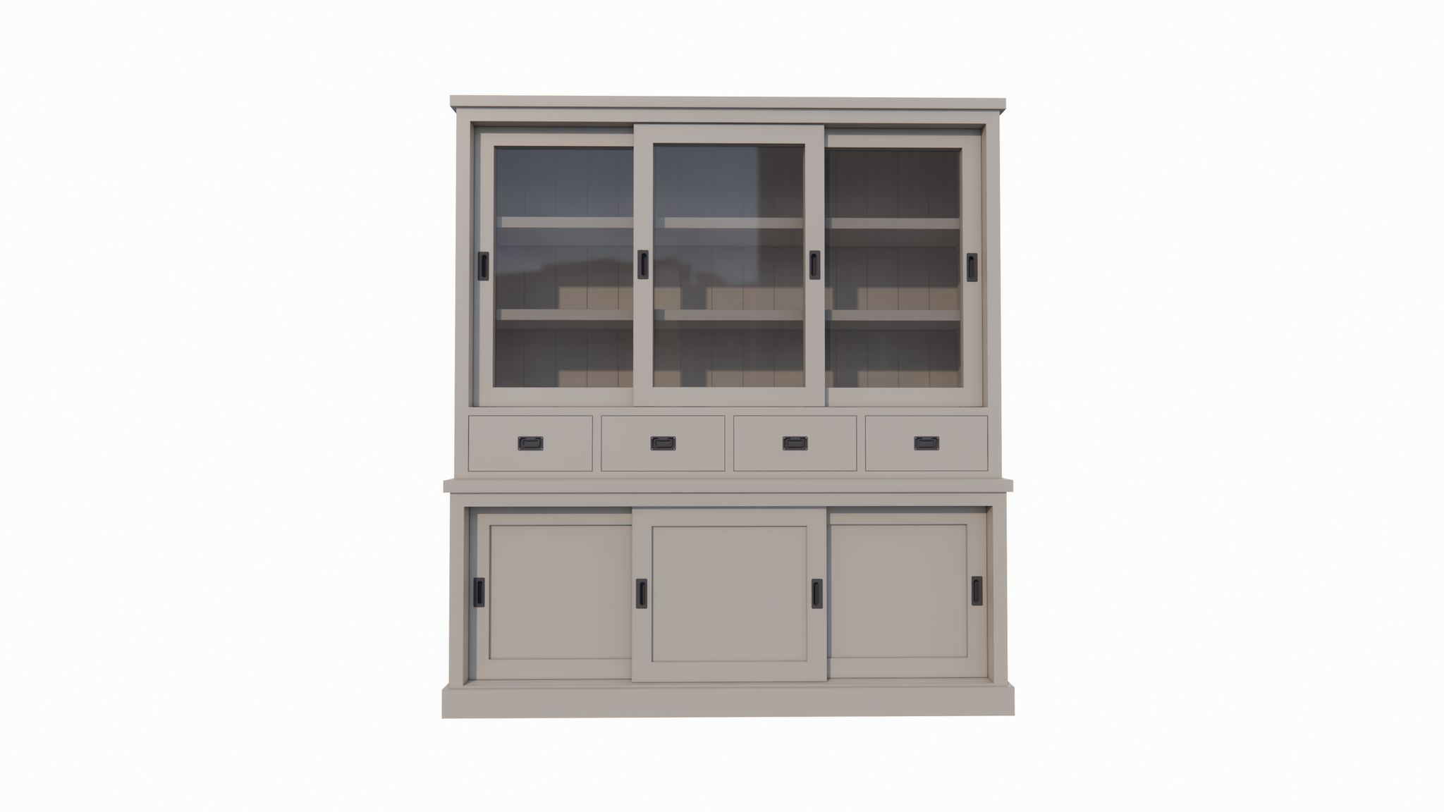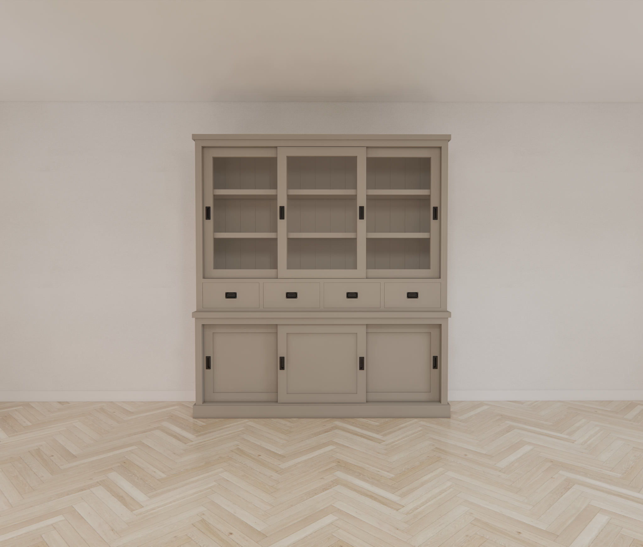 >Der Schrank verfügt über 3 Glasschiebetüren, die es Ihnen ermöglichen, Ihr schönstes Geschirr oder Ihre Dekorationen stilvoll zu präsentieren. Außerdem verfügt der Schrank über 4 Schubladen mit Soft-Close und 3 geschlossene Schiebetüren für zusätzlichen Stauraum. Durch die Verwendung von Soft-Close-Schubladen und -Türen schließt der Schrank leise und sanft.