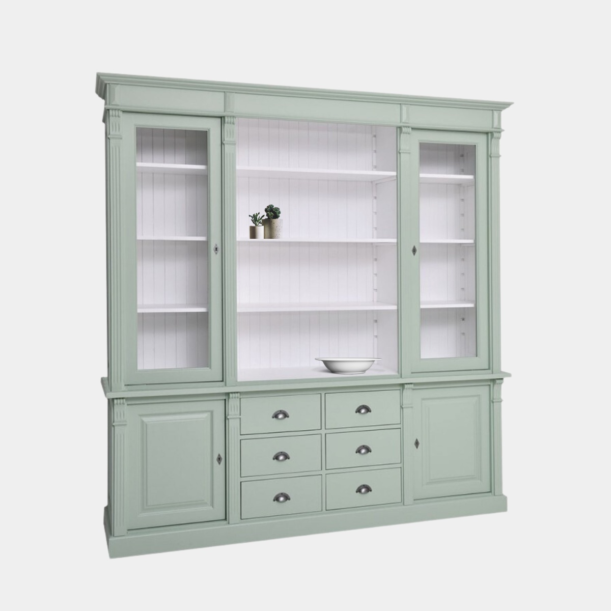 Entdecken Sie die vielseitige Eleganz des Buffet/Bücherschrank Edinburgh - 225x50x230H cm. Dieser Schrank kombiniert Funktionalität mit Stil und bietet eine schöne Lösung für die Aufbewahrung und Präsentation in jedem Raum. Die beiden Vitrinentüren ermöglichen es Ihnen, Ihre Lieblingsstücke auszustellen, während das offene Fach und die verstellbaren Einlegeböden Flexibilität für eine organisierte Aufbewahrung bieten. Außerdem gibt es zwei geschlossene Türen und sechs Schubladen mit Soft-Close-Funktion für die diskrete Aufbewahrung von anderen wichtigen Dingen. Das charmante rustikale Finish verleiht Ihrer Einrichtung eine warme Note und macht den Schrank sowohl funktional als auch ästhetisch ansprechend. Das Edinburgh Buffet/Bücherregal ist in allen RAL- und NCS-Farben erhältlich und kann individuell gestaltet werden, so dass Sie den Schrank an Ihre persönlichen Vorlieben und Ihren Einrichtungsstil anpassen können. Verleihen Sie Ihrem Zuhause mit dem Buffet/Bücherregal Edinburgh einen Hauch von zeitloser Klasse und genießen Sie die perfekte Kombination aus praktischem Nutzen und raffiniertem Aussehen.