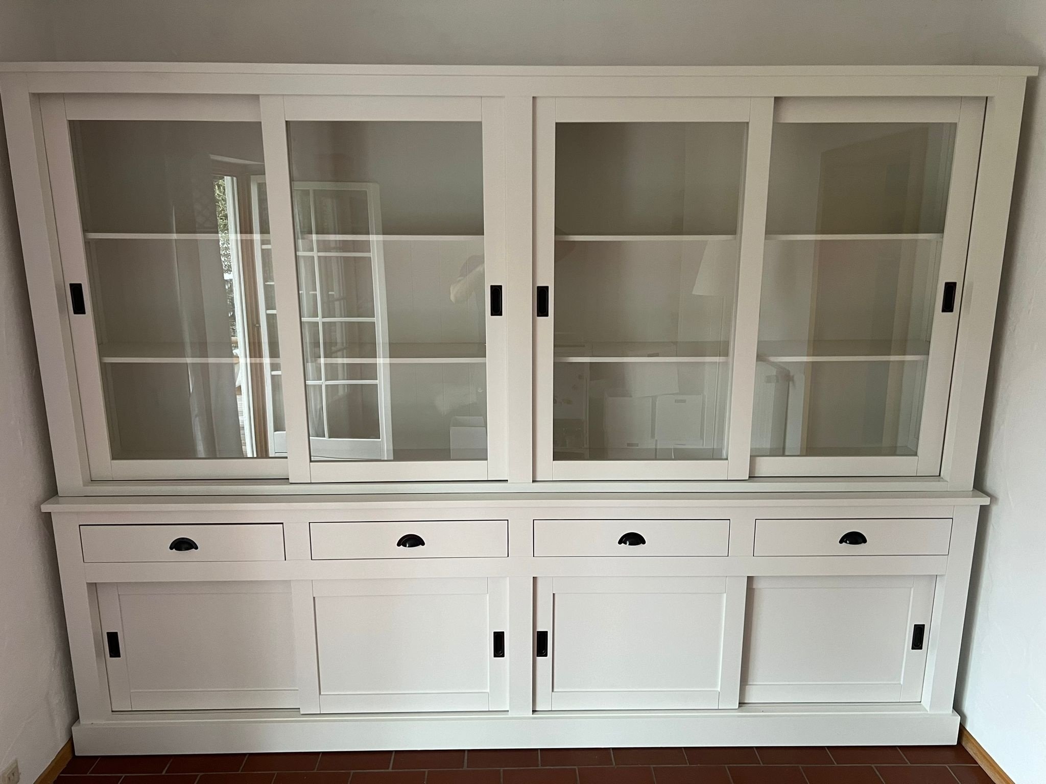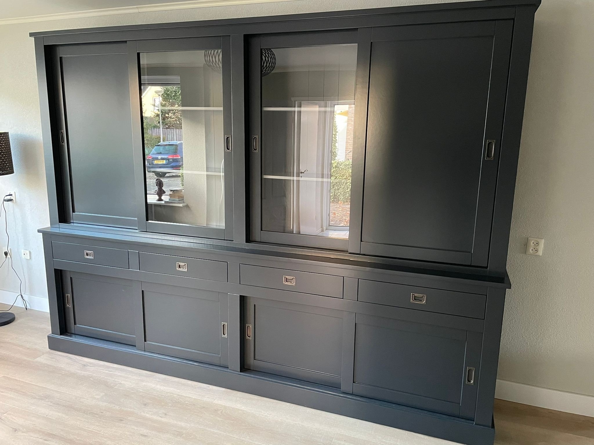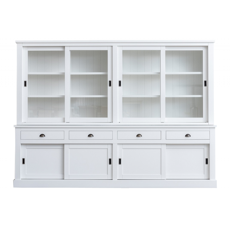 Sind Sie auf der Suche nach einem außergewöhnlichen Schrank? Hören Sie auf zu suchen und lernen Sie den Vitrinenschrank Canada kennen. Hergestellt aus feinstem Holz und zu einem hohen Standard verarbeitet. Die Vitrine verfügt über insgesamt 8 Schiebetüren, die reibungslos über eine Aluminiumschiene gleiten. Die 4 großen Schubladen laufen mit einem Soft-Close-System. Diese Vitrine bietet genügend Stauraum für Ihr Geschirr und andere Gegenstände. Bestellen Sie die Vitrine Canada in der RAL-Farbe Ihrer Wahl.