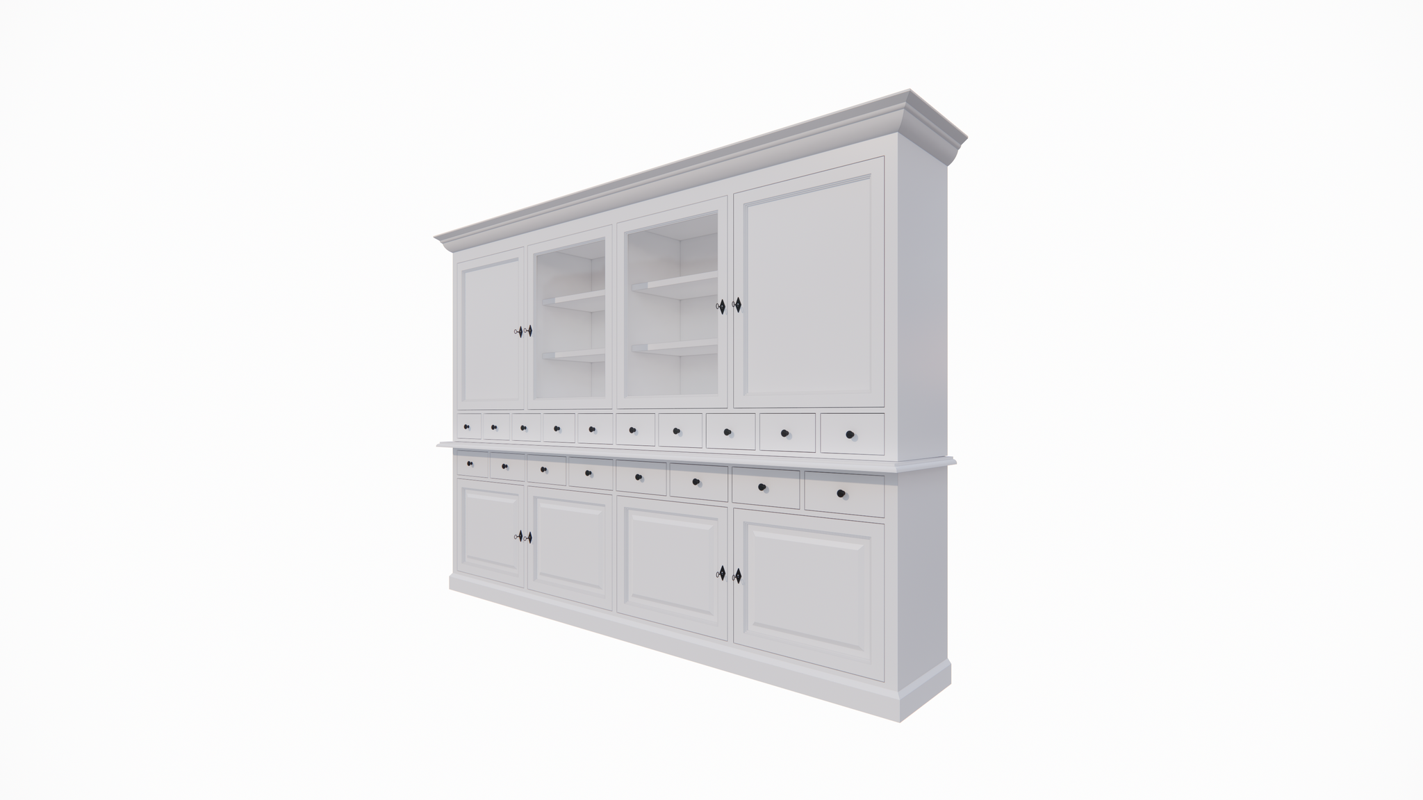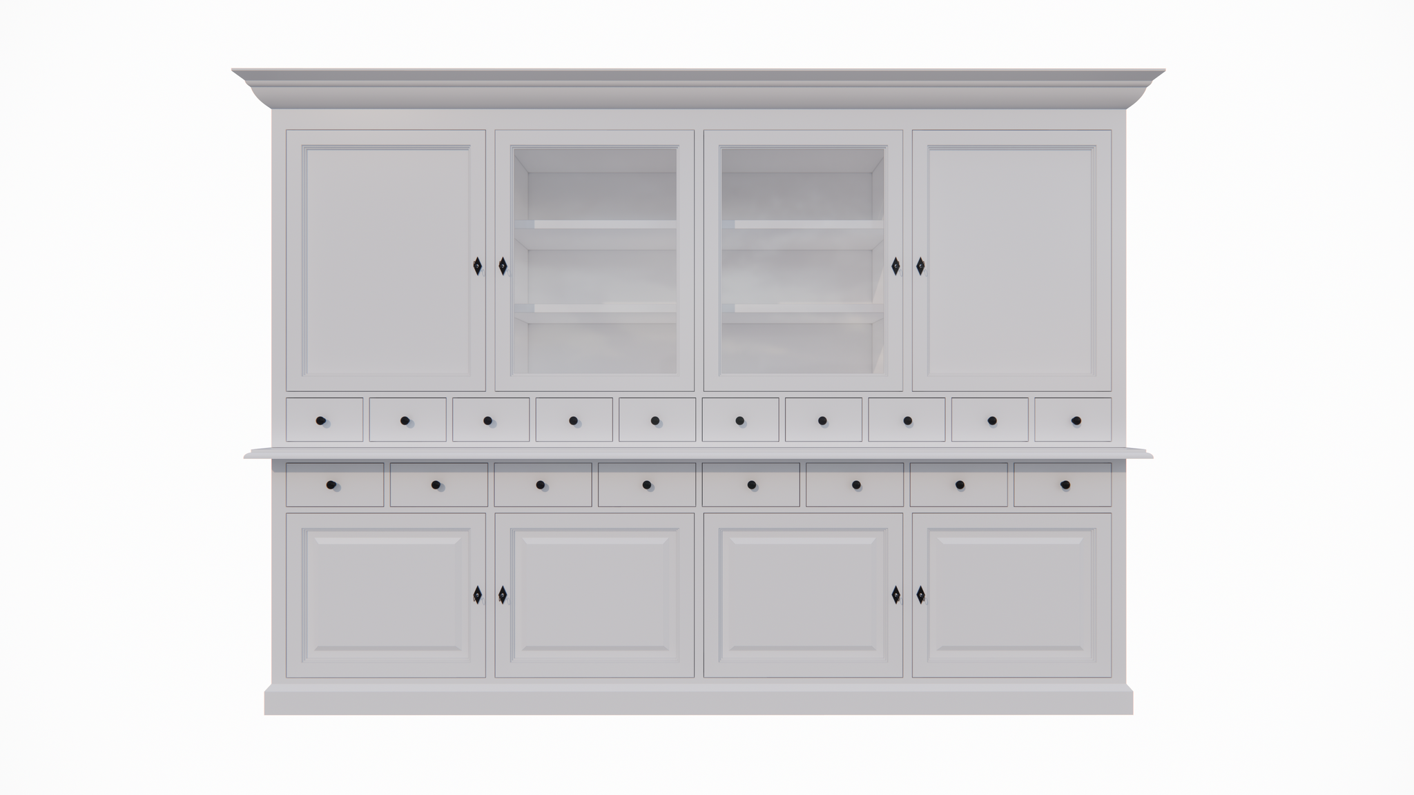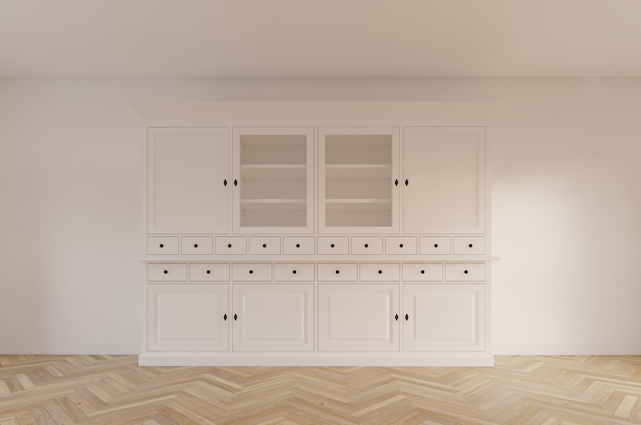 Der Schrank besteht aus einem Unterschrank mit klassischen Flügeltüren, einer doppelten Reihe von geräumigen Schubladen und einem Oberschrank mit geschlossenen und Glastüren. Diese Kombination bietet viel Stauraum und lässt gleichzeitig Platz, um Lieblingsstücke oder Geschirr zu präsentieren.