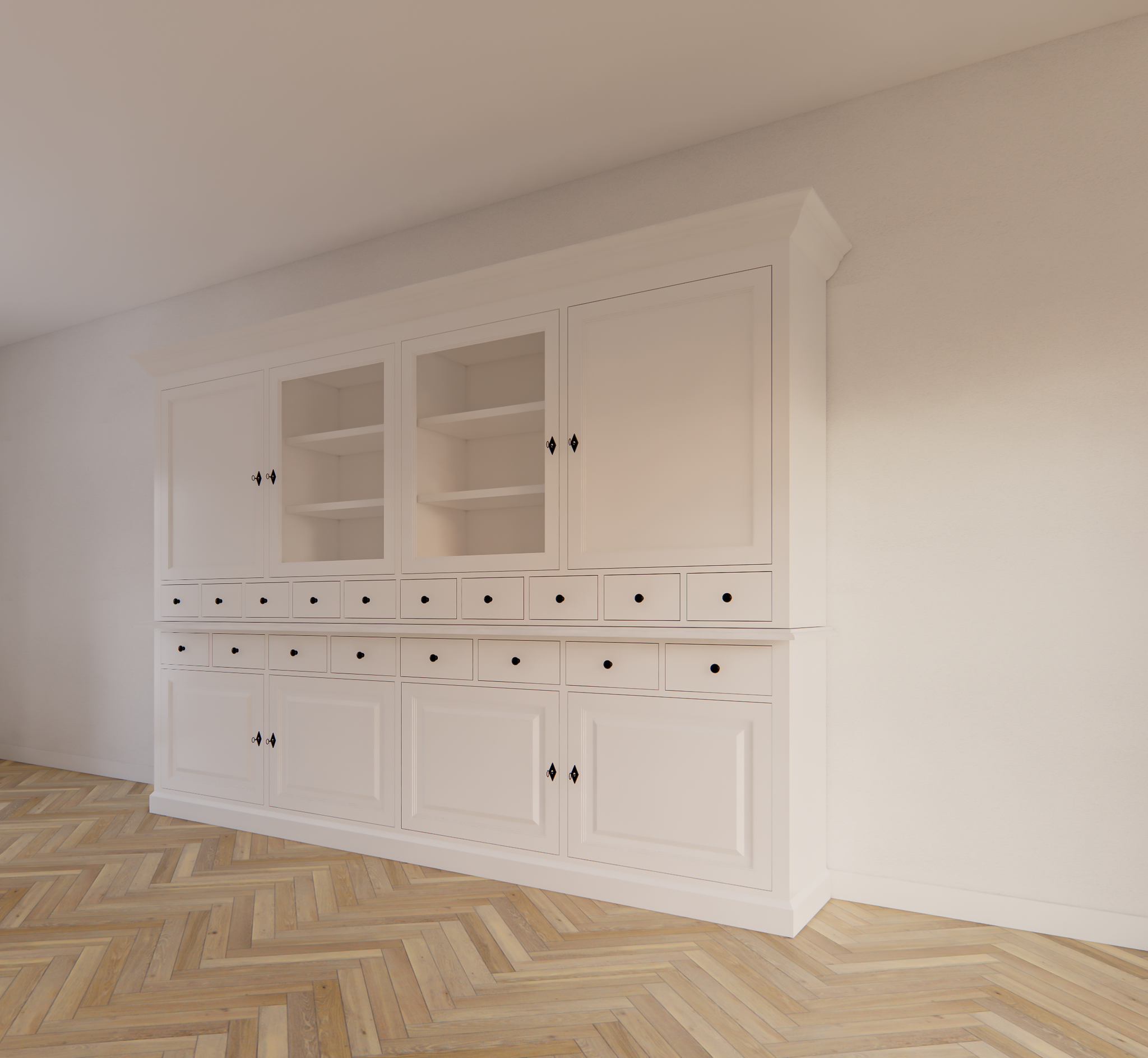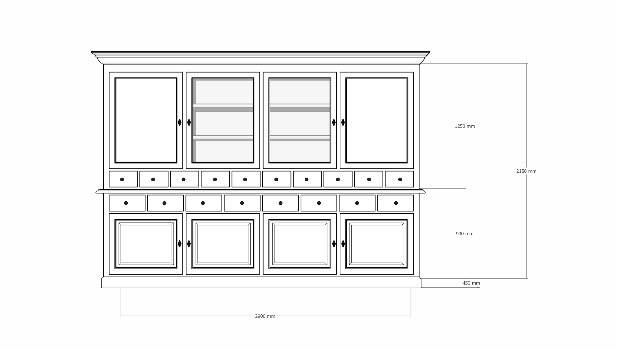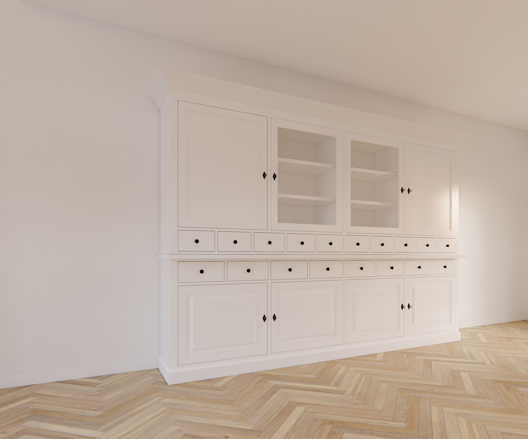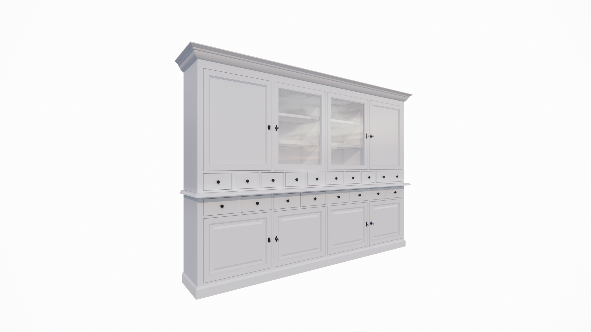 Der Schrank besteht aus einem Unterschrank mit klassischen Flügeltüren, einer doppelten Reihe von geräumigen Schubladen und einem Oberschrank mit geschlossenen und Glastüren. Diese Kombination bietet viel Stauraum und lässt gleichzeitig Platz, um Lieblingsstücke oder Geschirr zu präsentieren.