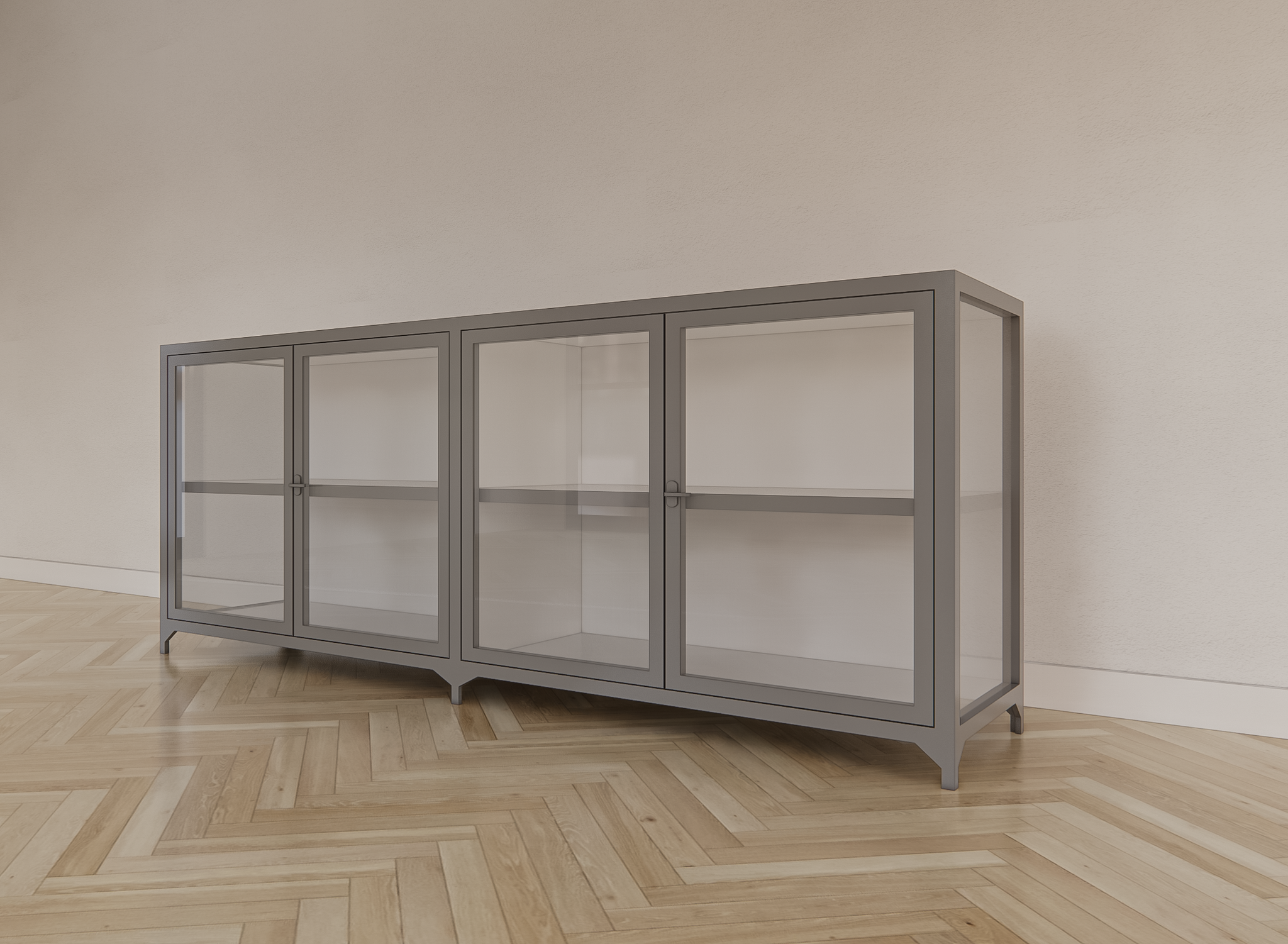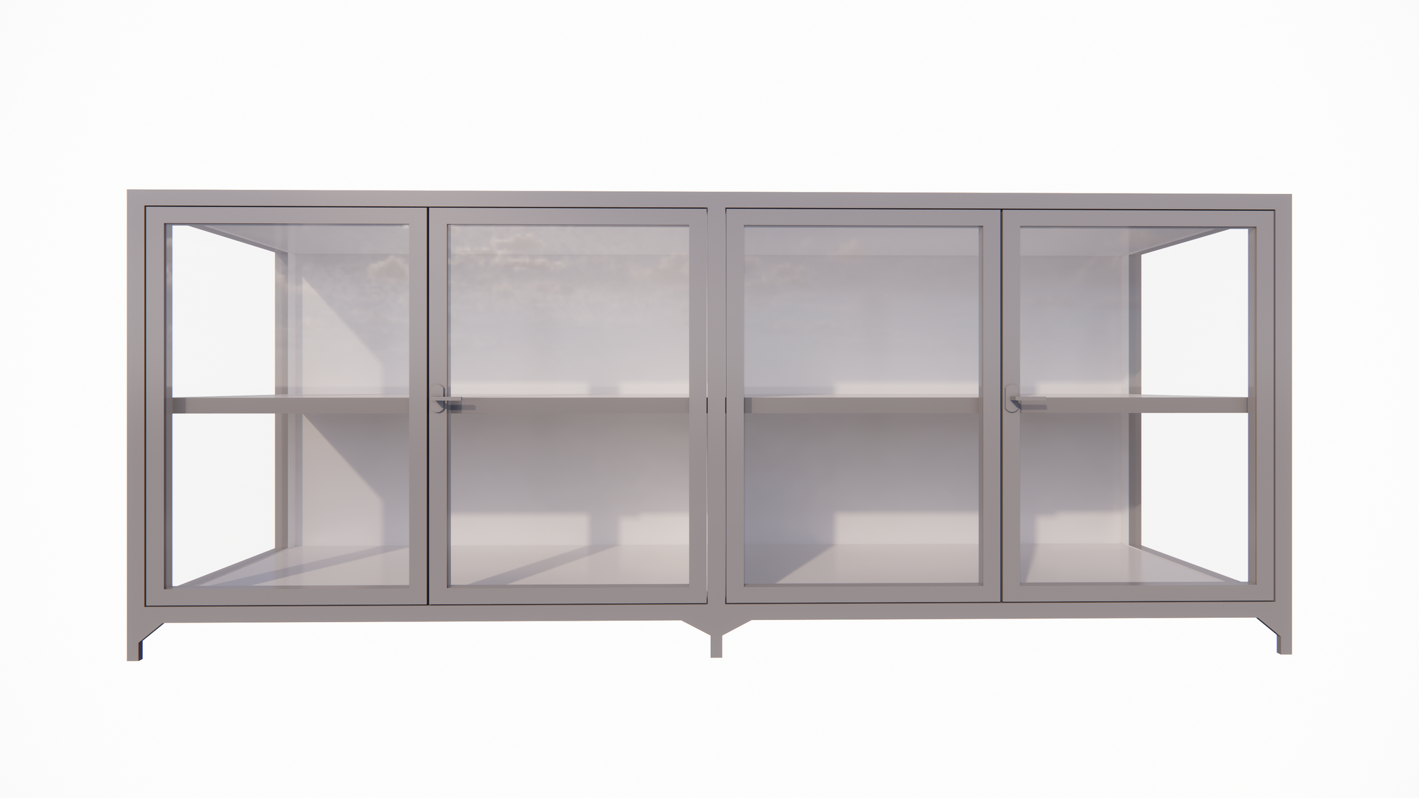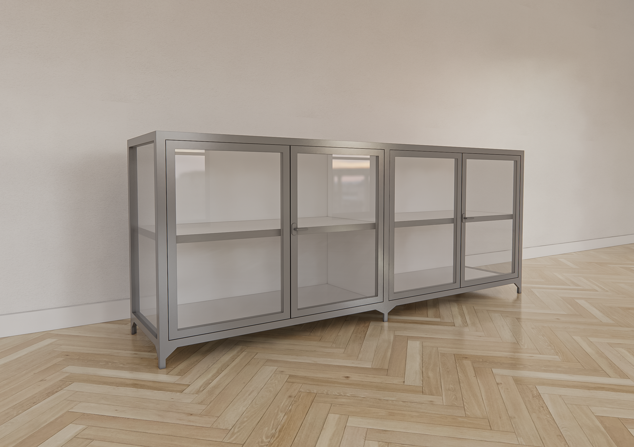 >Mit den Maßen 200x45x80H cm bietet das Belo Sideboard/Regal reichlich Platz zum Aufbewahren und Ausstellen, egal ob im Wohnzimmer, in der Küche oder im Einzelhandel. Die vier Flügeltüren ermöglichen einen einfachen Zugriff auf den Inhalt, während das Ganzglasdesign ein leichtes und luftiges Gefühl erzeugt.