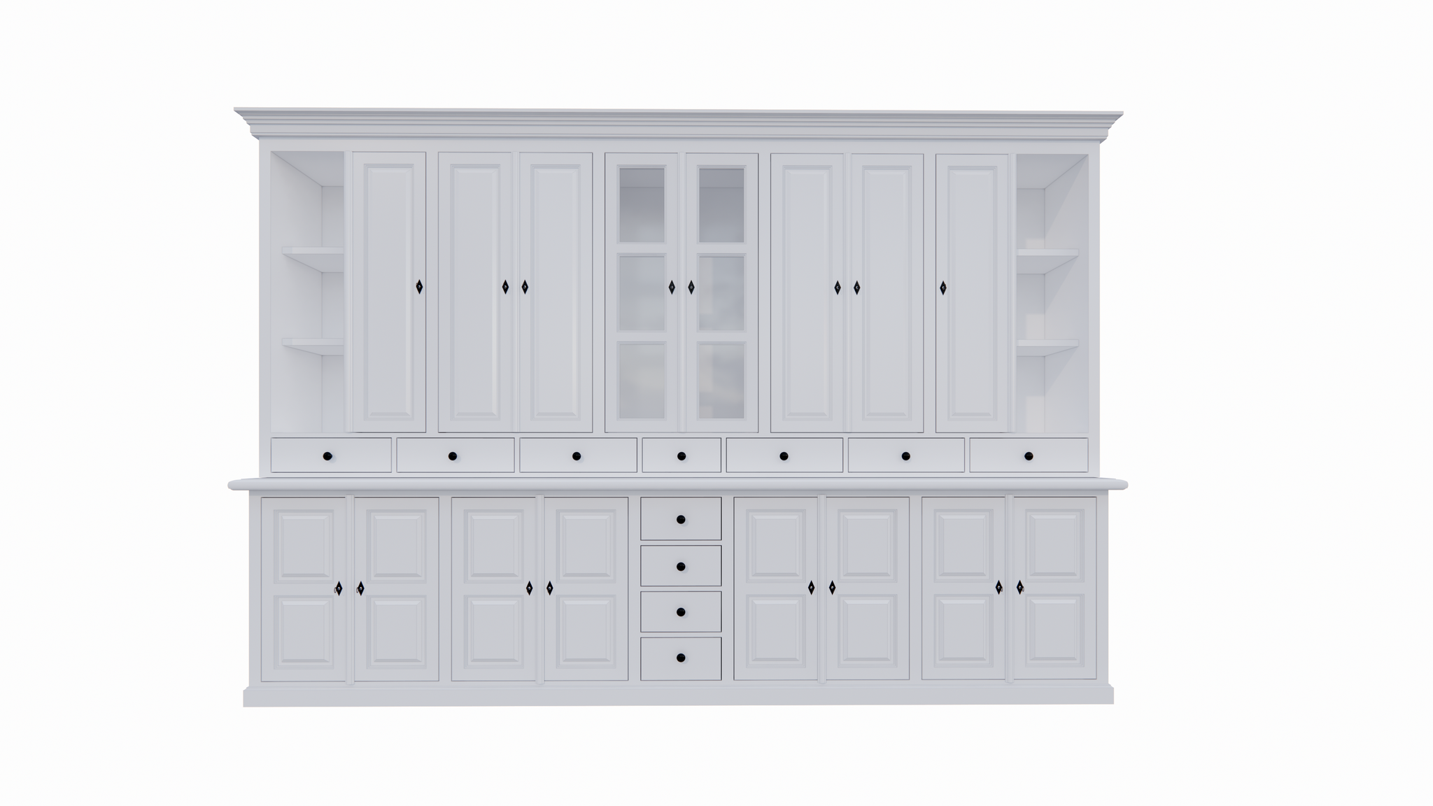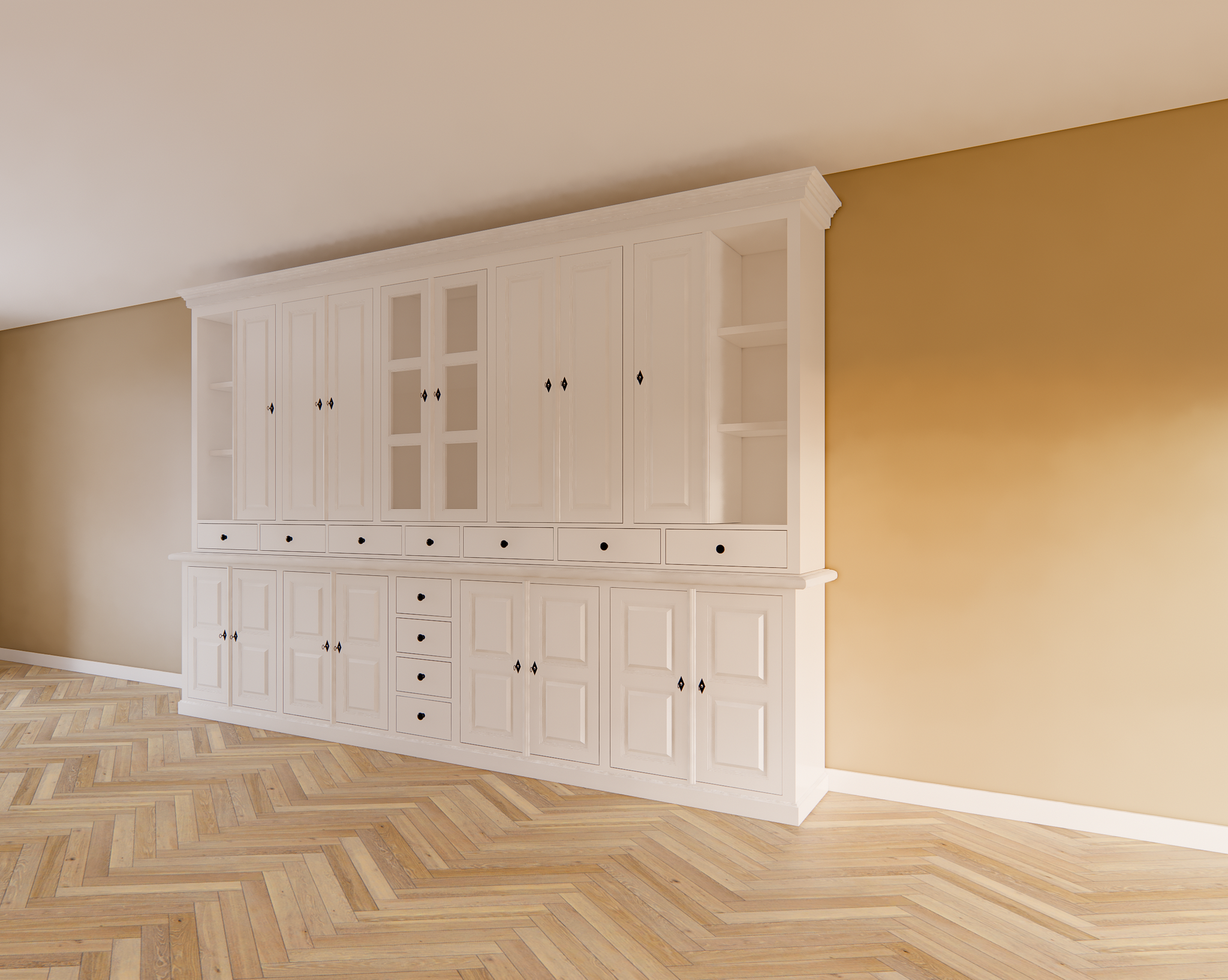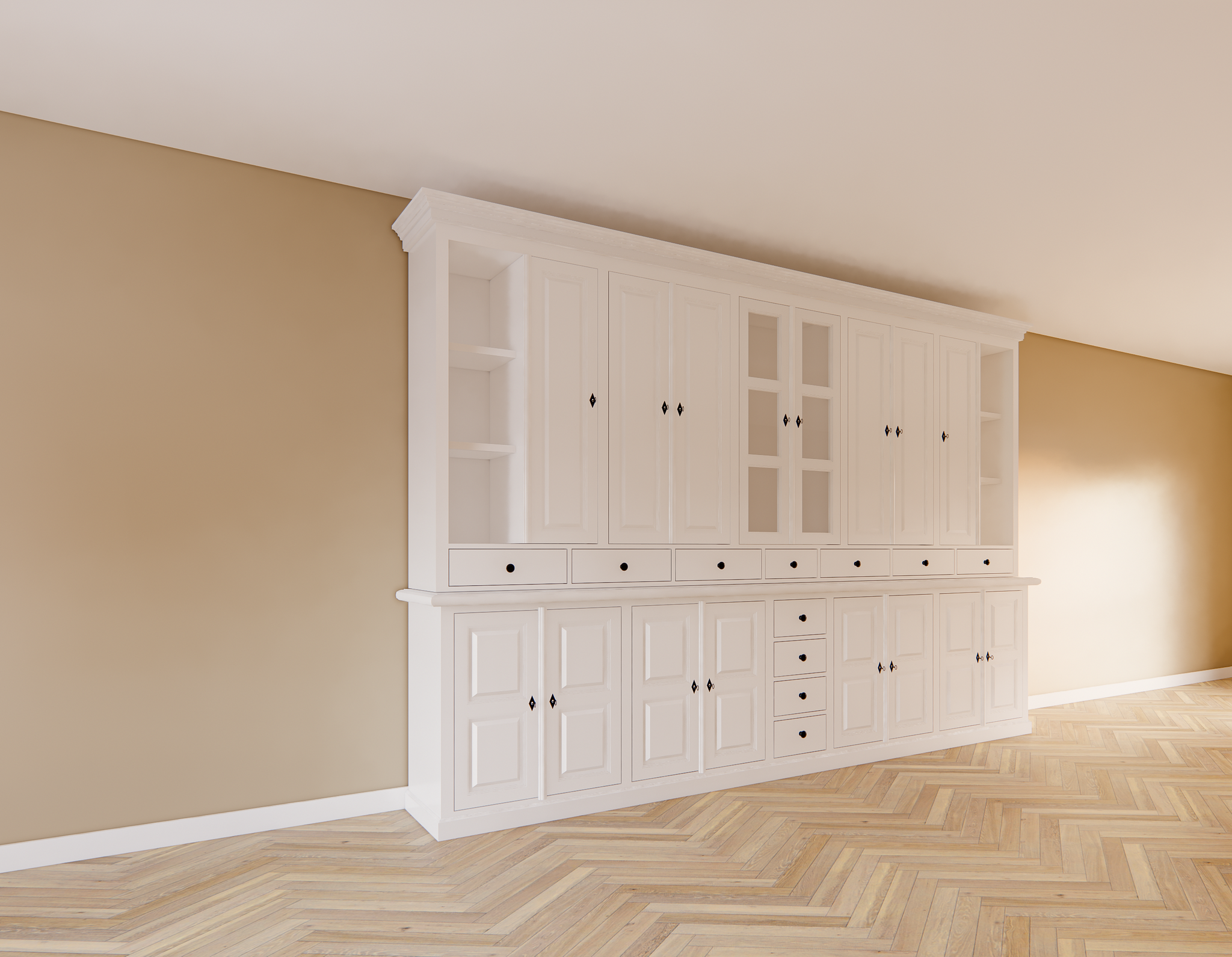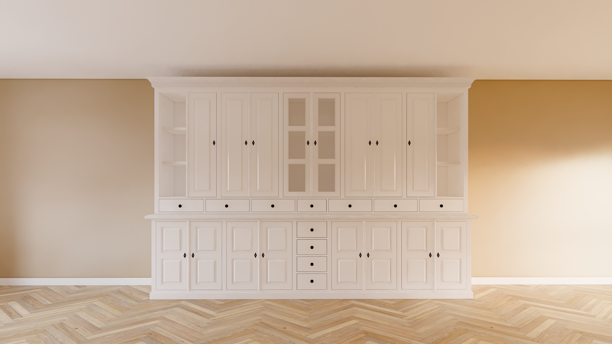 Der Schrank besteht aus drei Elementen: geschlossene Unterschränke mit vertäfelten Türen, eine breite Schubladenreihe und ein Oberschrank mit einem Wechsel von geschlossenen Türen, Schranktüren und offenen Einlegeböden. Durch diese Aufteilung ist der Schrank nicht nur vielseitig einsetzbar, sondern auch ästhetisch sehr ausgewogen. Die Glastüren bieten Platz, um Geschirr oder Dekoration sichtbar zu präsentieren, während die geschlossenen Teile geschlossenen Stauraum bieten.