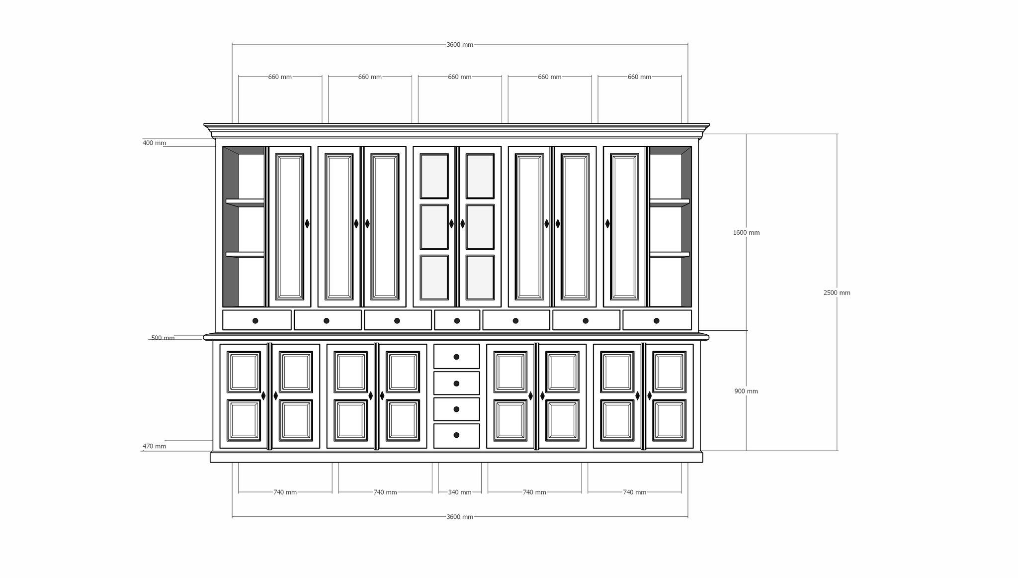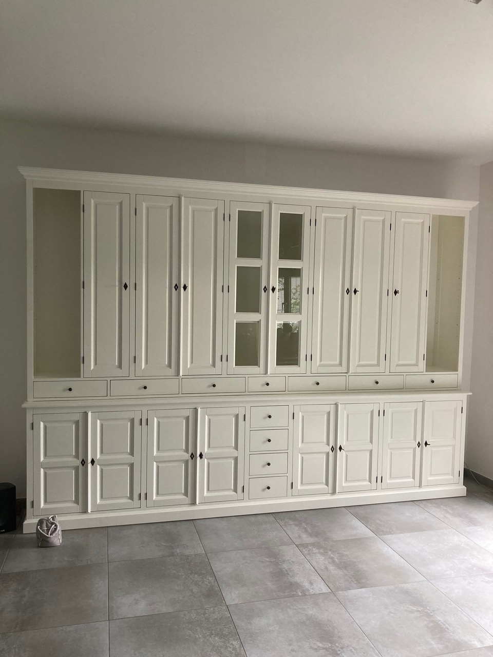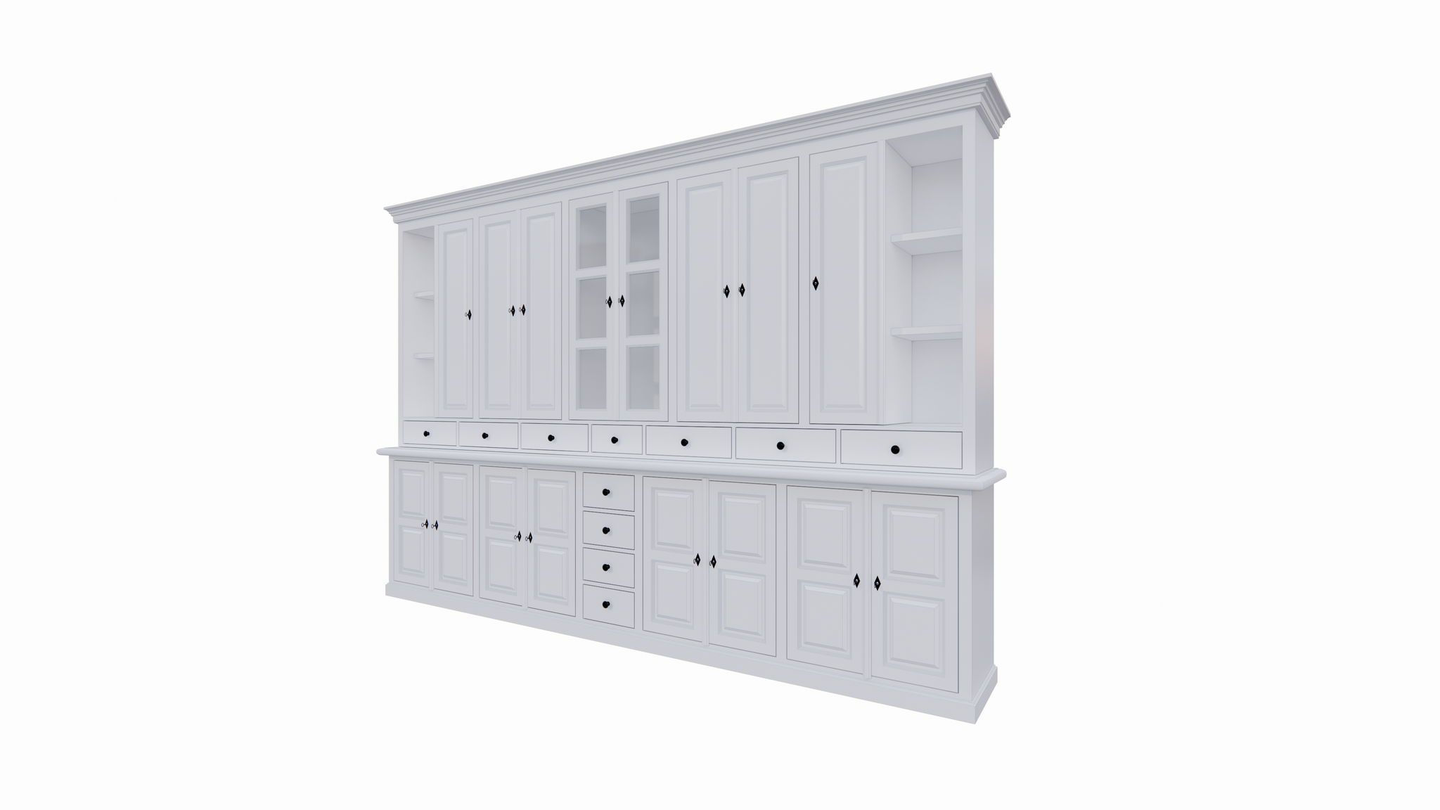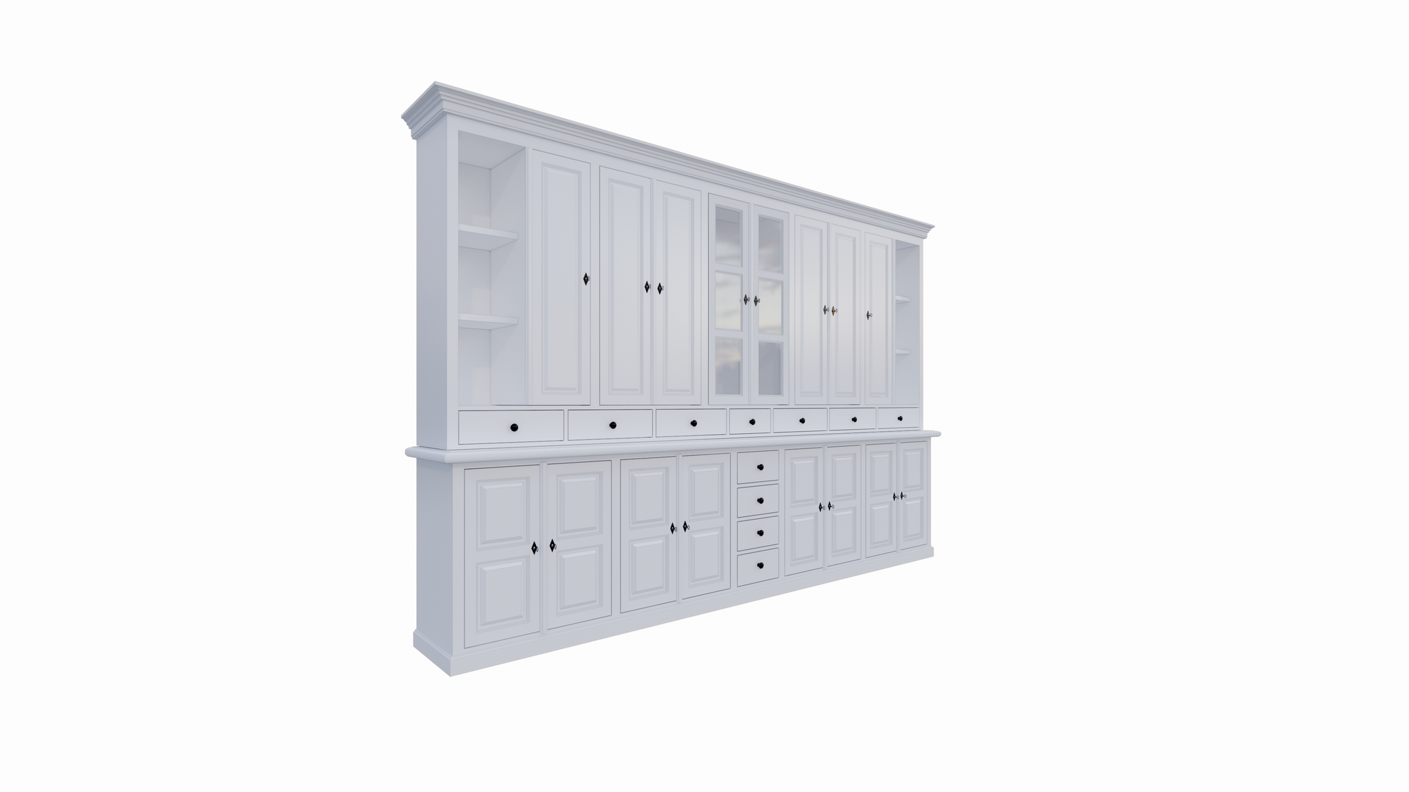 Der Schrank besteht aus drei Elementen: geschlossene Unterschränke mit vertäfelten Türen, eine breite Schubladenreihe und ein Oberschrank mit einem Wechsel von geschlossenen Türen, Schranktüren und offenen Einlegeböden. Durch diese Aufteilung ist der Schrank nicht nur vielseitig einsetzbar, sondern auch ästhetisch sehr ausgewogen. Die Glastüren bieten Platz, um Geschirr oder Dekoration sichtbar zu präsentieren, während die geschlossenen Teile geschlossenen Stauraum bieten.