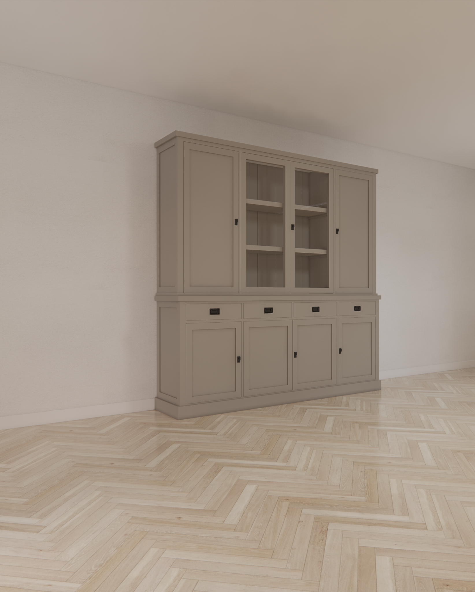 Entdecken Sie unser schönes Sideboard Vancouver! Mit den Maßen 220x45x220H cm bietet dieser Schrank viel Stauraum für all Ihre Dinge. Der obere Schrank hat 2 geschlossene Türen und 2 Vitrinentüren, während der untere Schrank über 4 geschlossene Türen und 4 Schubladen mit Soft-Close-Funktion verfügt. So können Sie Ihr Lieblingsgeschirr und andere Dinge ordentlich aufbewahren.