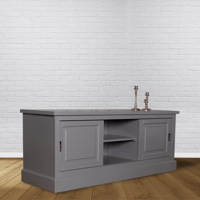 Mit dem TV-Schrank Avignon können Sie alle Ihre Mediengeräte außer Sichtweite aufbewahren. Dieses TV-Sideboard verfügt über 2 Schiebetüren und hat ein offenes Fach in der Mitte, in dem die Medienbox platziert werden kann. Die schöne obere Ablage bietet Platz für fast jeden Fernseher. Mit seinem ländlichen und charaktervollen Look ist der TV-Schrank Avignon ein Stimmungsmacher in Ihrem Zuhause. Wählen Sie eine graue oder braune strukturierte Platte und bestellen Sie diesen TV-Schrank in einer RAL-Farbe Ihrer Wahl!