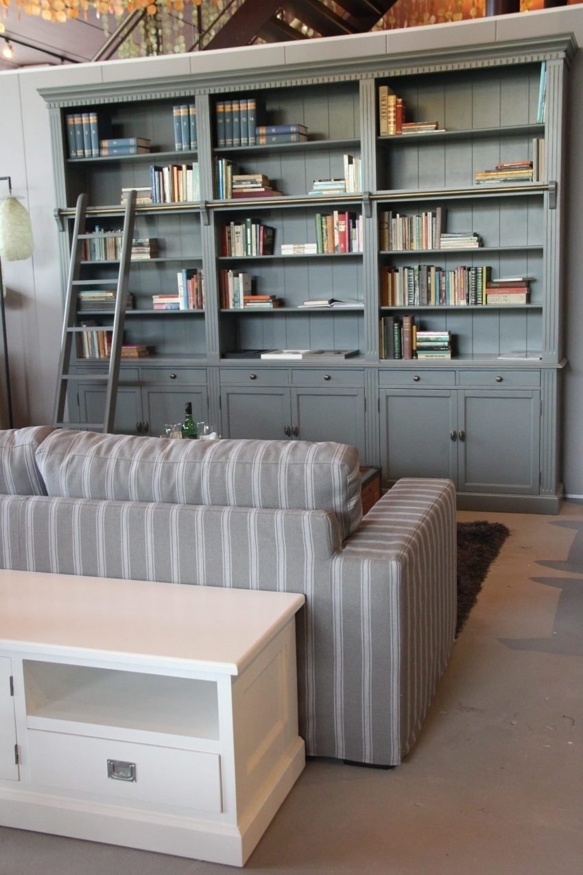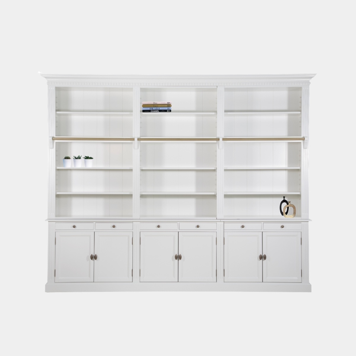 Privatbibliothek - Bücherregal - zerlegbar - 300x43x240H cm - mit Stange und Leiter - verstellbare Einlegeböden - 15 Einlegeböden - 6 Schubladen - 6 geschlossene Flügeltüren