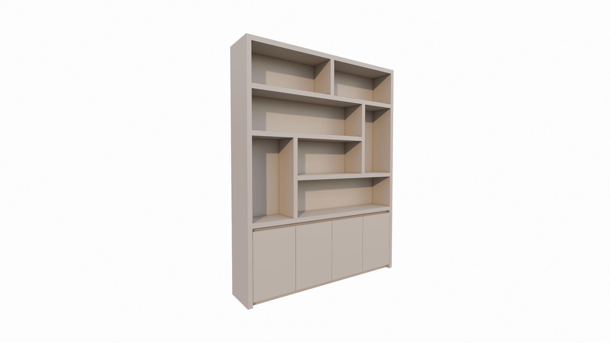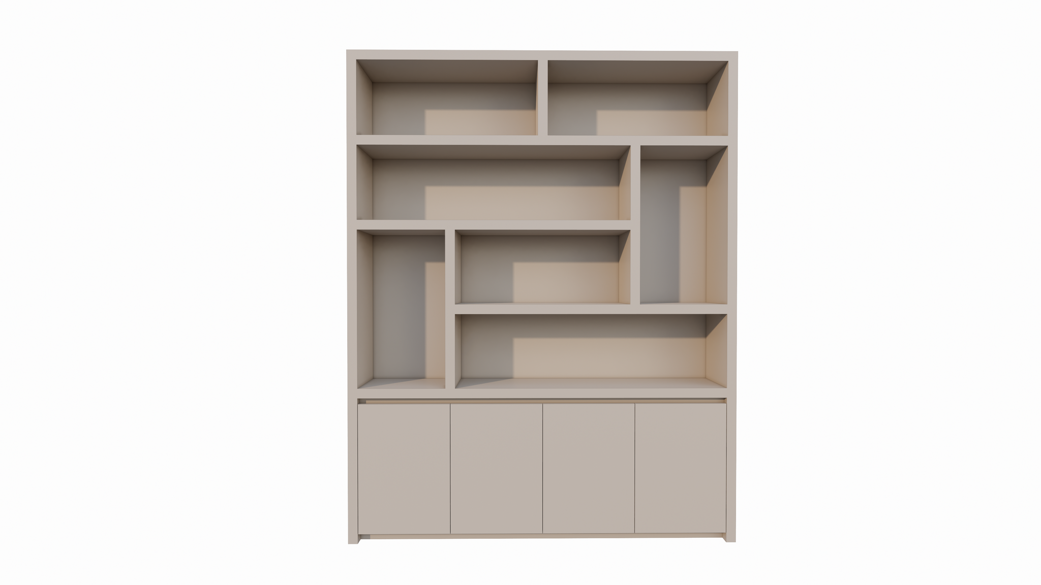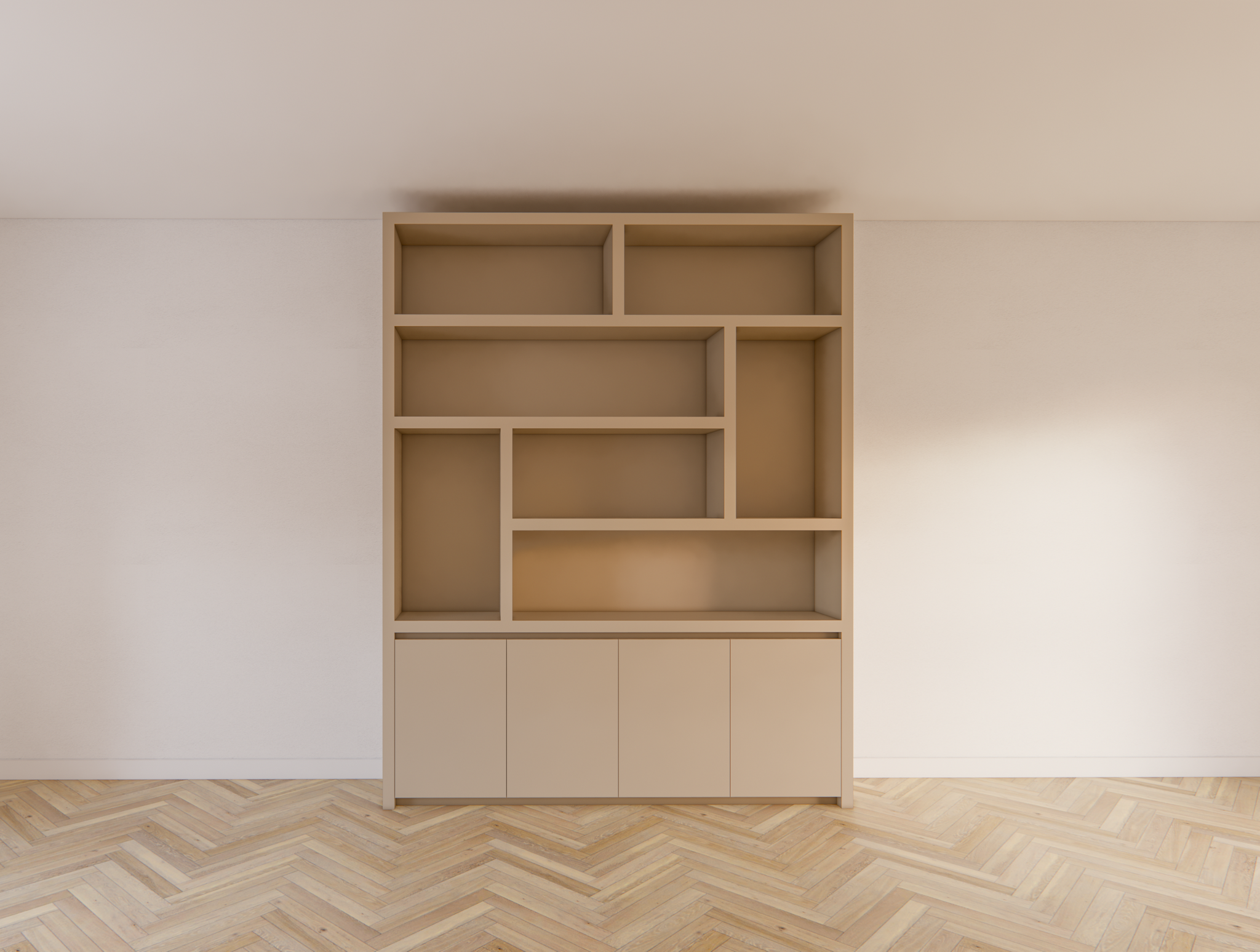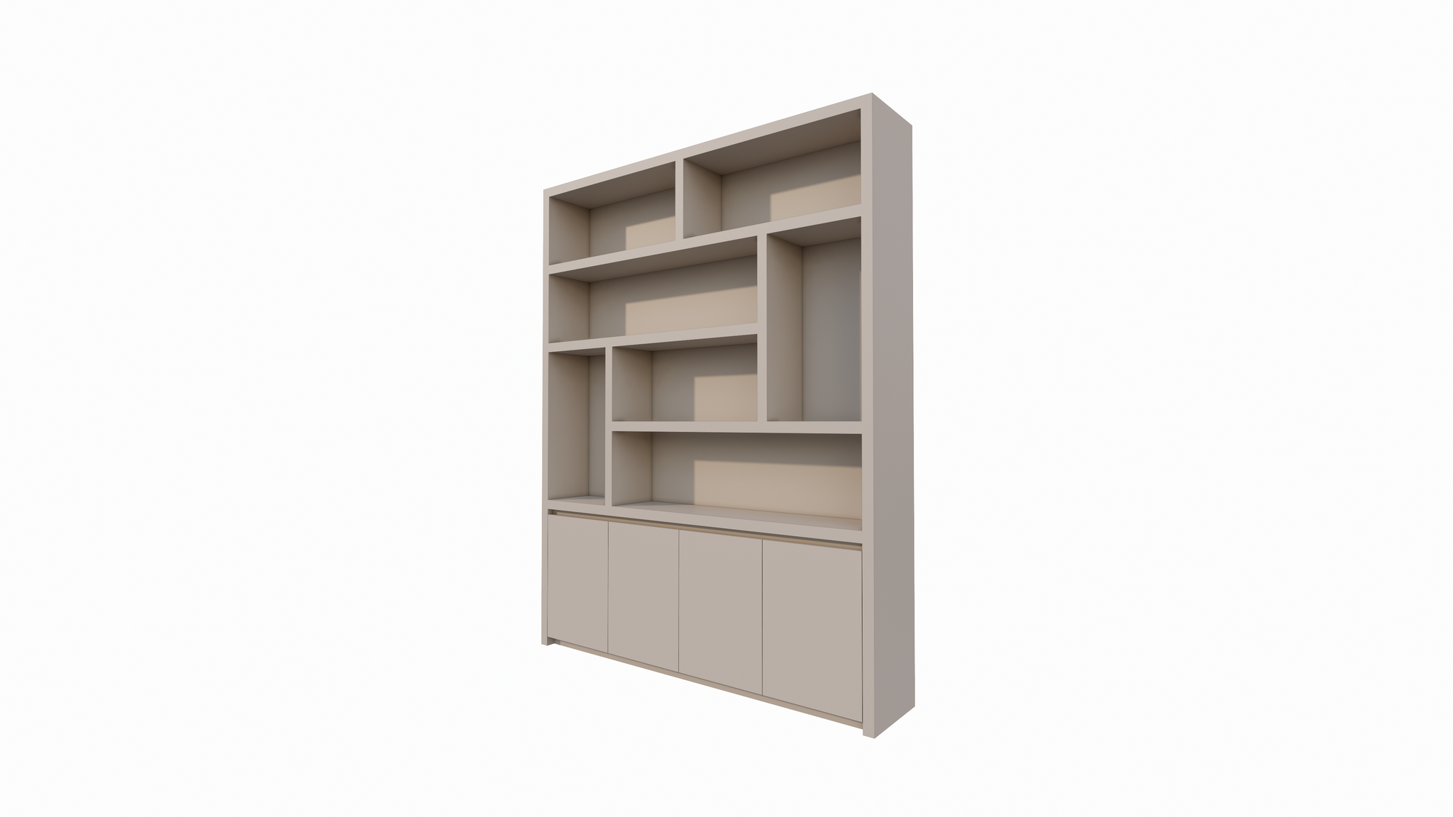 Der untere Teil des Schranks besteht aus einem geschlossenen Bereich mit vier grifflosen Türen. Dank der Push-to-Open-Funktion behält der Schrank sein klares und minimalistisches Aussehen, ohne sichtbare Griffe. Der Schrank ruht auf einem subtilen, schwebenden Untergestell, das einen eleganten und luftigen Effekt erzeugt und den Schrank optisch vom Boden abheben lässt. Dieses Detail unterstreicht den modernen Charakter des Designs.