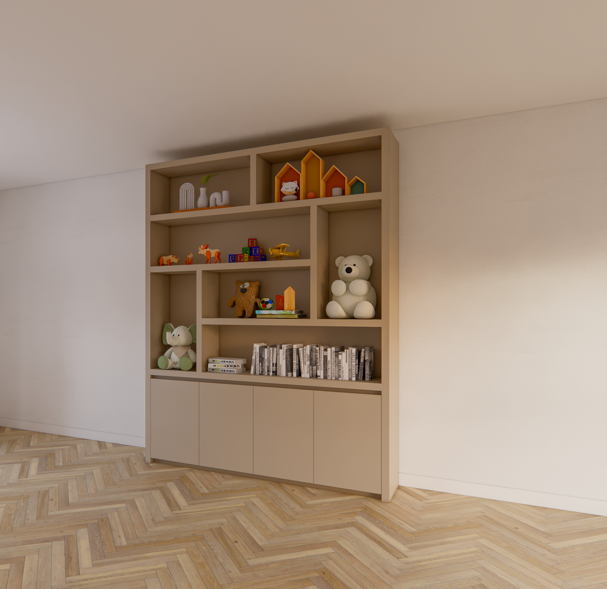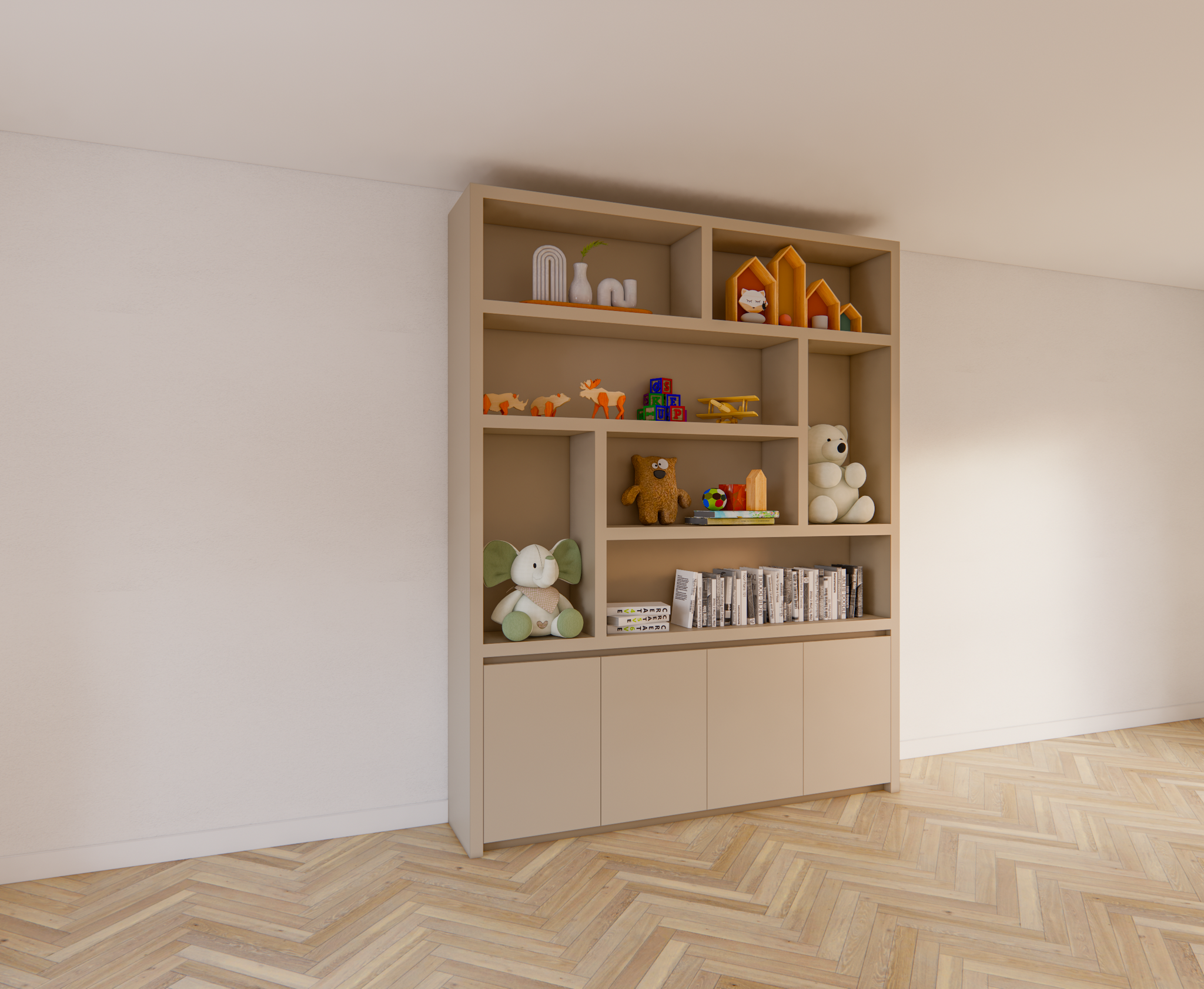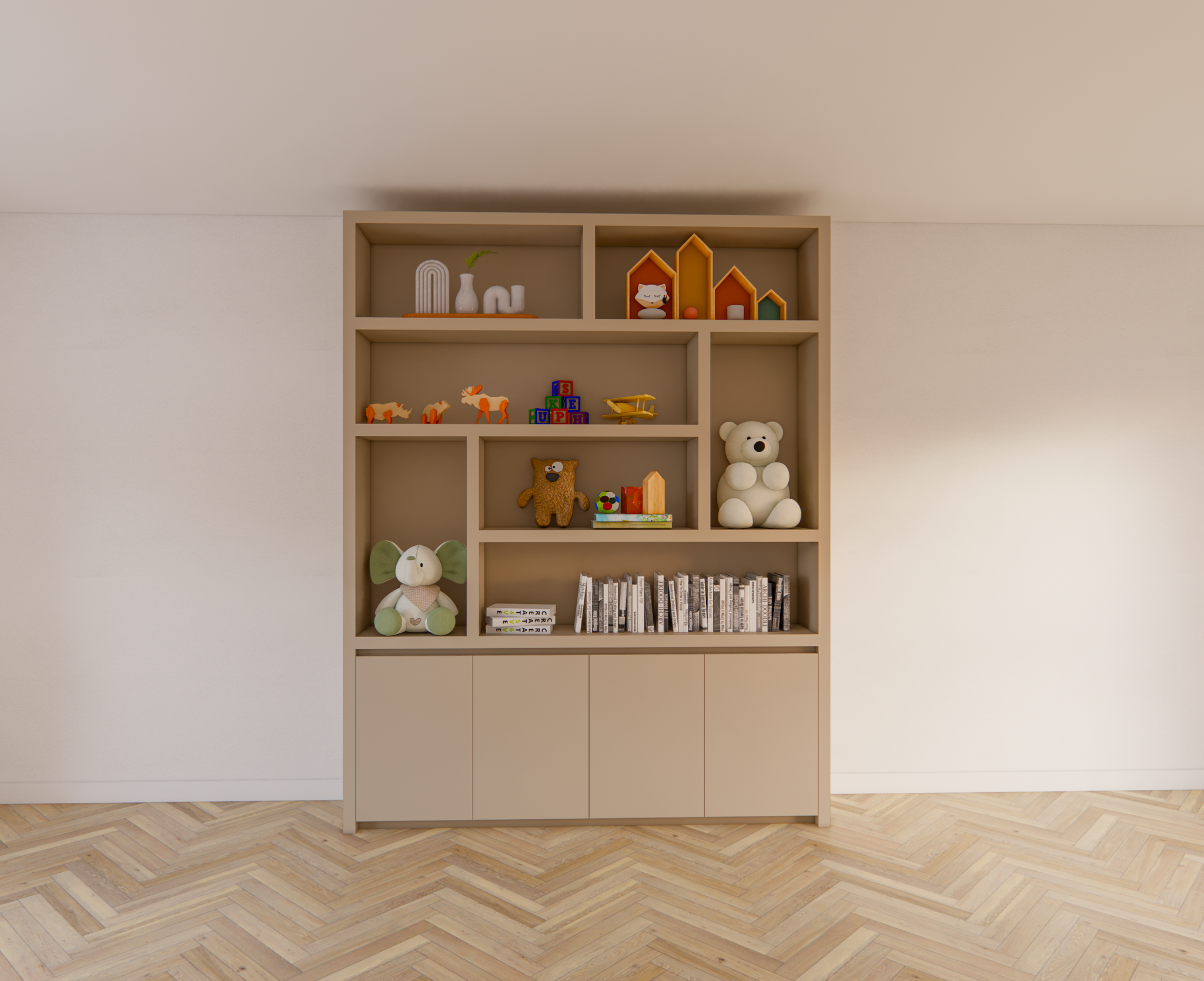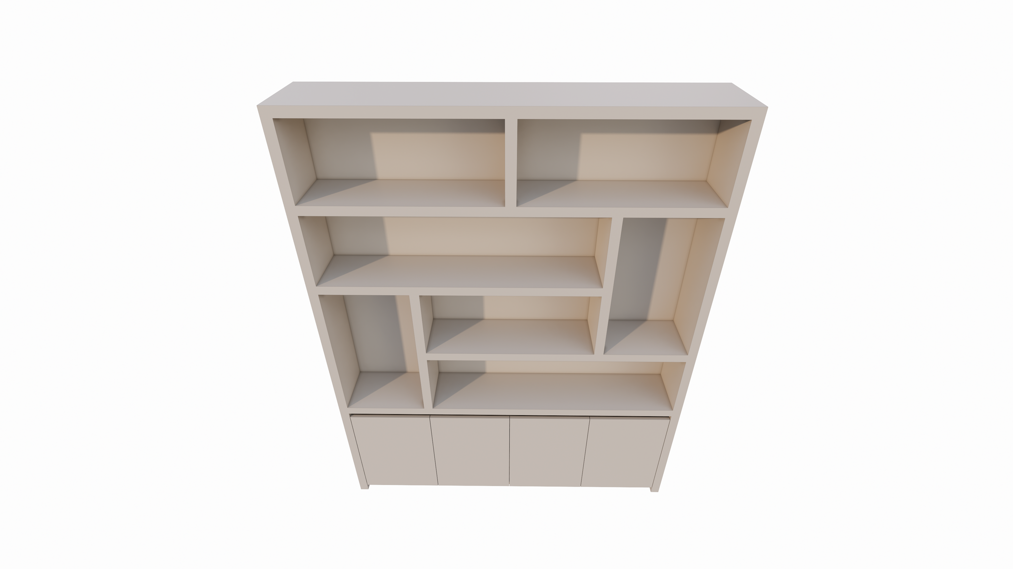 Der untere Teil des Schranks besteht aus einem geschlossenen Bereich mit vier grifflosen Türen. Dank der Push-to-Open-Funktion behält der Schrank sein klares und minimalistisches Aussehen, ohne sichtbare Griffe. Der Schrank ruht auf einem subtilen, schwebenden Untergestell, das einen eleganten und luftigen Effekt erzeugt und den Schrank optisch vom Boden abheben lässt. Dieses Detail unterstreicht den modernen Charakter des Designs.