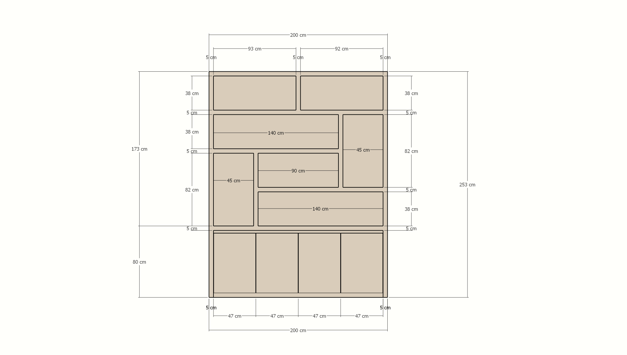 Mit seinen großzügigen Maßen von 200 cm Breite, 40 cm Tiefe und 253 cm Höhe ist dieser Schrank nicht nur ein praktischer Stauraum, sondern auch ein echter Blickfang im Raum. Die verspielte, asymmetrische Aufteilung verleiht dem Schrank einen dynamischen Charakter und bietet viel Platz für die Präsentation von Büchern, Deko-Objekten oder persönlichen Sammlungen.