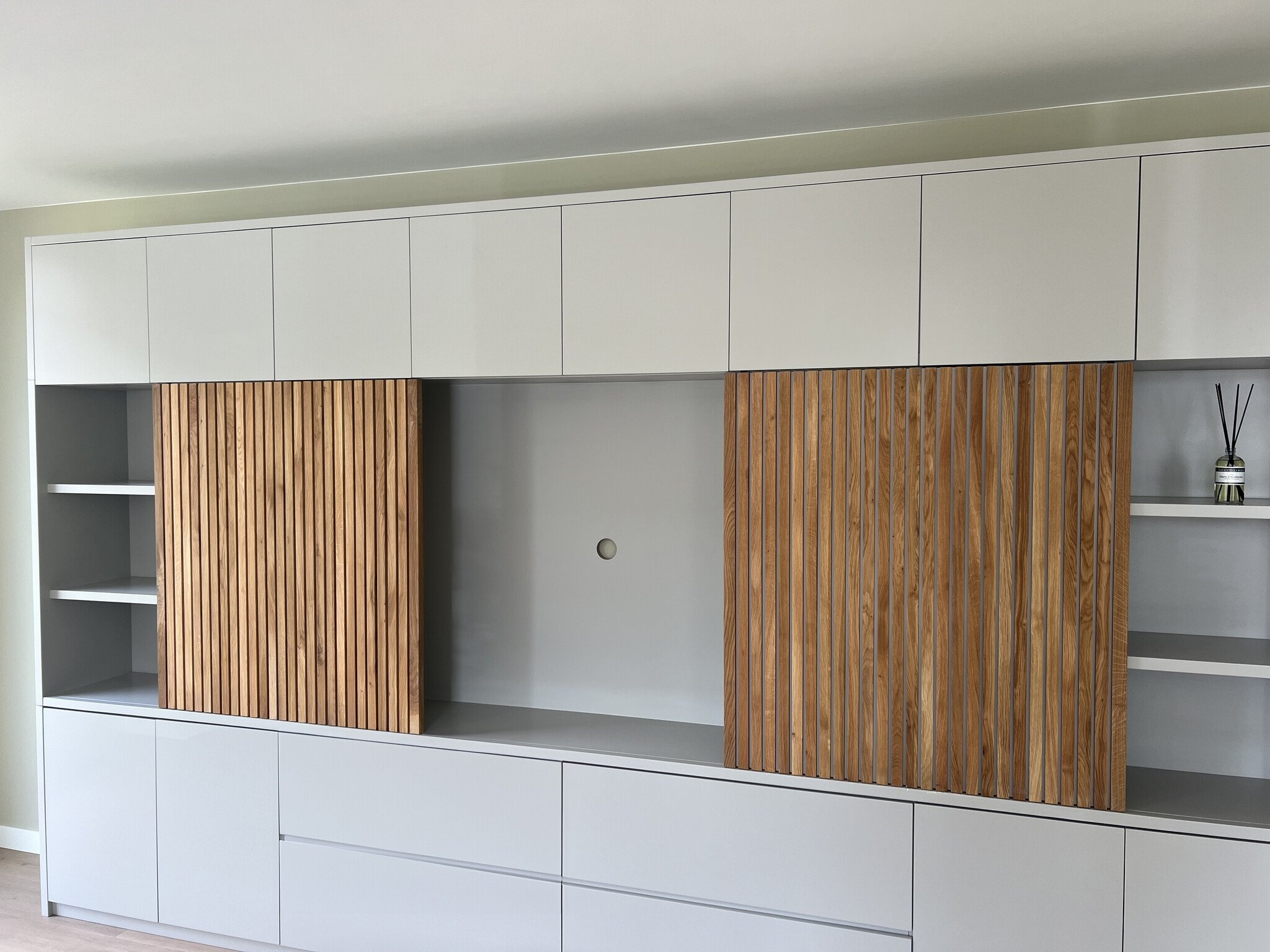 - Schiebetüren, die vor das TV-Fach geschoben werden können, sorgen für einen eleganten und modernen Look