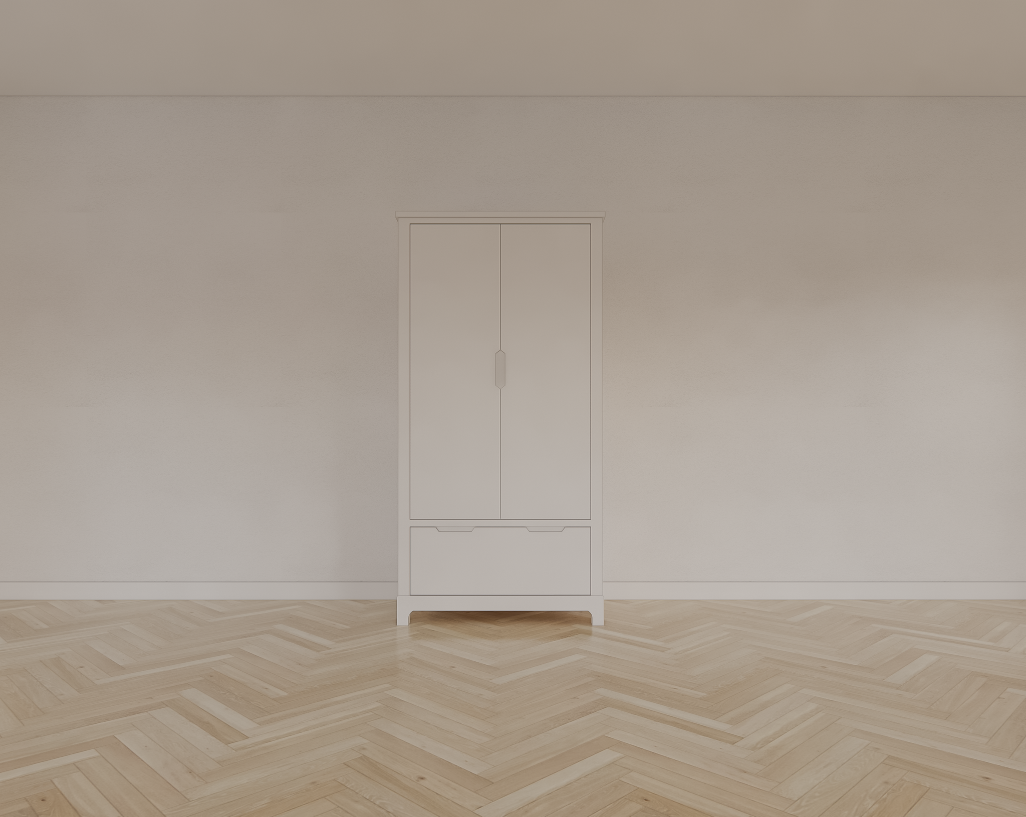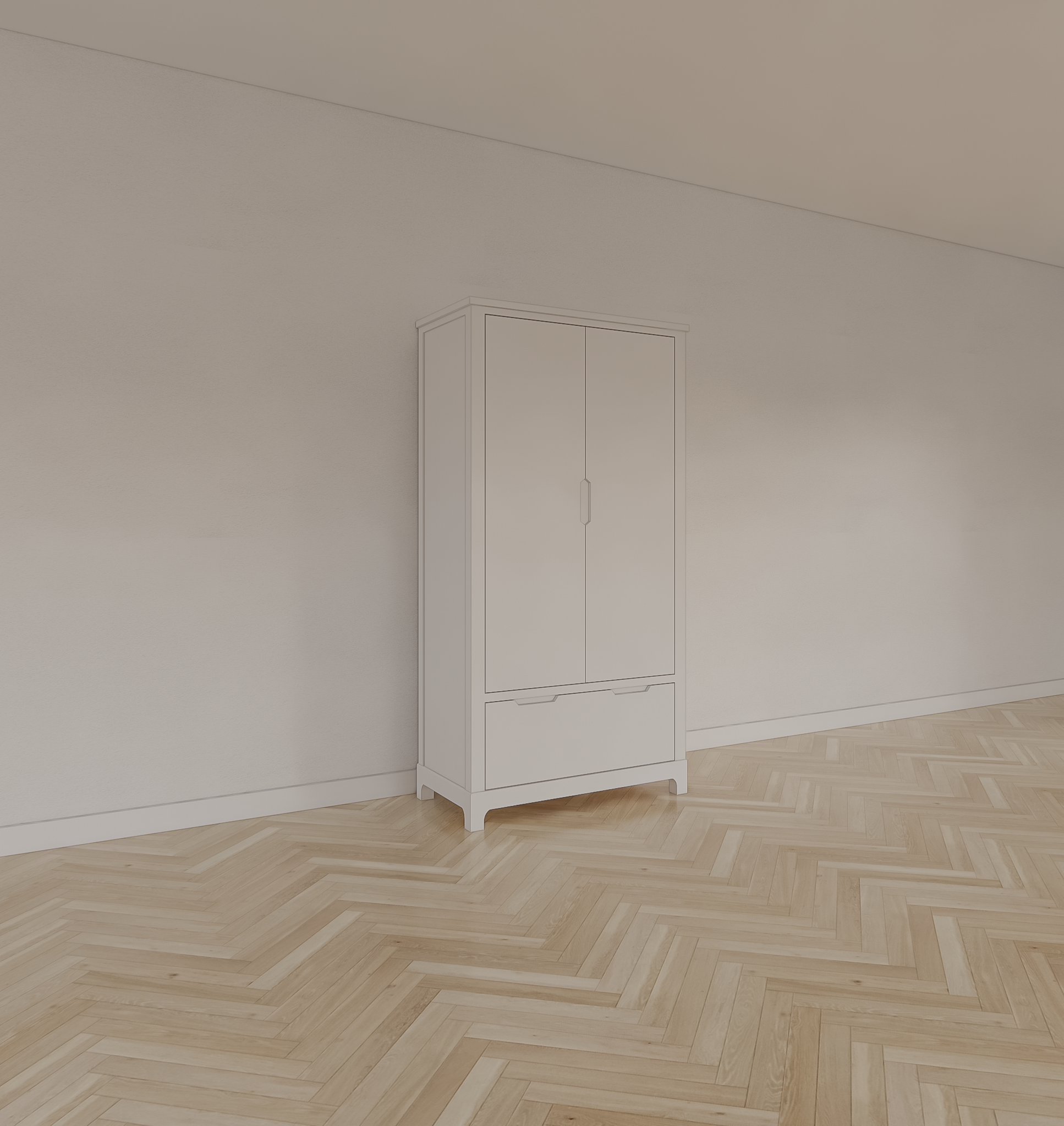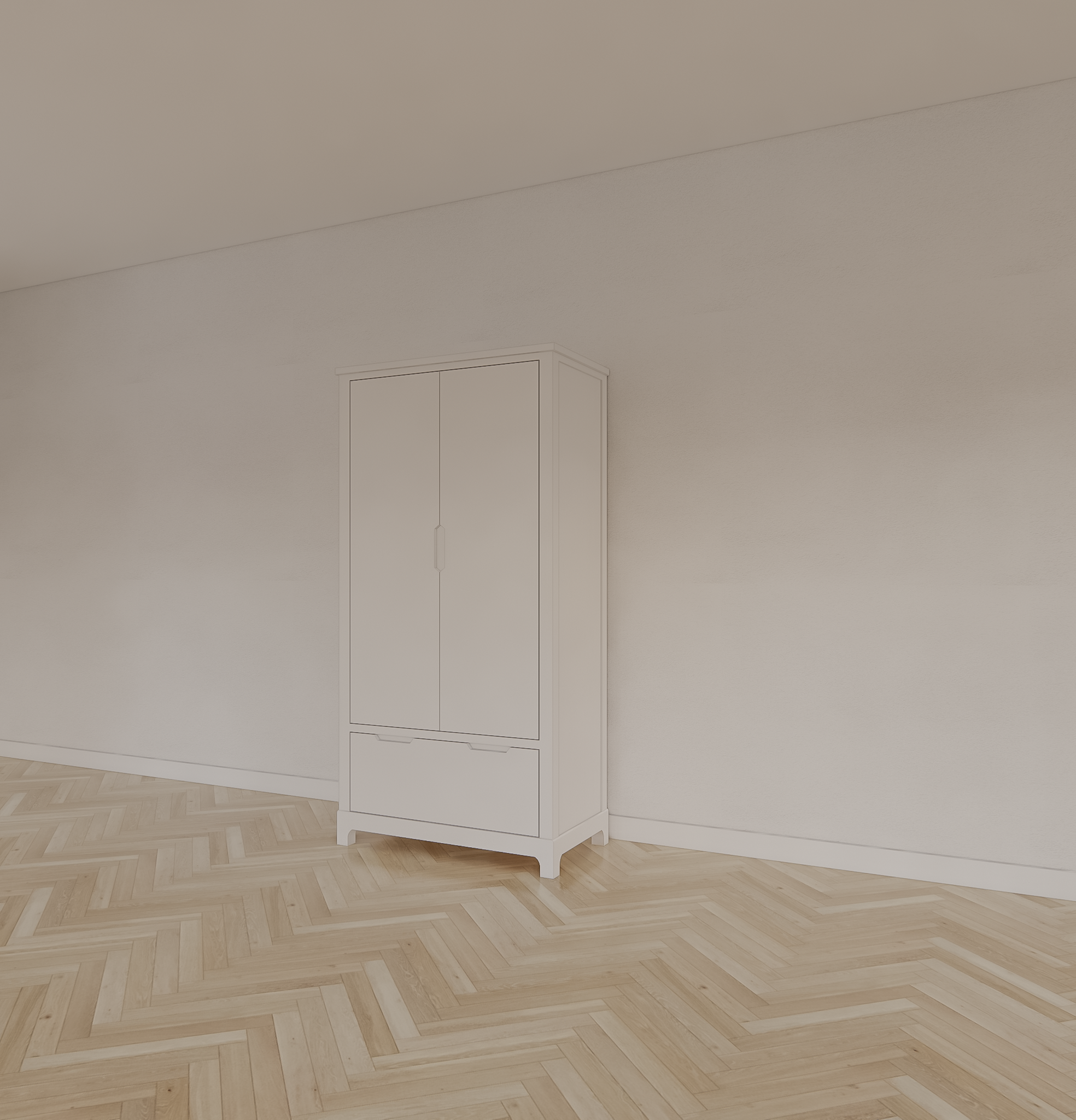 >Der Kleiderschrank verfügt über zwei Flügeltüren, die sich zu einem flexiblen Innenraum mit verstellbaren Einlegeböden und einem Hängebereich öffnen lassen, so dass er leicht an Ihre speziellen Bedürfnisse angepasst werden kann. Darüber hinaus verfügt der Slawi Schrank über eine praktische Schublade mit Soft-Close-Funktion, die sich ideal für die Aufbewahrung kleinerer Gegenstände eignet. Dieser Schrank kombiniert Funktionalität mit einem eleganten und modernen Look und ist in allen RAL- und NCS-Farben erhältlich, die perfekt zu jeder Einrichtung passen.