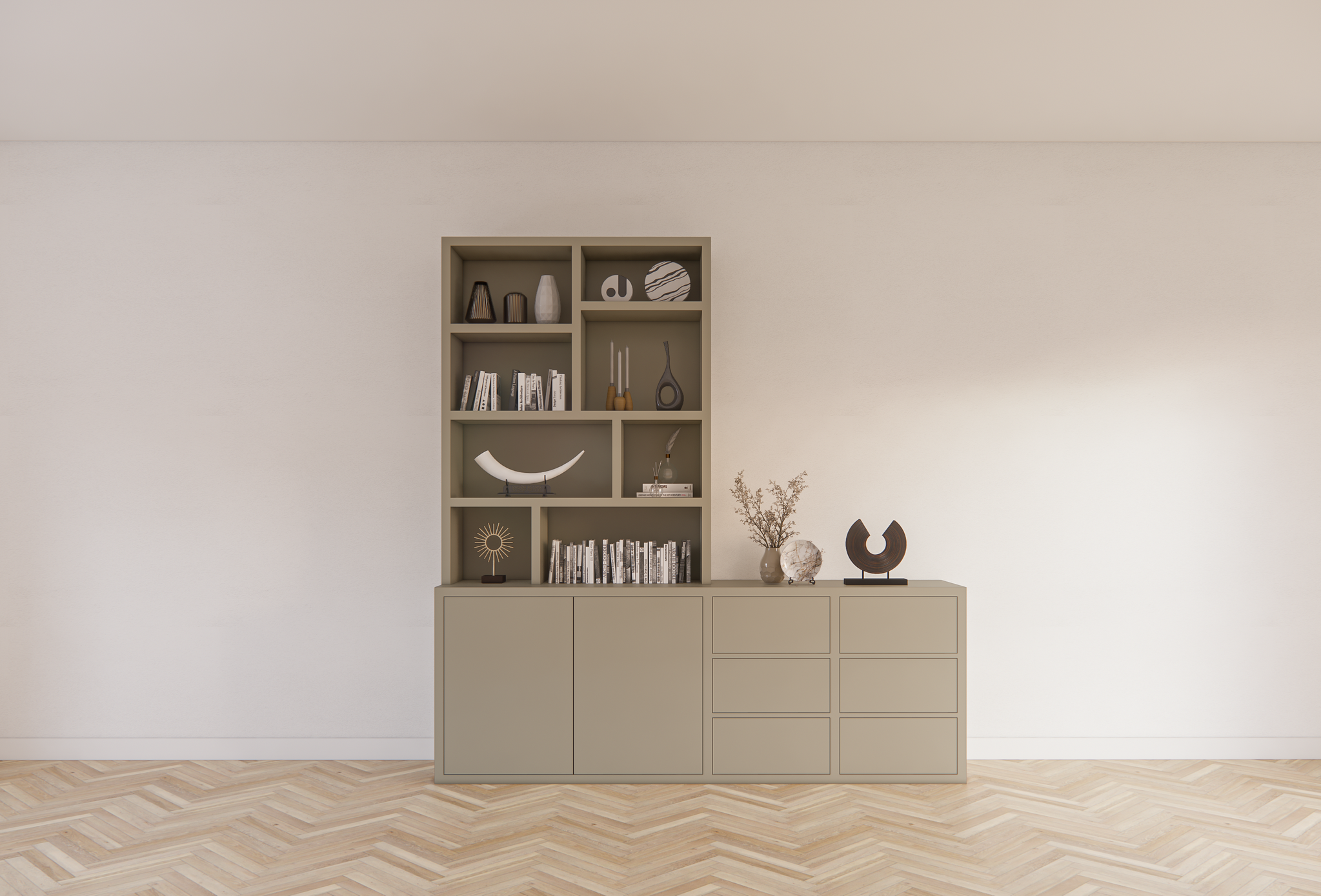 Der Schrank besteht aus robusten, 4 cm dicken Einlegeböden, die nicht nur für eine luxuriöse Optik sorgen, sondern auch ausreichend Tragkraft für schwerere Gegenstände bieten. Das minimalistische Design mit einem Push-to-Open-Mechanismus für die Schubladen und Türen macht den Schrank schlank und modern, ohne sichtbare Griffe oder Knöpfe. Dies erhöht sowohl die Ästhetik als auch die Benutzerfreundlichkeit des Schranks.