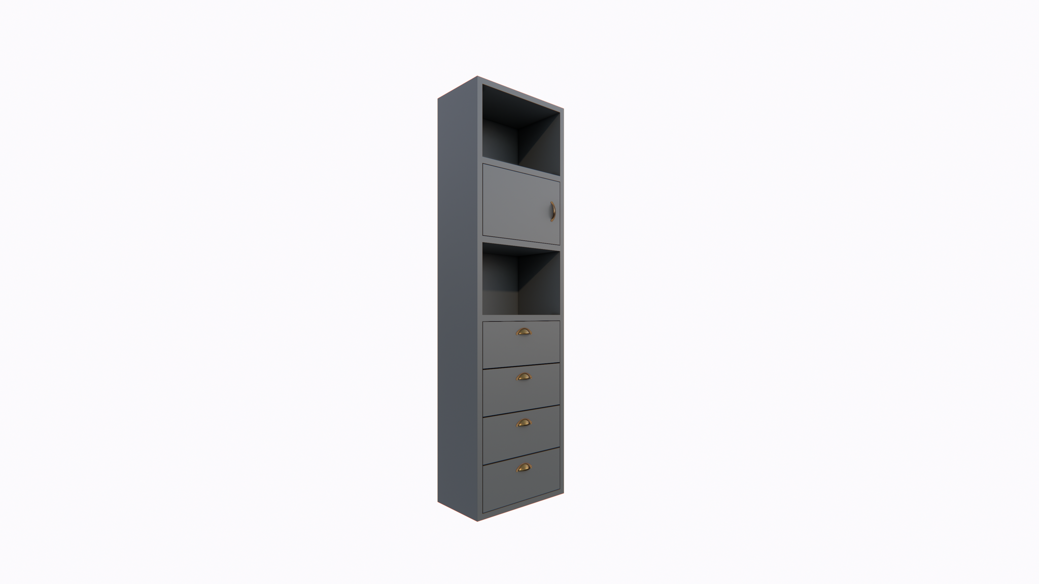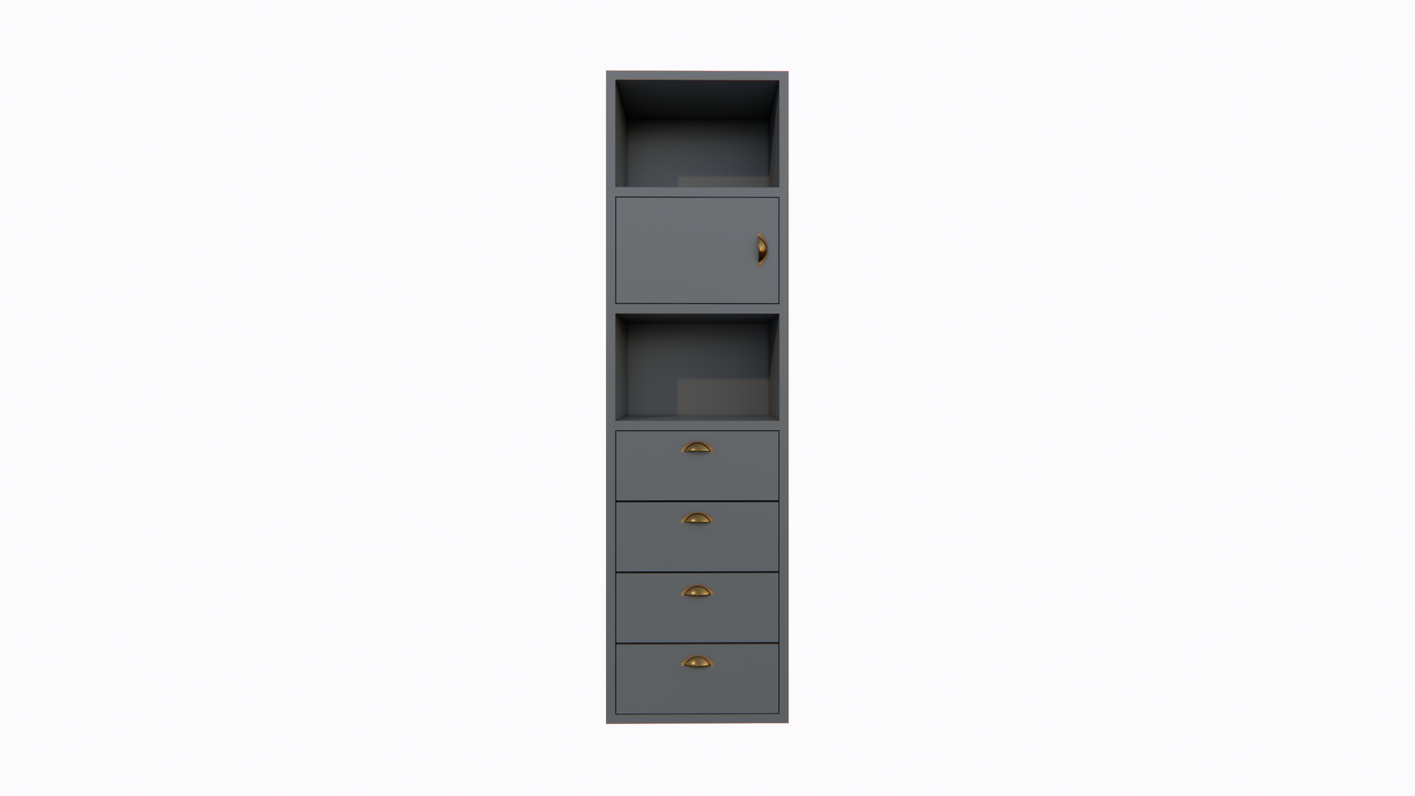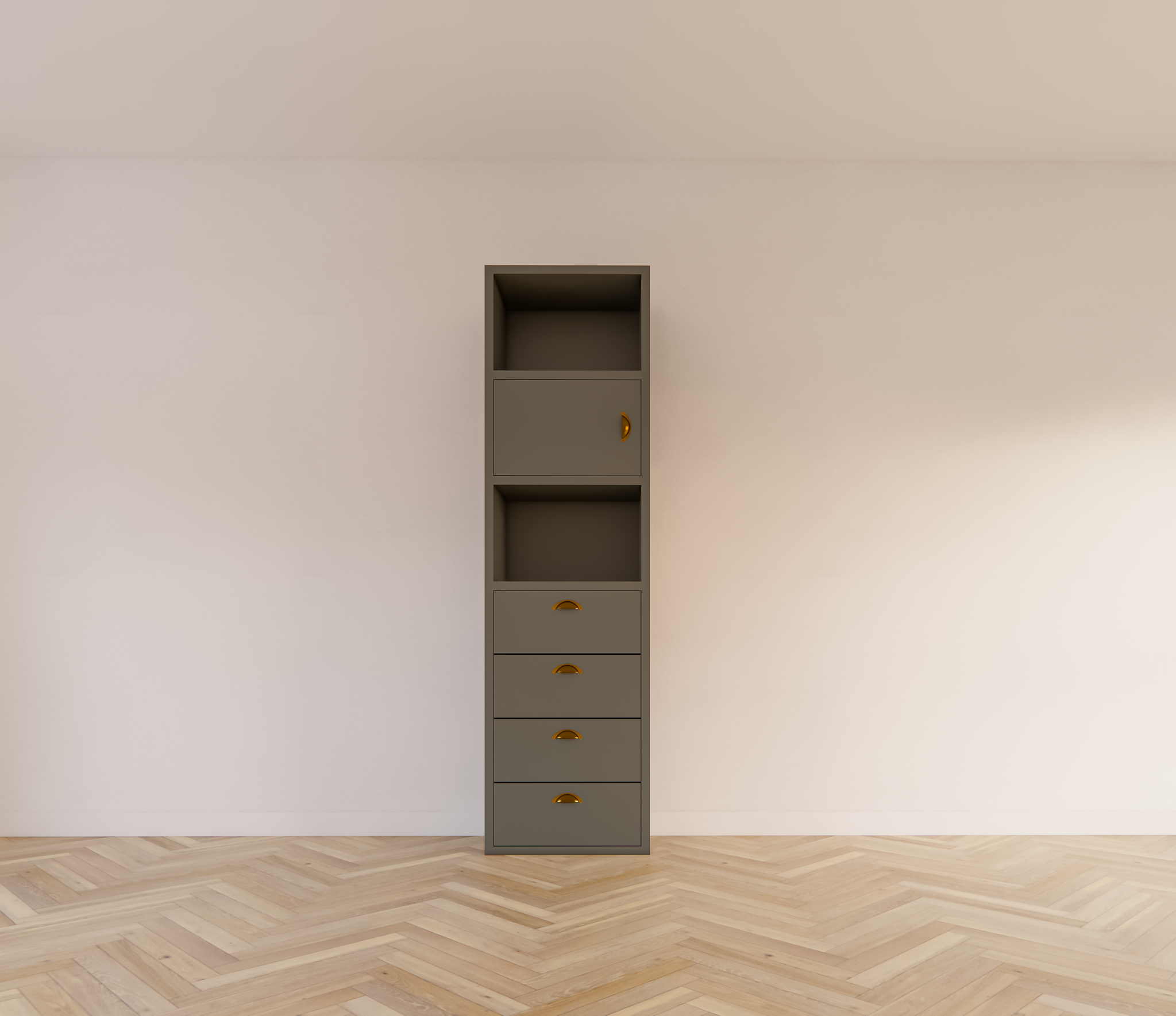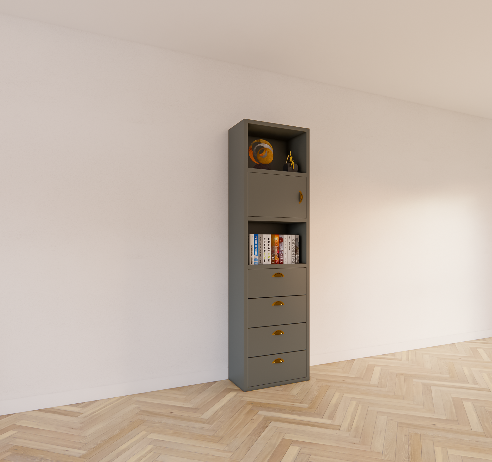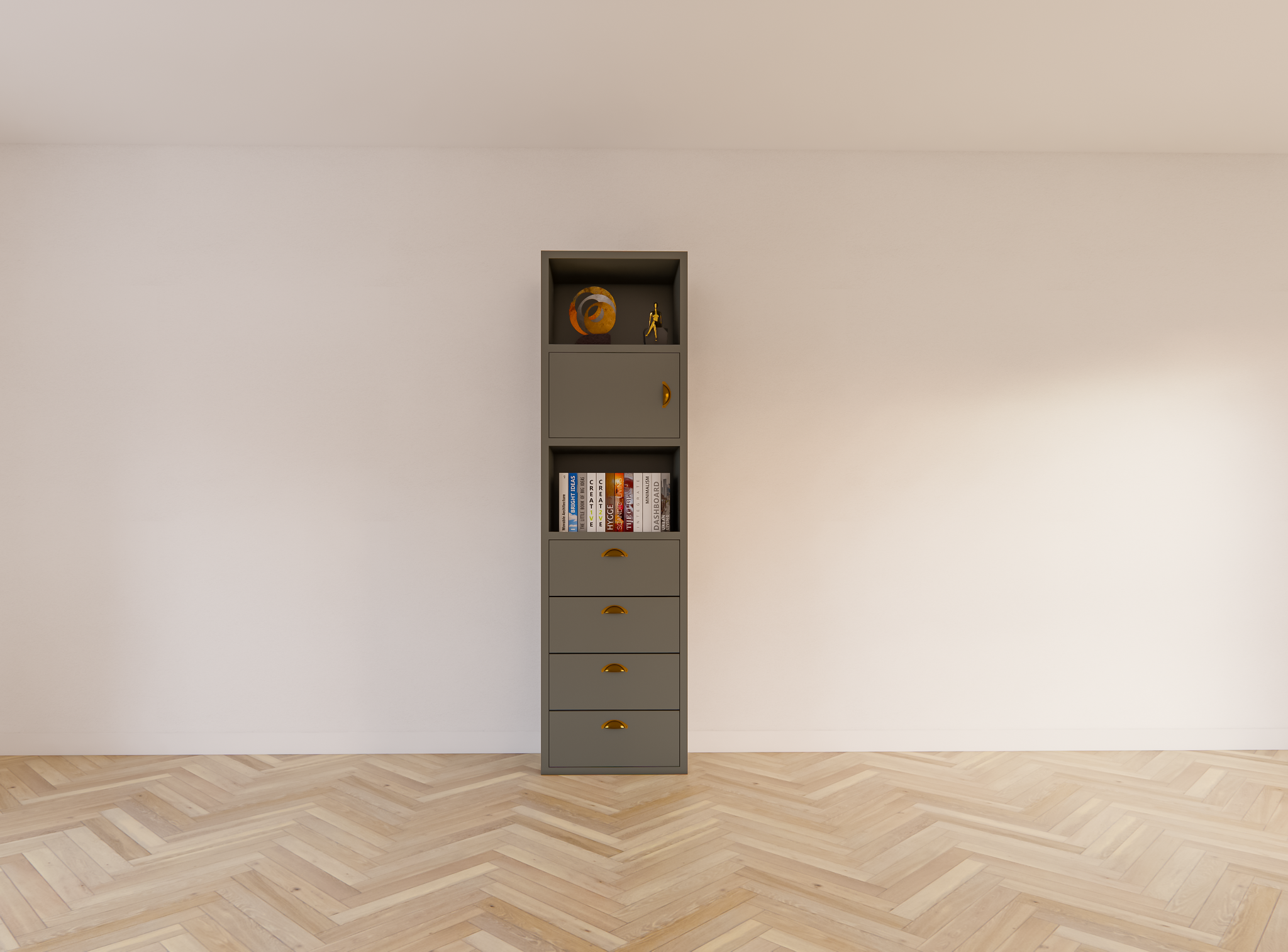 Der Schrank verfügt über vier geräumige Schubladen mit Soft-Close-Funktion, die sanft und leise schließen und sich ideal für die Aufbewahrung von Papieren, Zubehör oder anderen Dingen des täglichen Bedarfs eignen. Oberhalb der Schubladen befindet sich ein offenes Fach für Bücher oder Dekorationen und eine Flügeltür, die zusätzlichen Stauraum bietet. Das obere offene Fach eignet sich perfekt, um einen persönlichen Gegenstand oder ein Kunstwerk auszustellen.