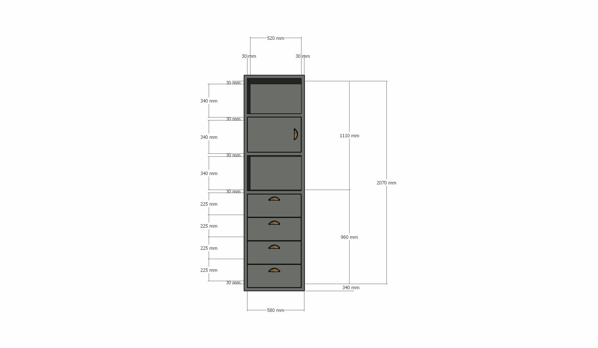 Die Kommode Graz ist ein schlanker und funktionaler Schrank, der sich ideal für kleinere Räume oder zur Ergänzung einer bestehenden Einrichtung eignet. Mit einer Breite von 58 cm, einer Tiefe von 34 cm und einer Höhe von 207 cm bietet dieser Schrank überraschend viel Stauraum in einer kompakten Form.
