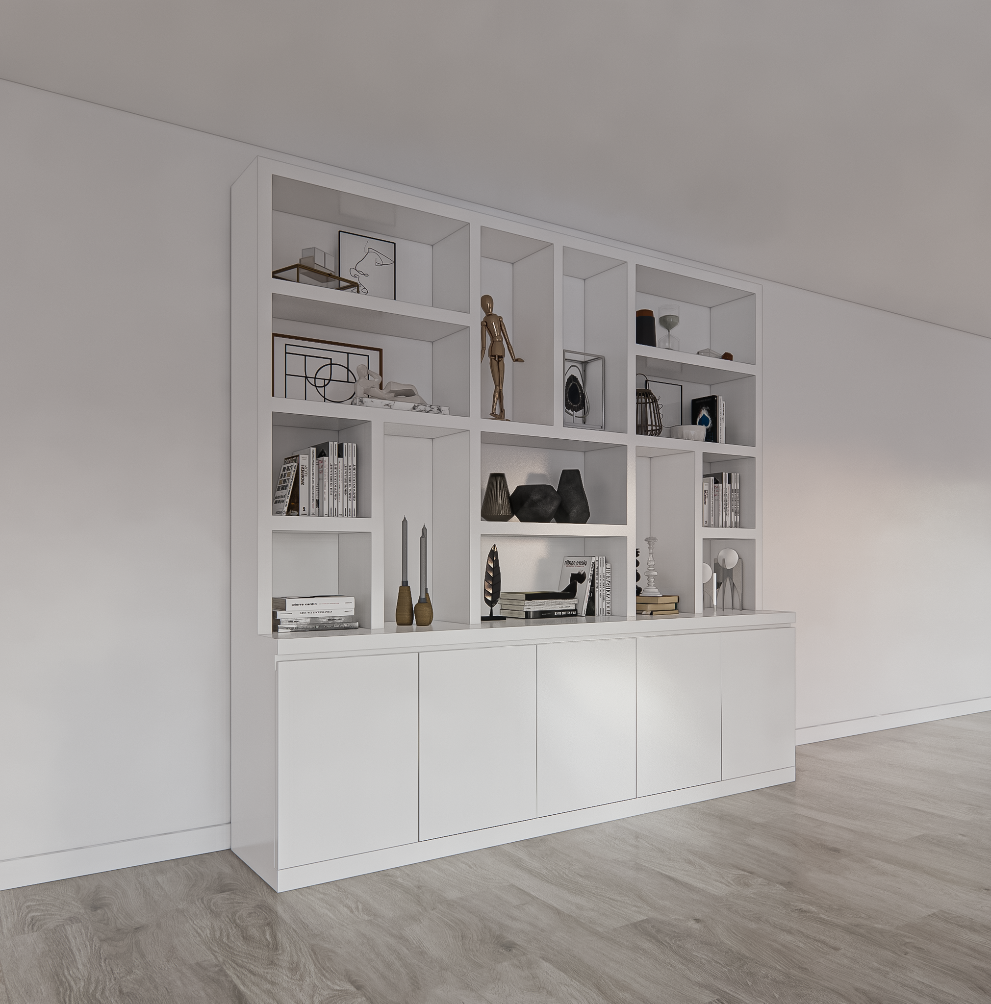 Mit seinem flacheren Oberschrank bietet der Sineu-Schrank eine elegante Lösung für die Aufbewahrung von Gegenständen, die weniger Platz benötigen, während die offenen Fächer Platz für die Präsentation von Dekorationsartikeln oder Büchern bieten. Die fünf grifflosen Türen sorgen für eine nahtlose Optik und einen leichten Zugang zum Stauraum, während die robuste 5 cm starke Einlegebodenstärke für Langlebigkeit sorgt.