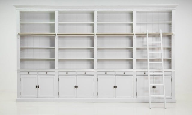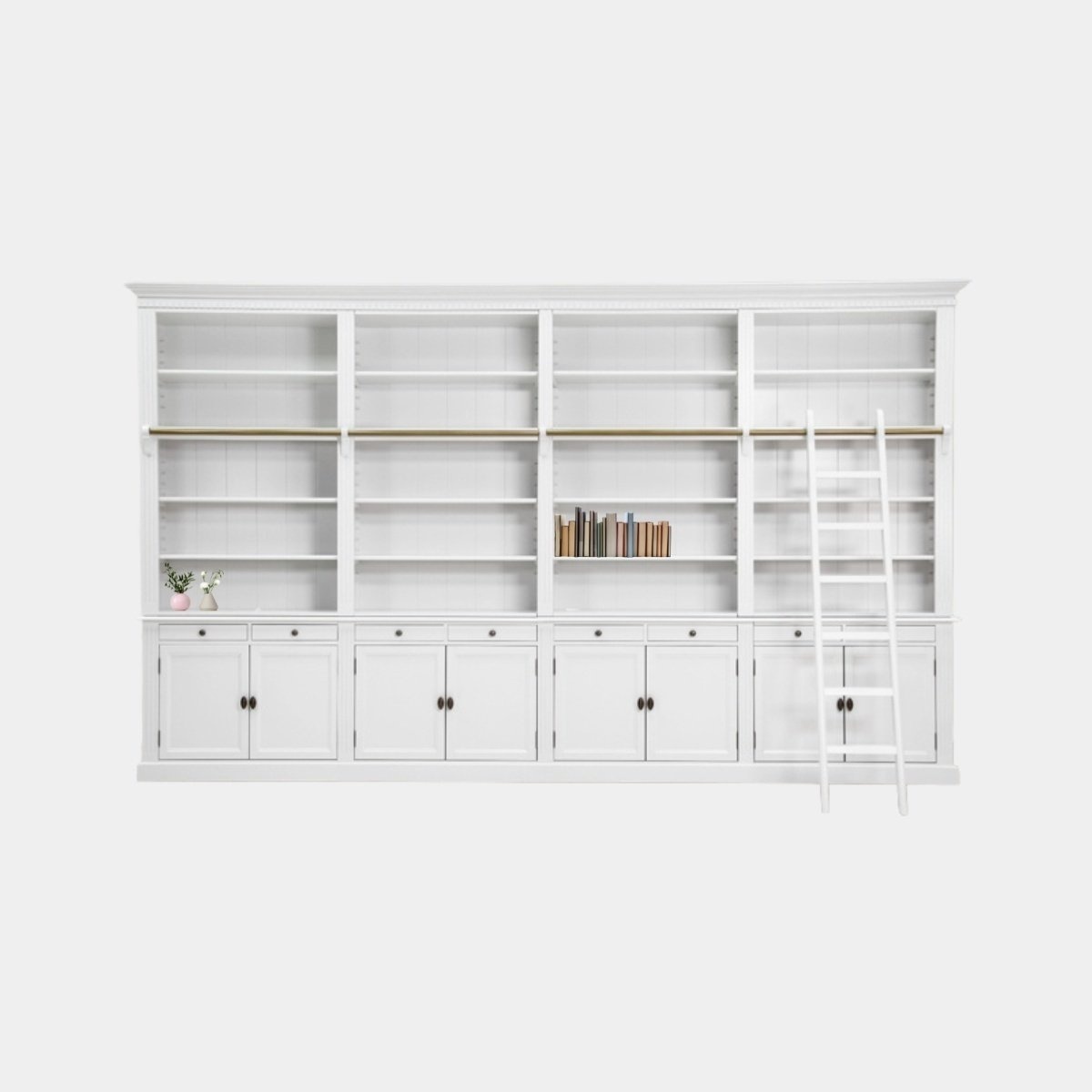 Privatbibliothek - Bücherregal - 400x43x240H cm - zerlegbar - mit Stange und Leiter - verstellbare Einlegeböden - 20 Einlegeböden - 8 Schubladen - 8 geschlossene Flügeltüren