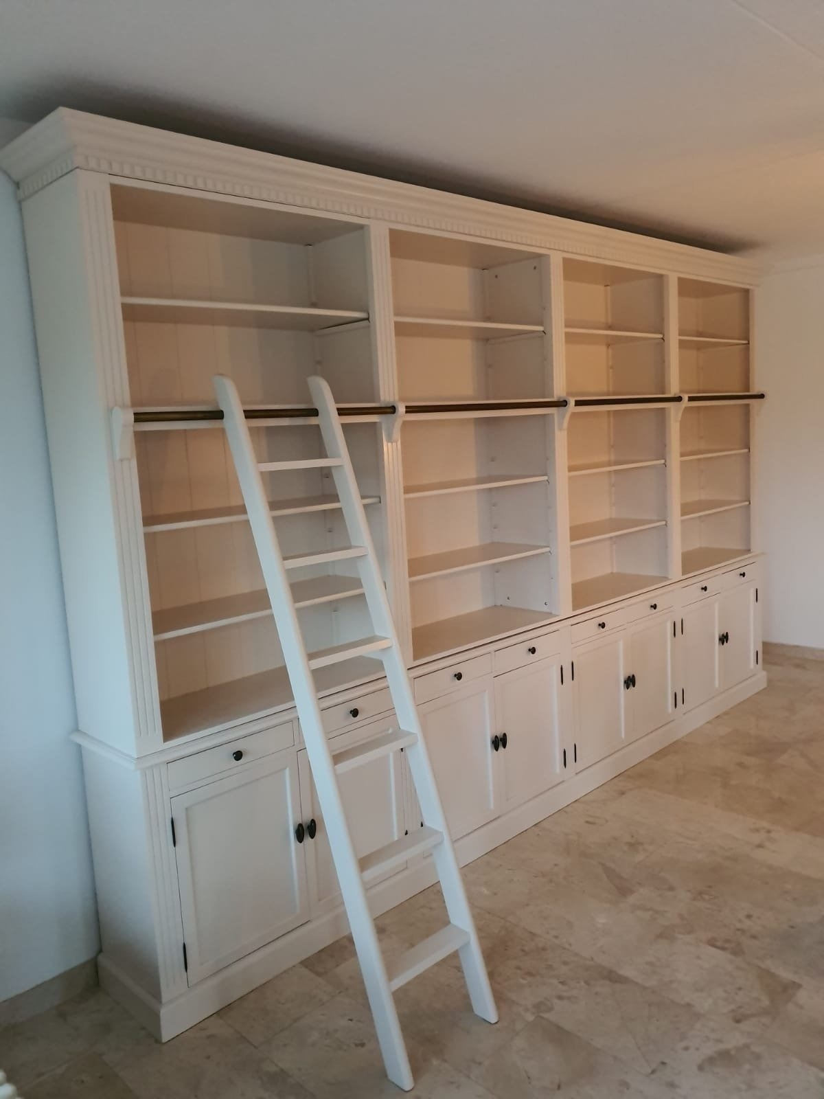 Dieses rustikale Bücherregal mit Leiter ist nicht weniger als 4 Fächer und hat 8 Schubladen und 8 Türen. Die Einlegeböden im oberen Bücherregal sind verstellbar. Dies ist ein zeitloser Bibliotheksschrank und bringt Atmosphäre in jedes Zuhause. Erhältlich in allen Ral-Farben.