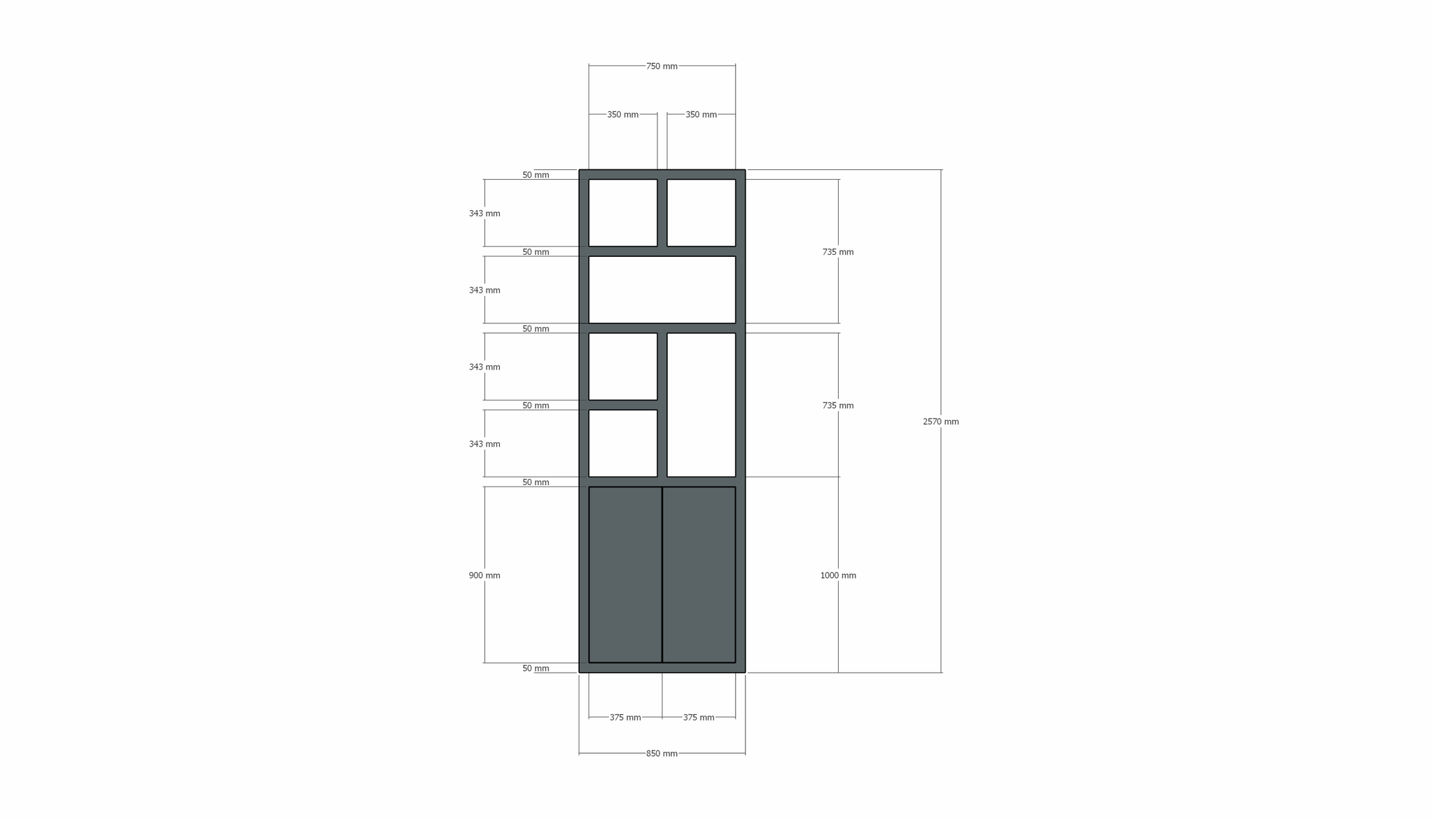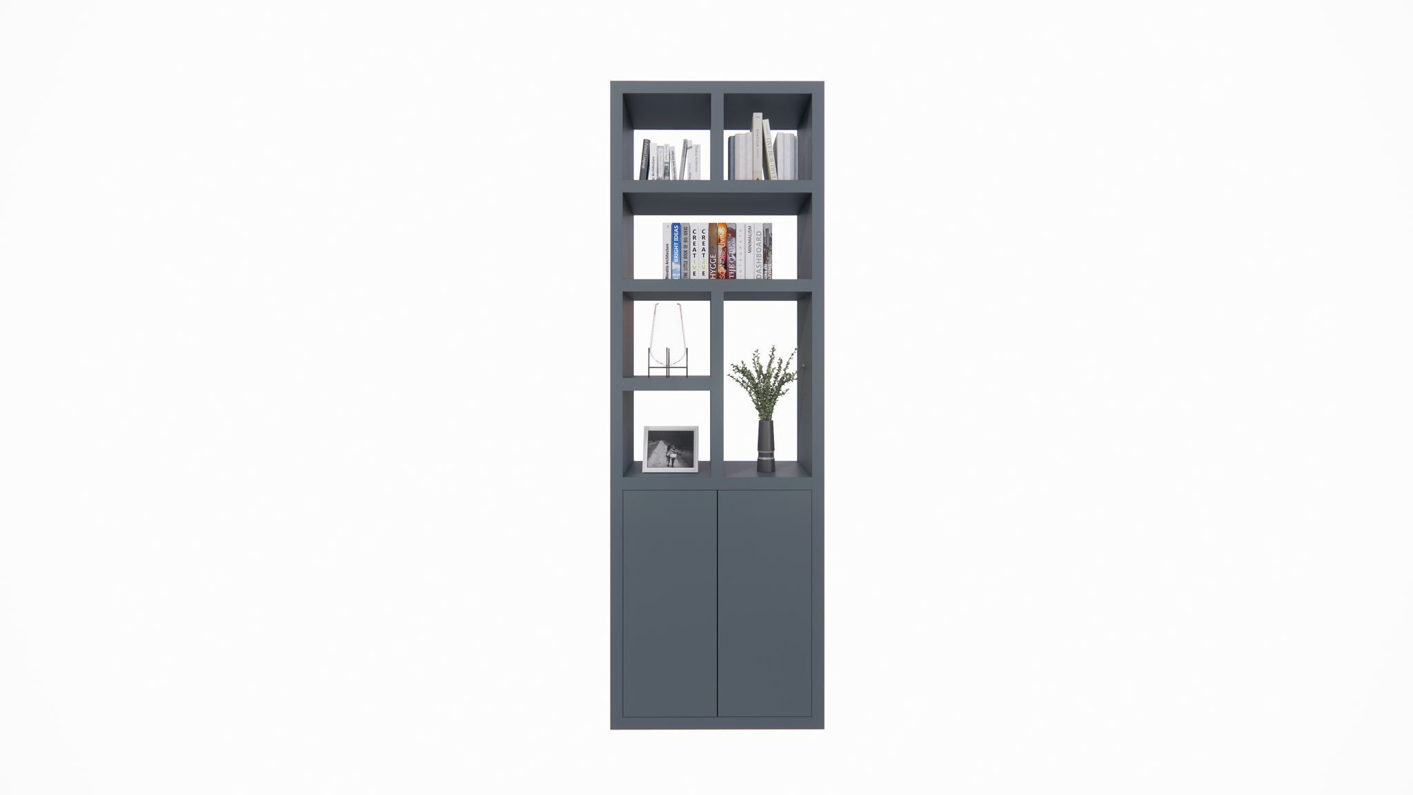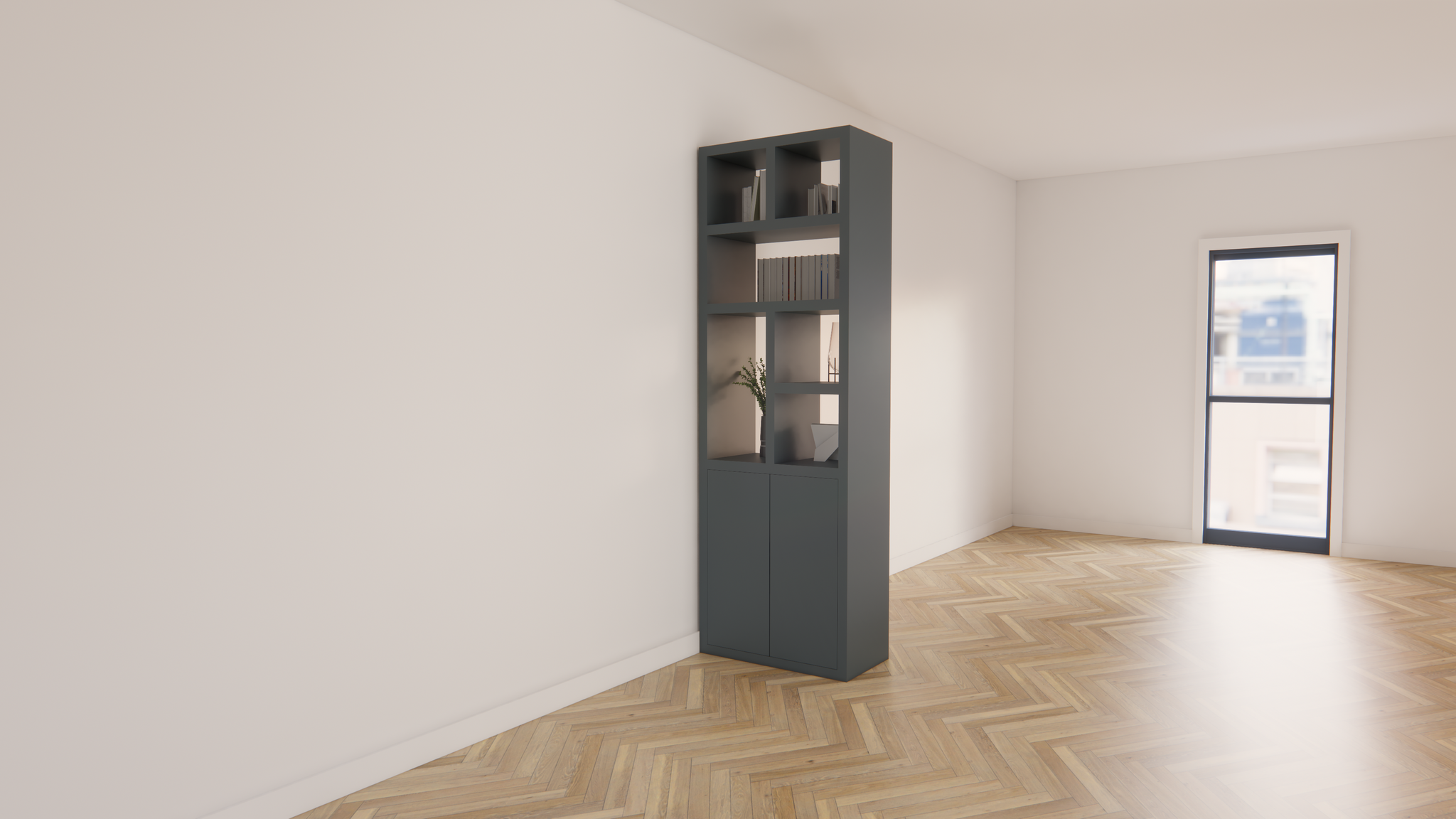 Der Schrank hat eine glatte Oberfläche auf beiden Seiten, so dass er in der Mitte des Raumes platziert werden kann, ohne dass eine "Rückseite" sichtbar ist. Die offenen Fächer sind ideal zum Ausstellen von Büchern, Pflanzen oder Dekorationen, während die aufschiebbaren Türen praktischen Stauraum ohne sichtbare Griffe bieten.