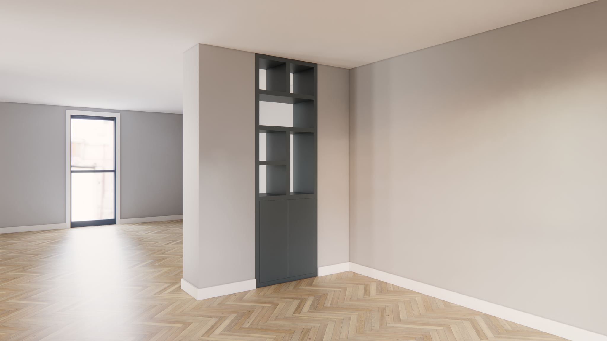 Raumteiler Agudo - 85x45x257H cm - push-to-open Türen - offene Fächer - beidseitig saubere Verarbeitung