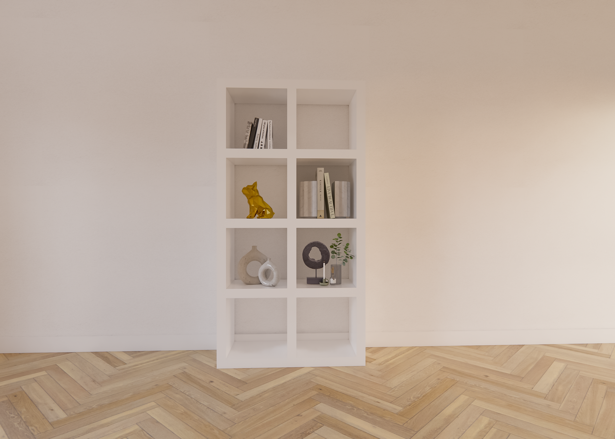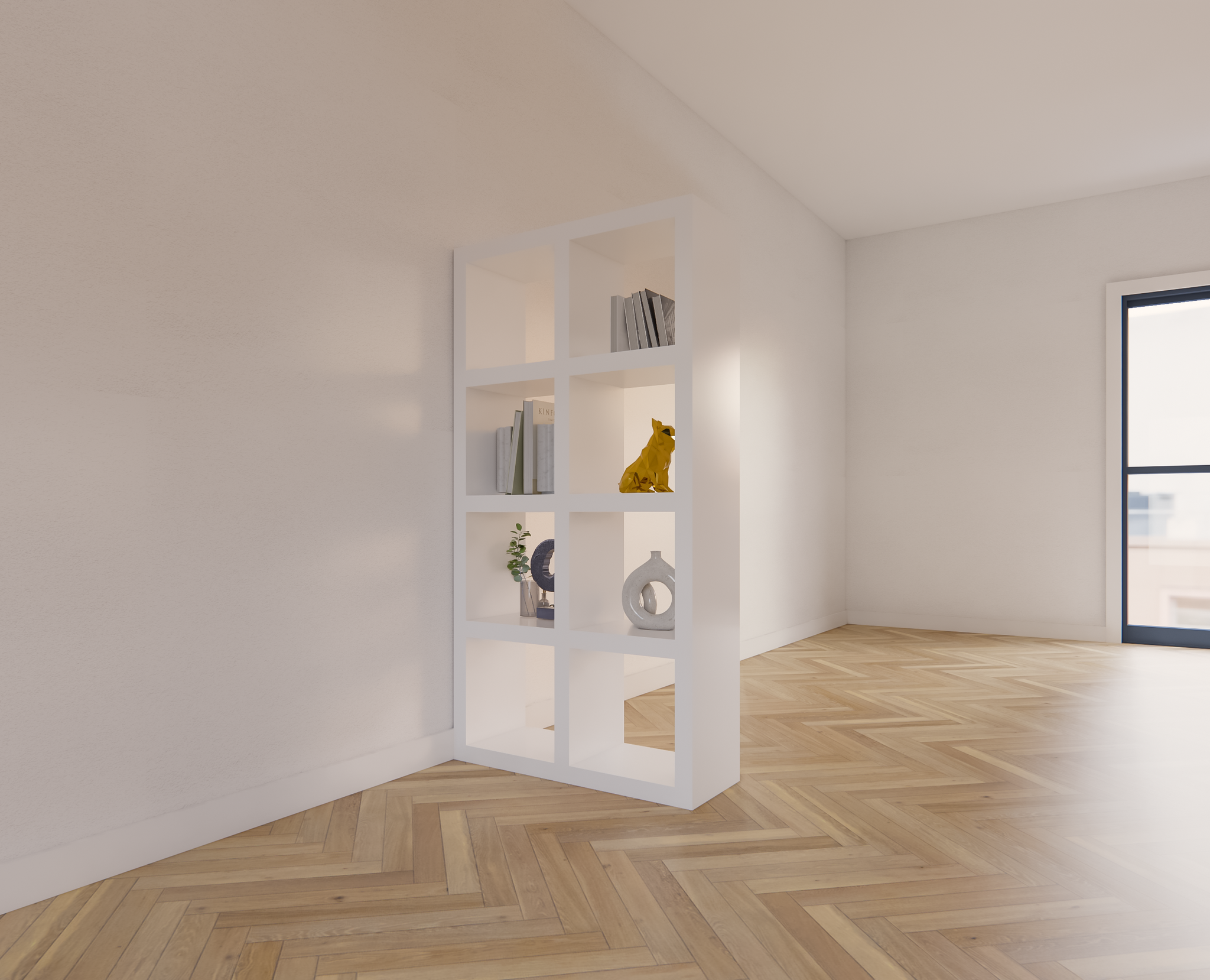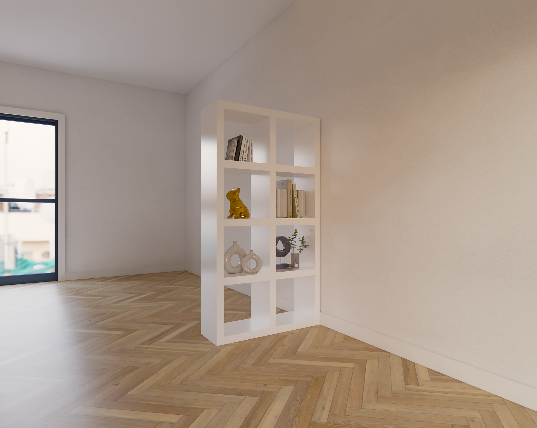 Der Schrank besteht aus offenen Fächern mit einer klaren, symmetrischen Aufteilung. So bleibt der Raum transparent und luftig, ohne dass man bestimmte Bereiche des Raumes optisch abtrennen muss. Die Fächer bieten ausreichend Platz für Bücher, Accessoires oder Kunstobjekte und sind von beiden Seiten zugänglich.