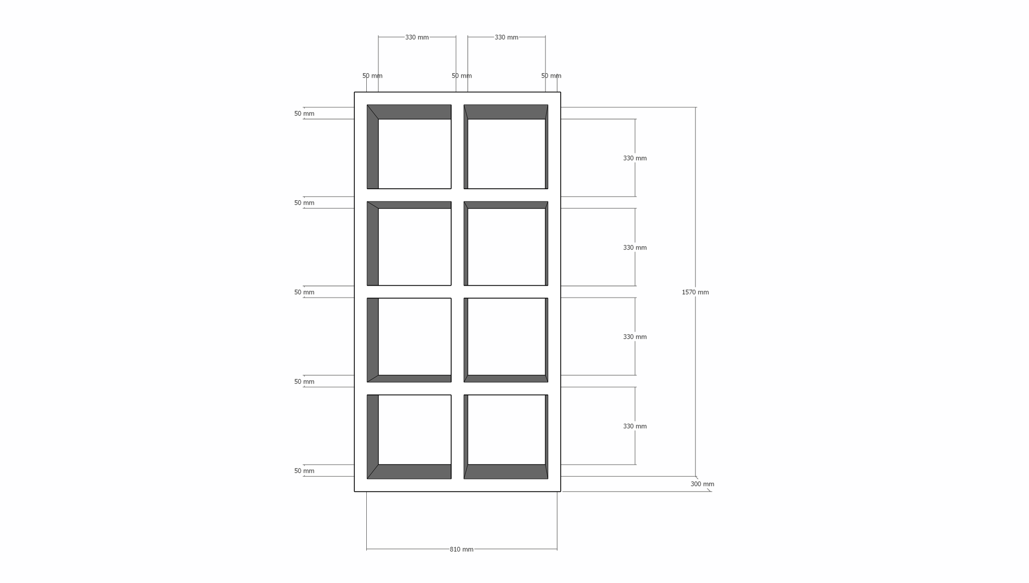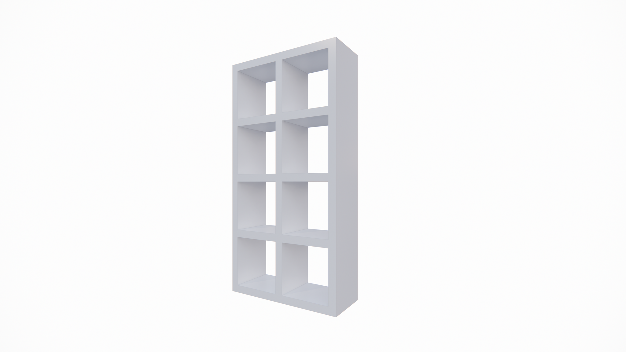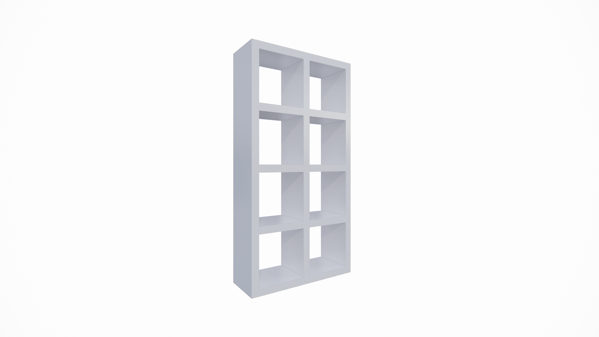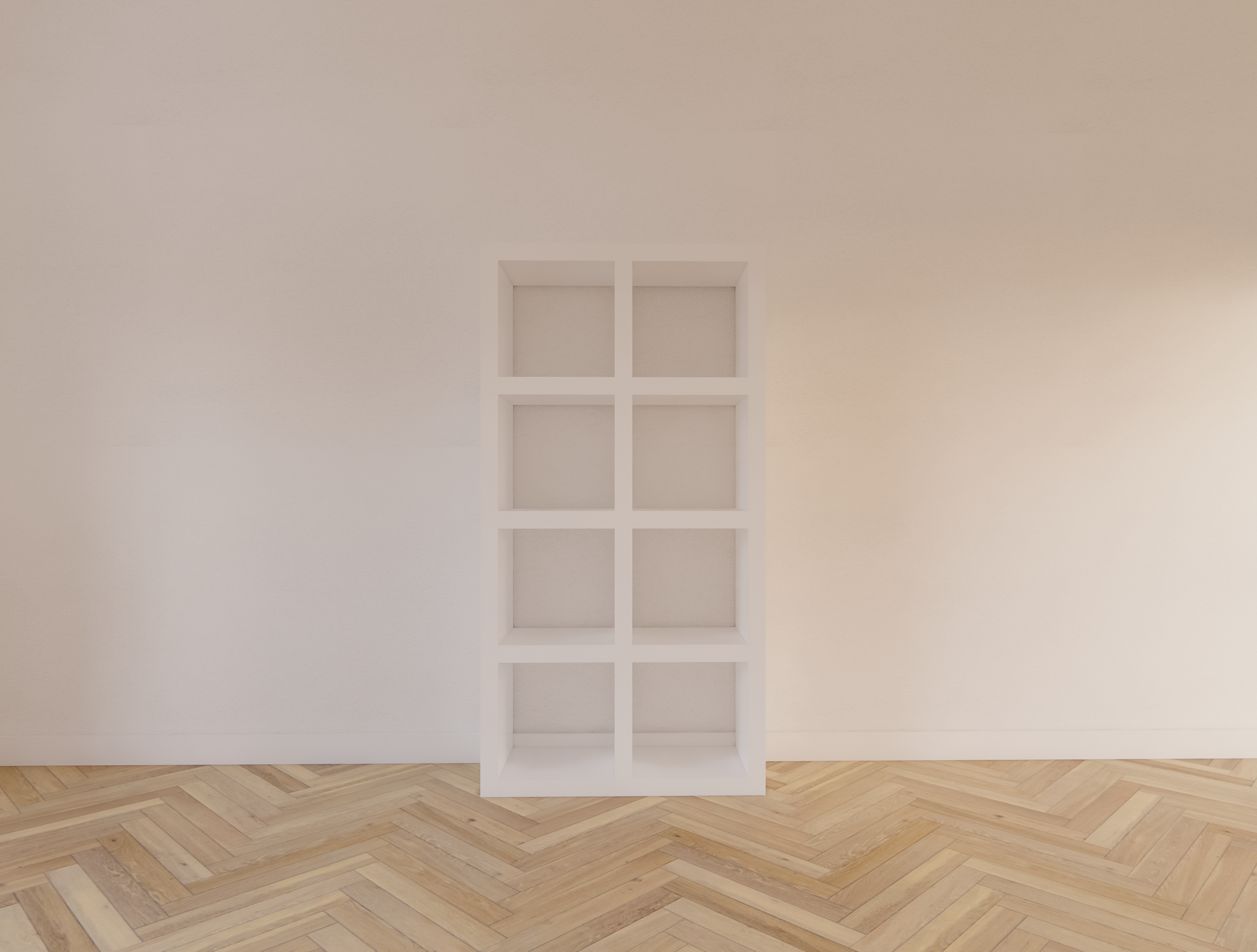 Der Schrank besteht aus offenen Fächern mit einer klaren, symmetrischen Aufteilung. So bleibt der Raum transparent und luftig, ohne dass man bestimmte Bereiche des Raumes optisch abtrennen muss. Die Fächer bieten ausreichend Platz für Bücher, Accessoires oder Kunstobjekte und sind von beiden Seiten zugänglich.