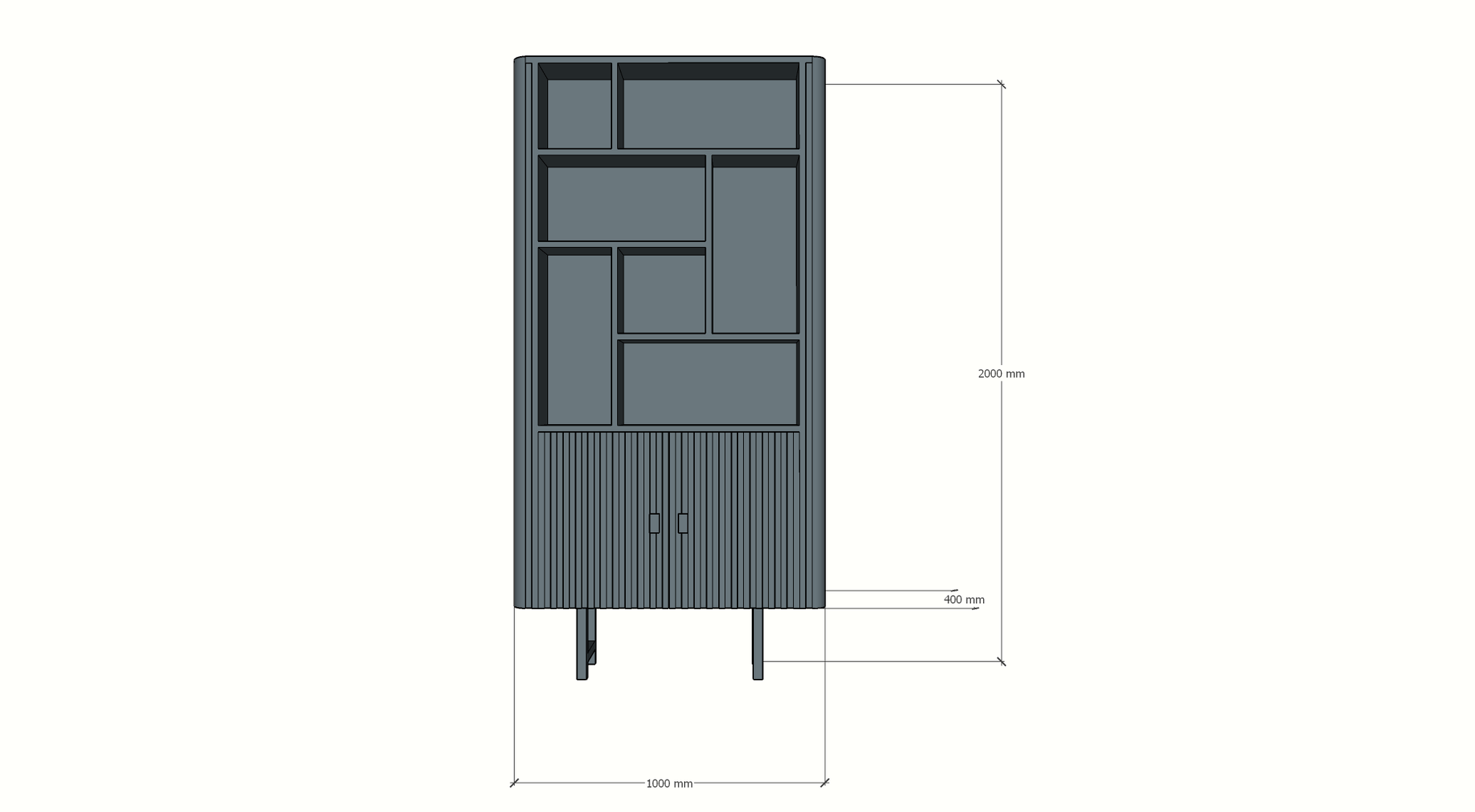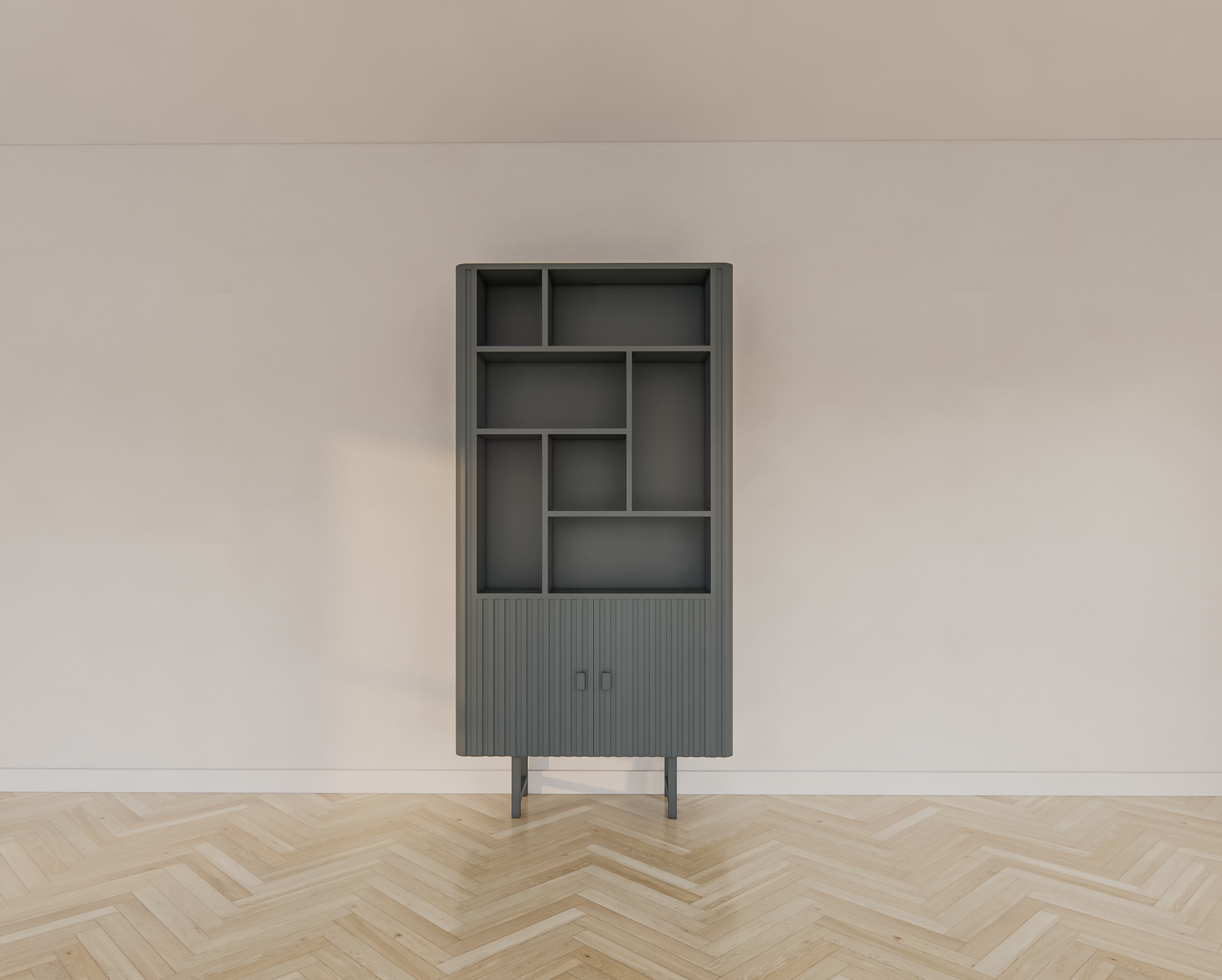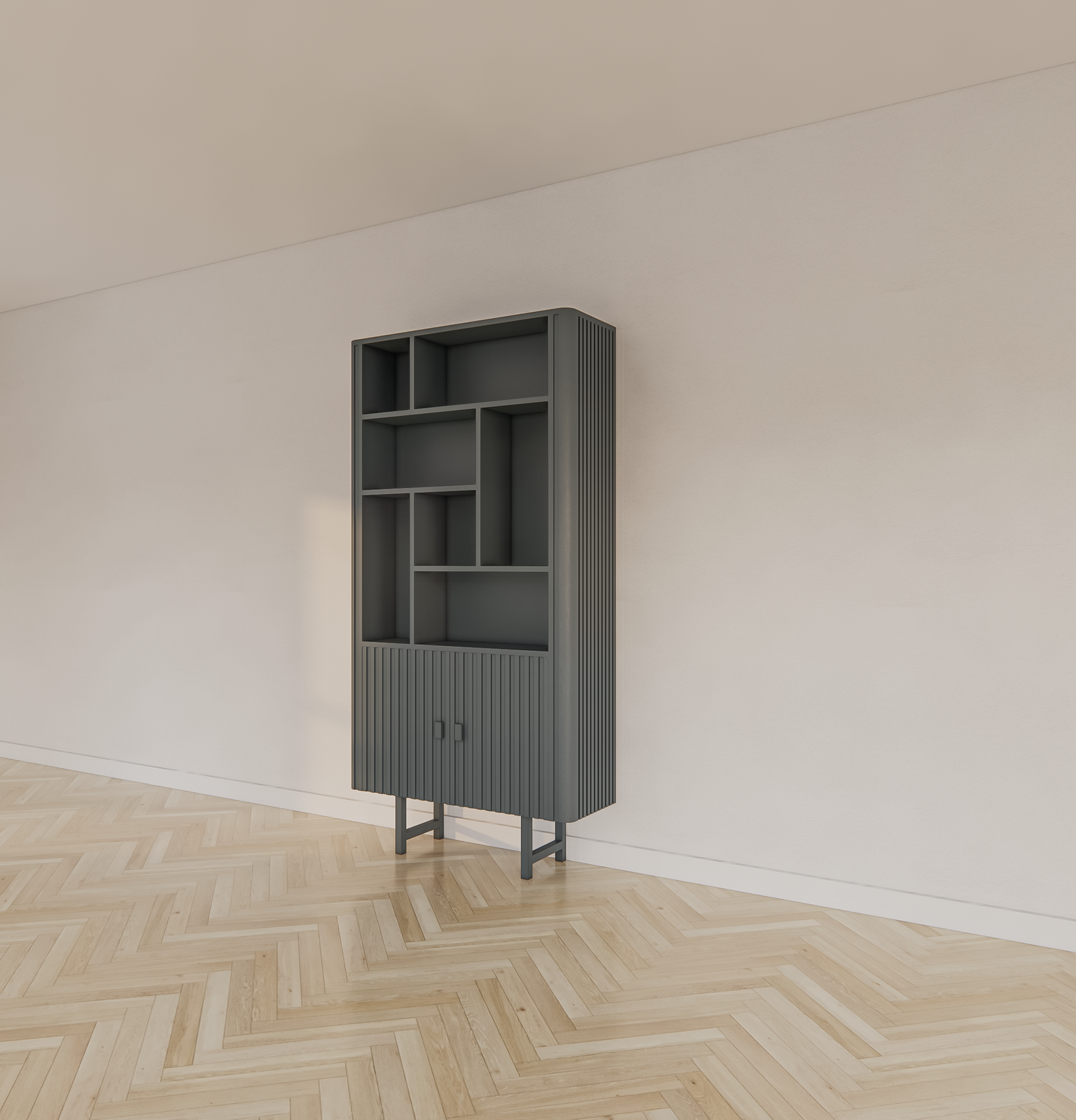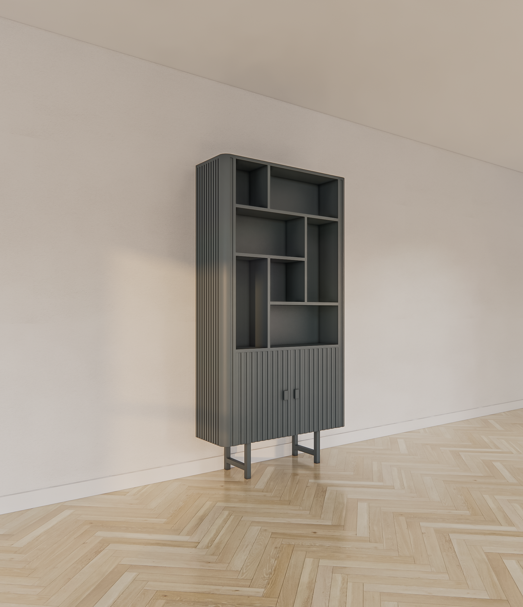 Das Design des Fächerschranks Derby kombiniert eine saubere Verarbeitung mit einem industriellen Touch, was ihn zu einem auffälligen Möbelstück macht, das sowohl in moderne als auch in klassische Innenräume perfekt passt. Die offenen Fächer bieten vielseitige Möglichkeiten zur Präsentation von Dekorationsartikeln, Büchern oder persönlichen Sammlungen, während die Flügeltüren zusätzlichen Stauraum für Gegenstände bieten, die außer Sichtweite aufbewahrt werden müssen.