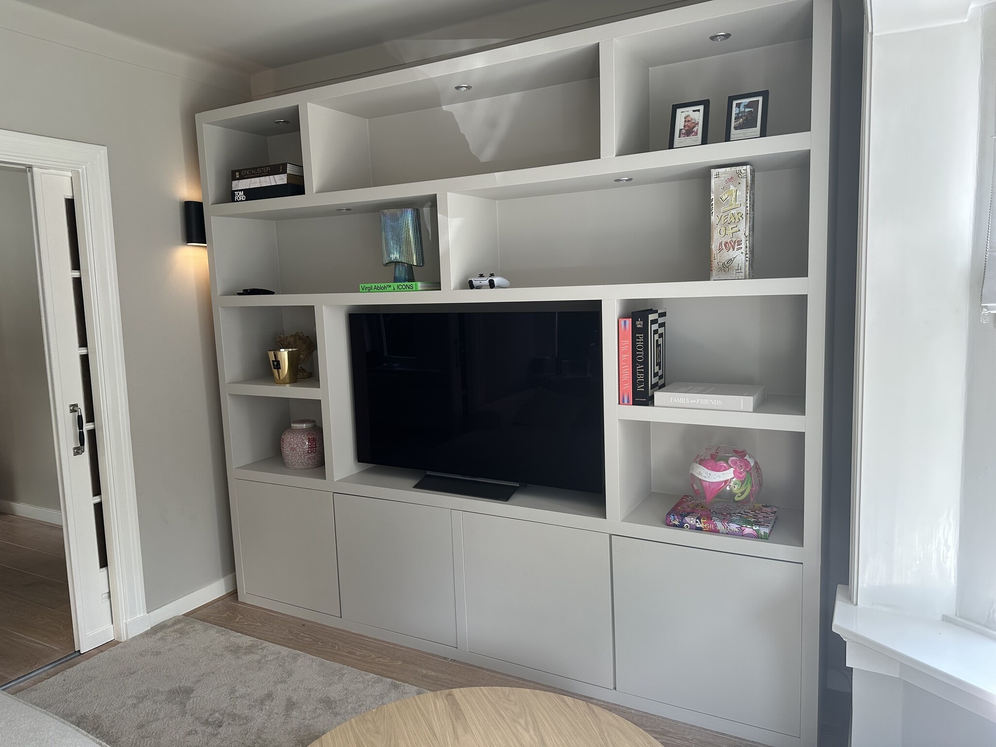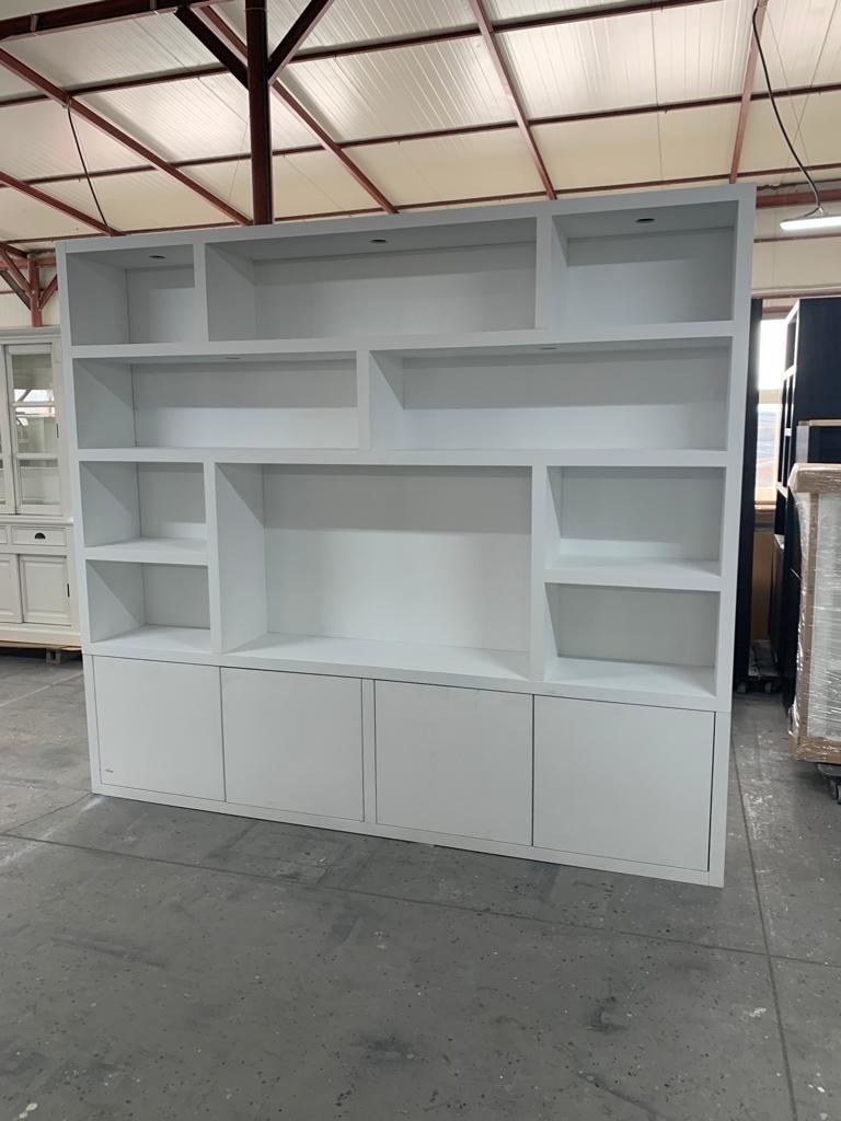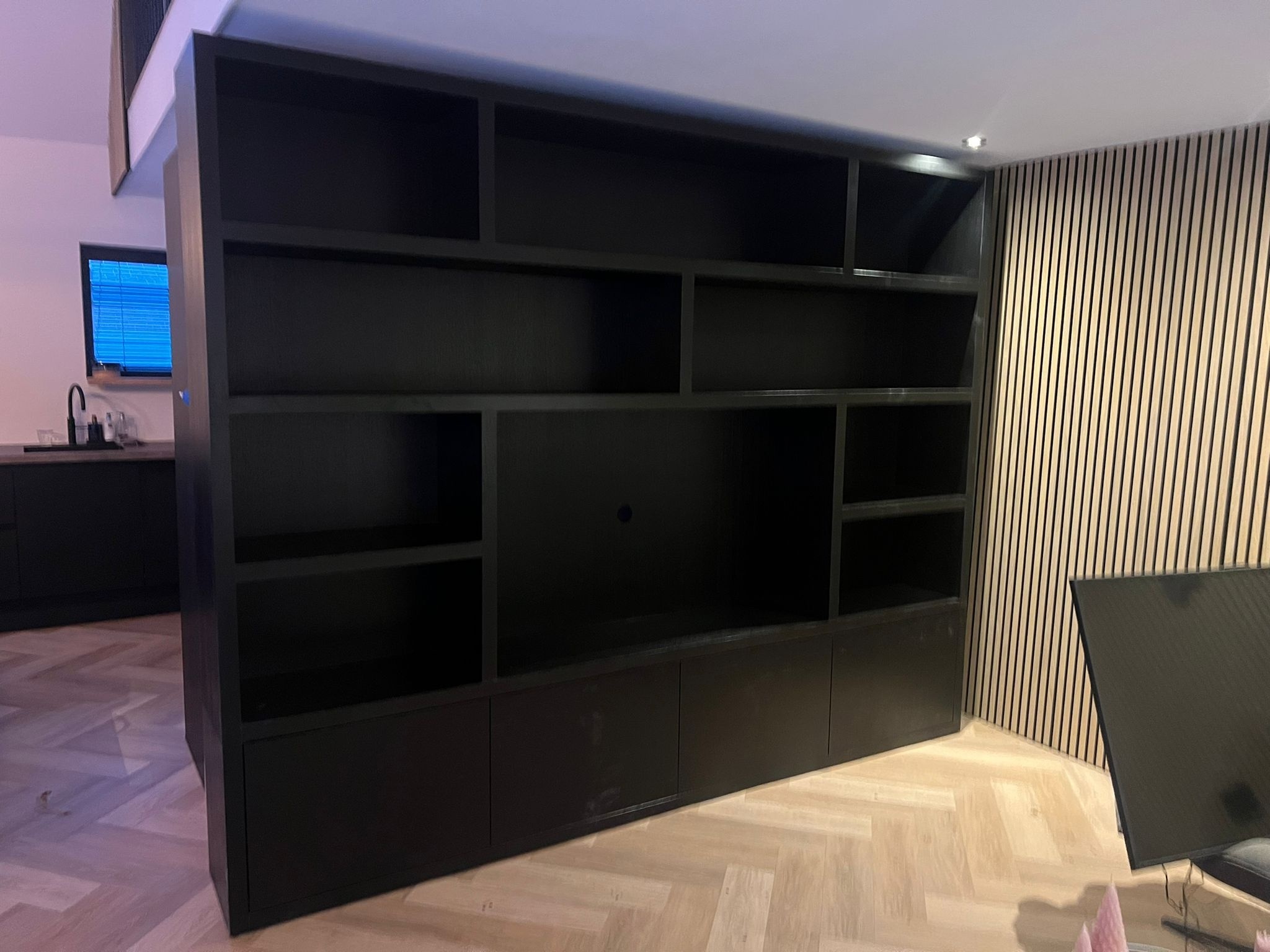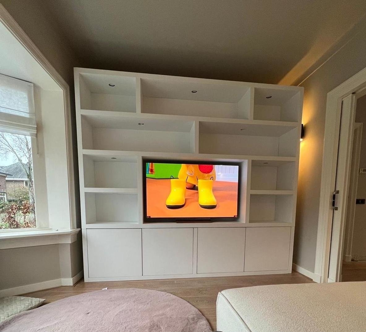 Unser schöner Fächerschrank Milan ist 300cm breit, 40cm tief und 240cm hoch und eignet sich perfekt zur Aufbewahrung all Ihrer Sachen. Der Schrank hat verschiedene Größen von offenen Fächern und in der Mitte befindet sich ein TV-Paneel, auf dem Sie Ihren Fernseher platzieren können, mit einem Loch in der Mitte für die Verkabelung des Fernsehers. Die vier Türen sind grifflos und sorgen für einen eleganten und modernen Look. Dieser stilvolle Schrank ist ein echter Blickfang in jedem Raum. Bestellen Sie das Regal Milan in einer RAL-Farbe Ihrer Wahl!