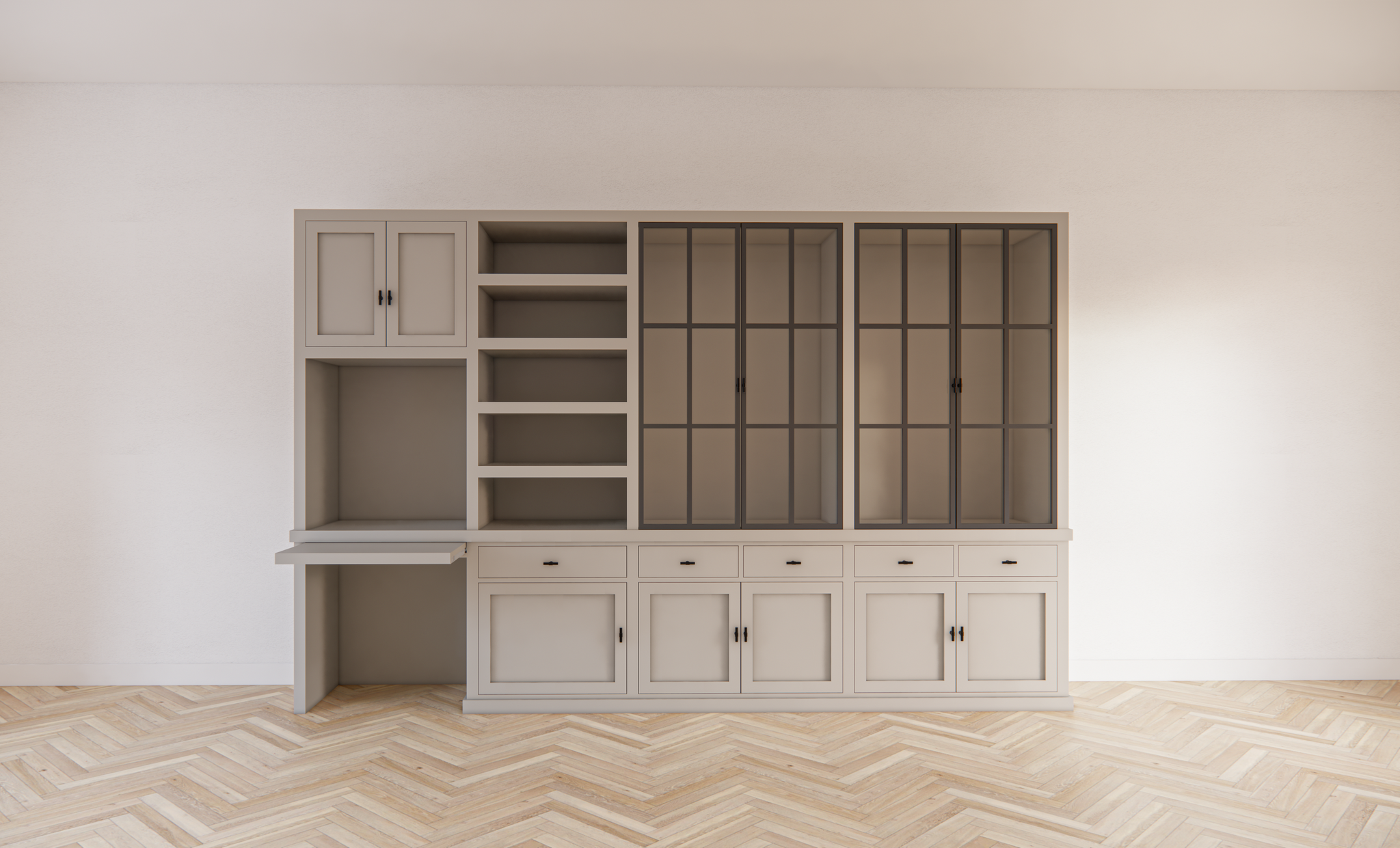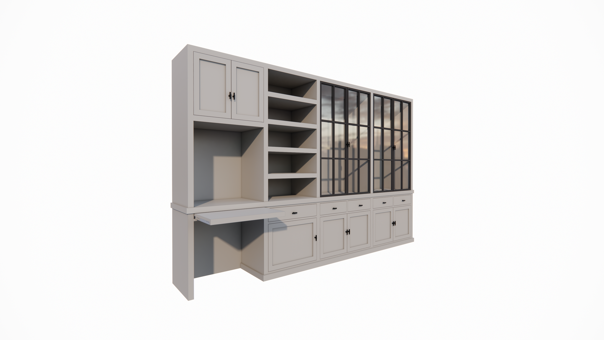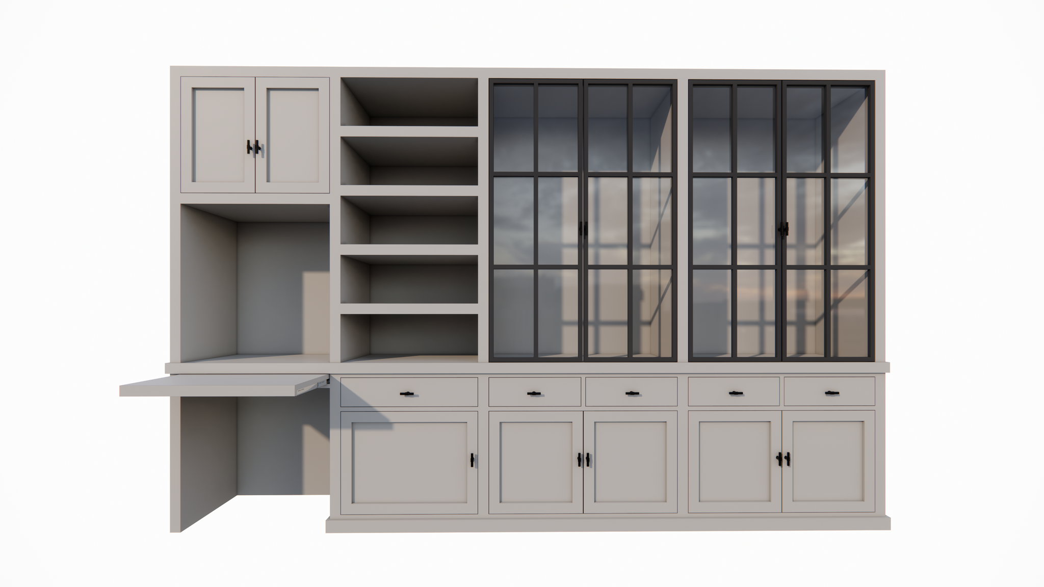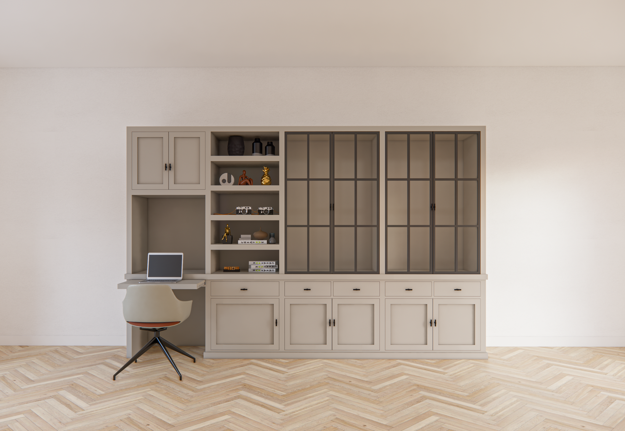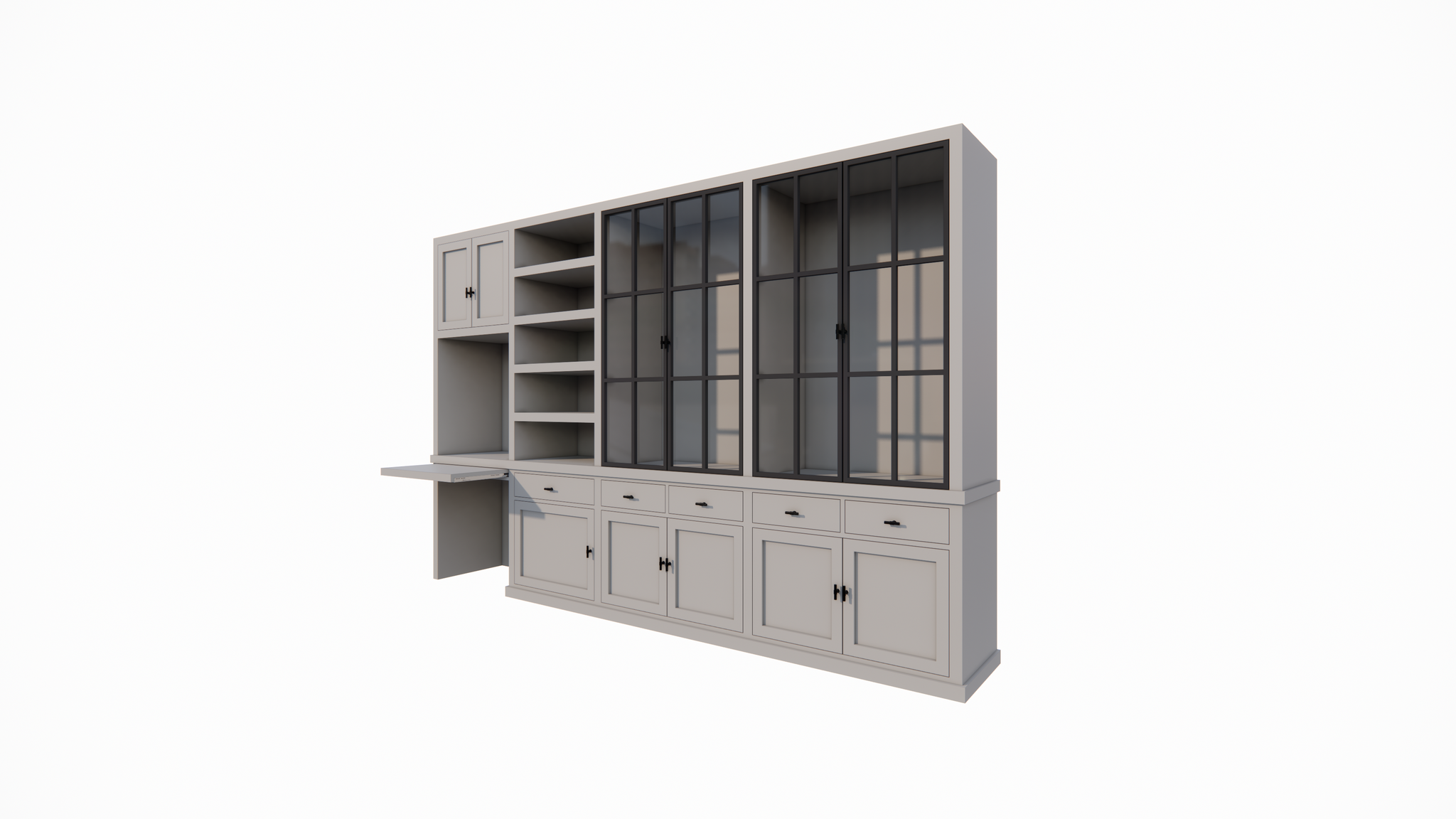 Der Desk Buffet Cabinet Kansas ist ein vielseitiges und stilvolles Möbelstück, das perfekt in eine moderne, industrielle Einrichtung passt. Mit seinen geräumigen Maßen von 340x50x220H cm bietet der Schrank sowohl funktionalen Stauraum als auch einen eleganten Look. Der Schrank verfügt über ein Schreibtischfach mit ausziehbarem Regal, das sich ideal für die Organisation von Arbeitsmaterialien oder als praktischer Arbeitsplatz eignet. Das offene Bücherregal bietet Platz für Bücher, Dekoration oder andere persönliche Gegenstände und macht den Schrank sowohl praktisch als auch dekorativ.