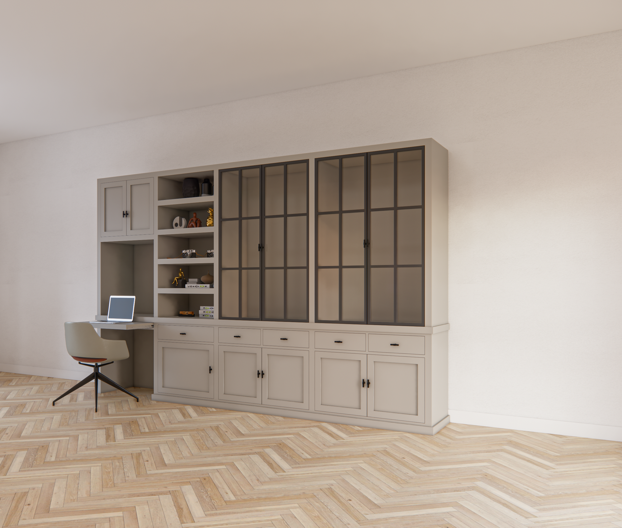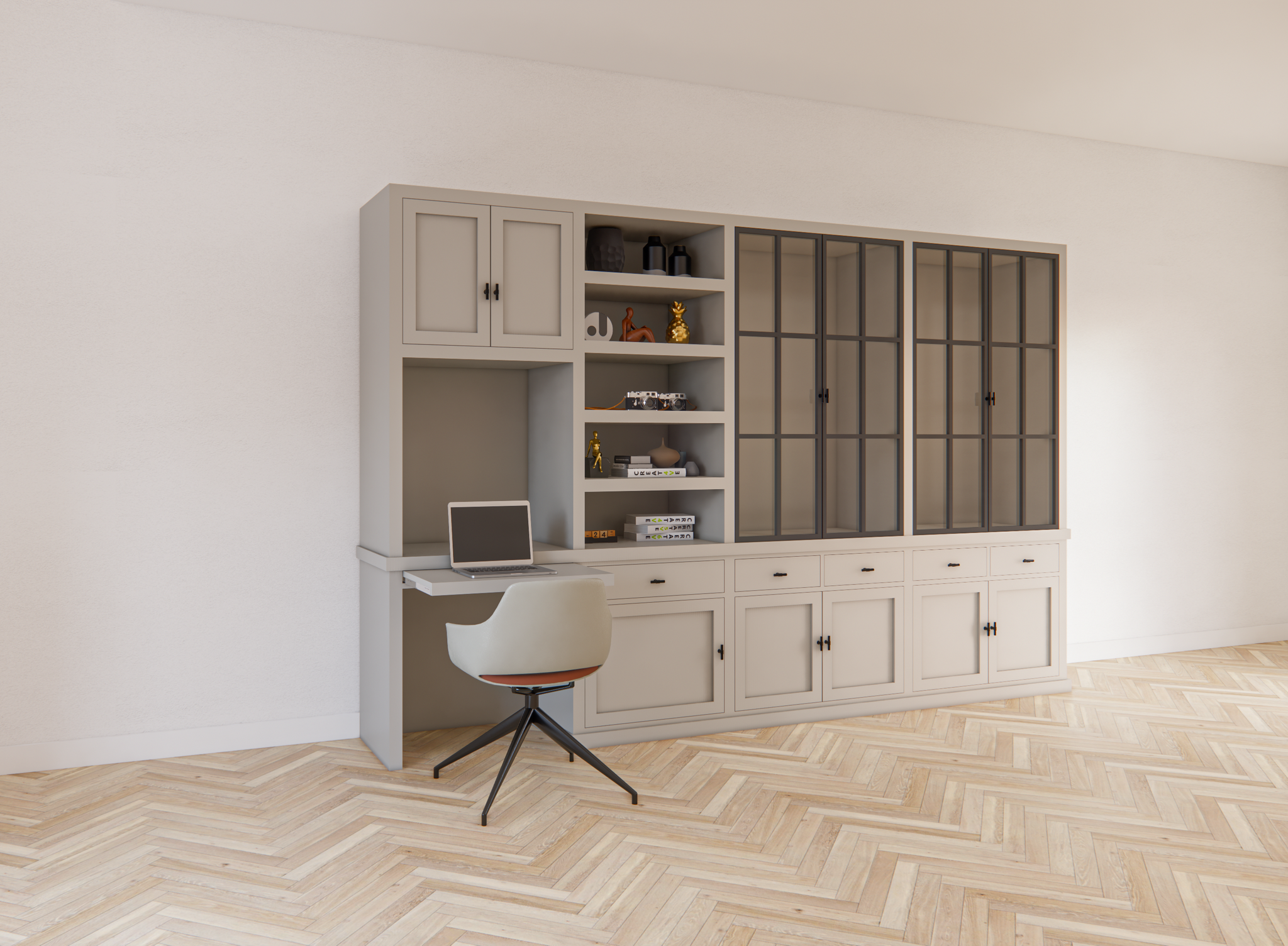 Schreibtisch-Sideboard Kansas - 340x50x220H cm - mit Stahltüren - Schreibtischfach mit ausziehbarem Fachboden - offenes Bücherregal