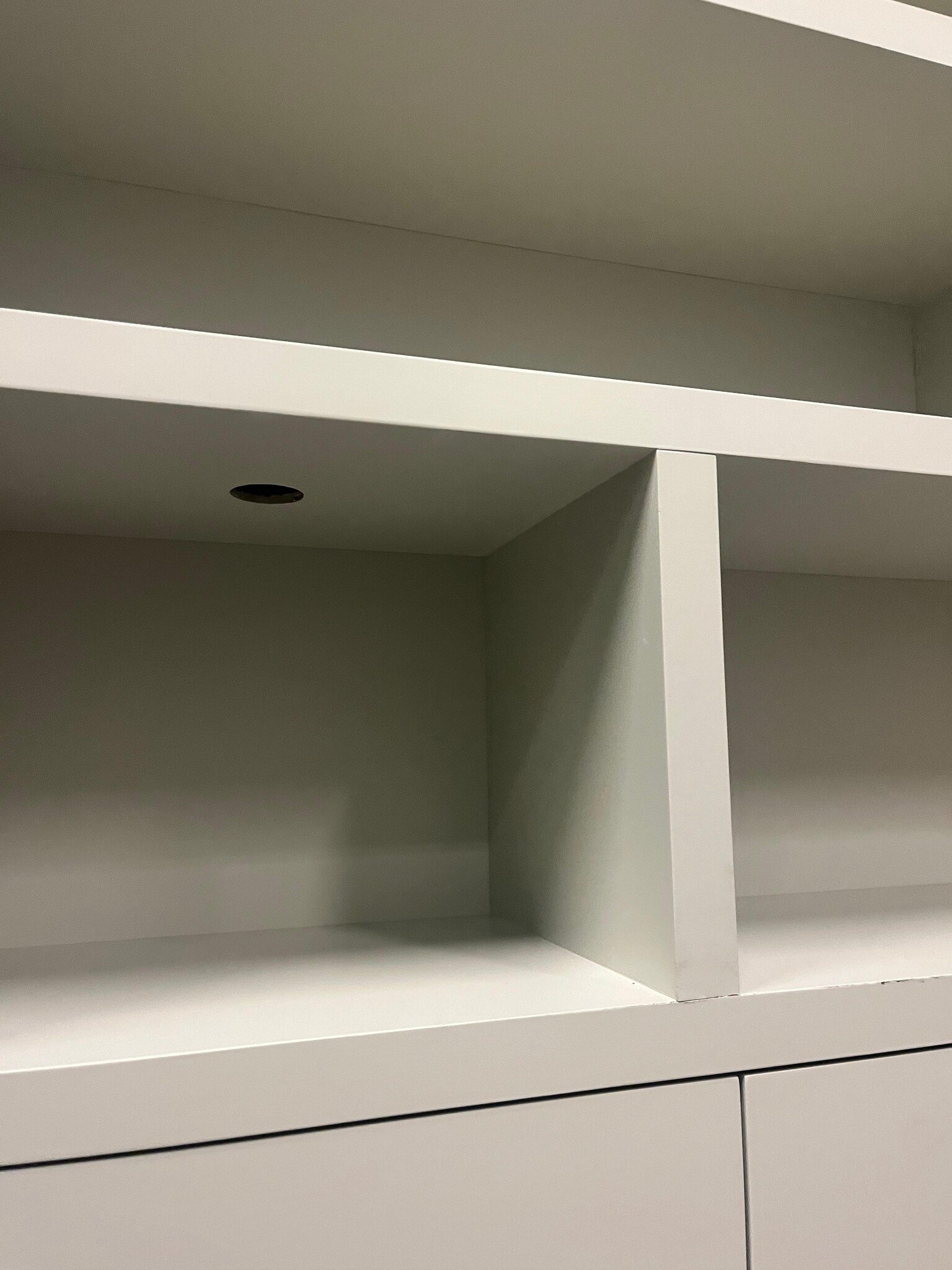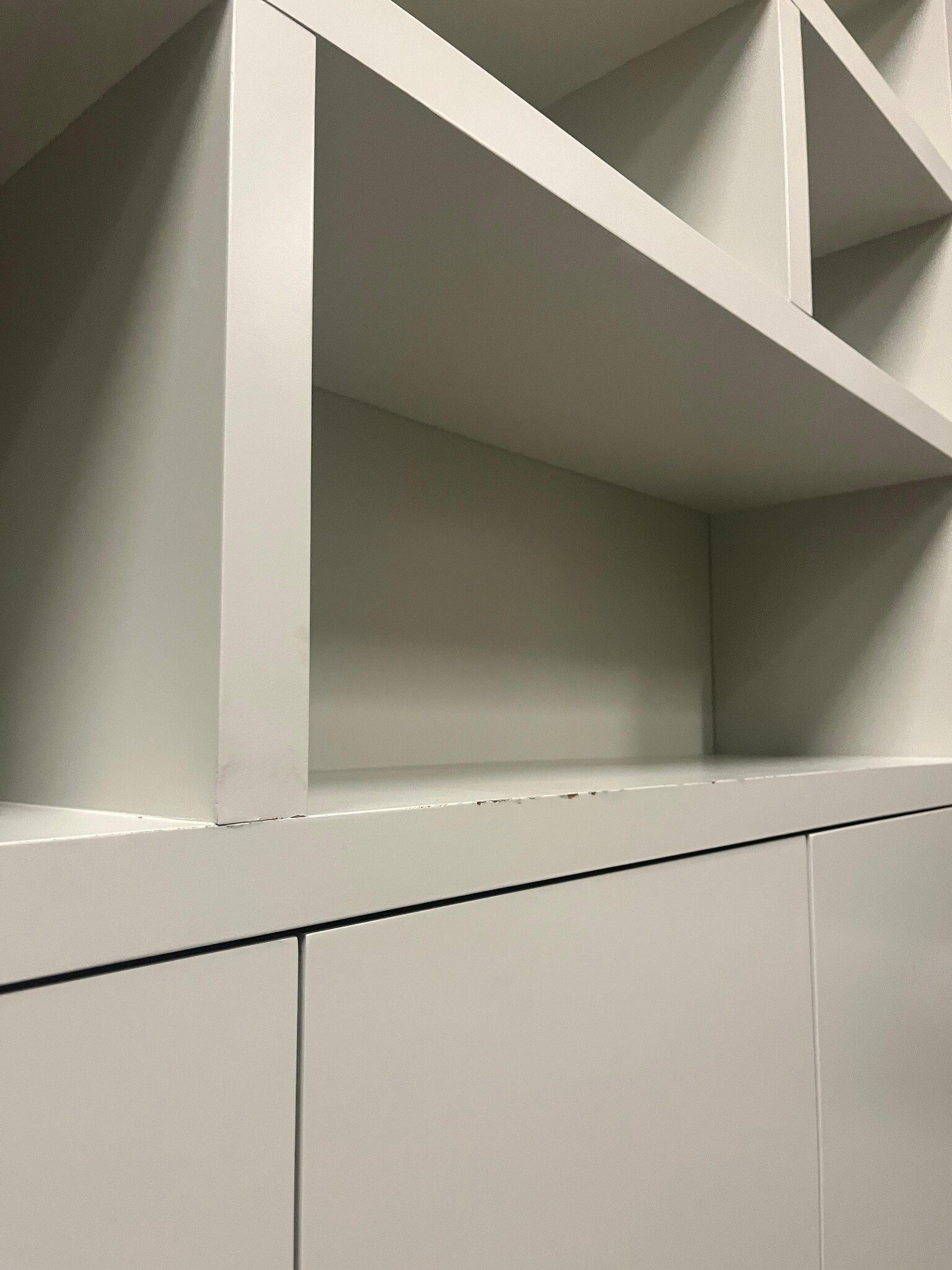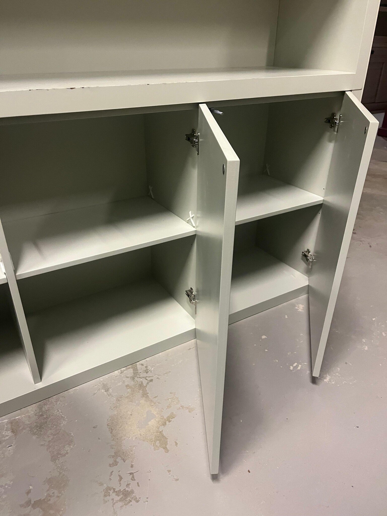 Der Schrank hat einige kleinere Beschädigungen, die kaum auffallen, aber bei näherer Betrachtung sichtbar sind. Trotz dieser Schäden ist der Schrank ansonsten in einem sehr guten Zustand und ist eine schöne Ergänzung für jede Einrichtung. Der Schrank hat außerdem unten links ein Fach für einen Strahler. Sie können einen Strahler für 85 € dazu kaufen oder einen Strahler Ihrer Wahl einbauen.