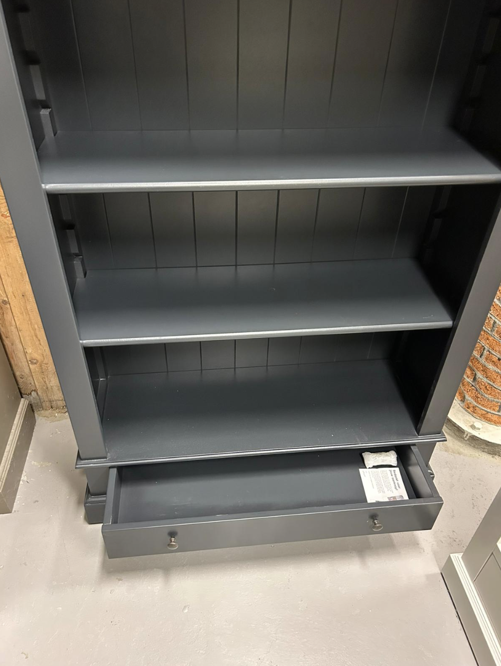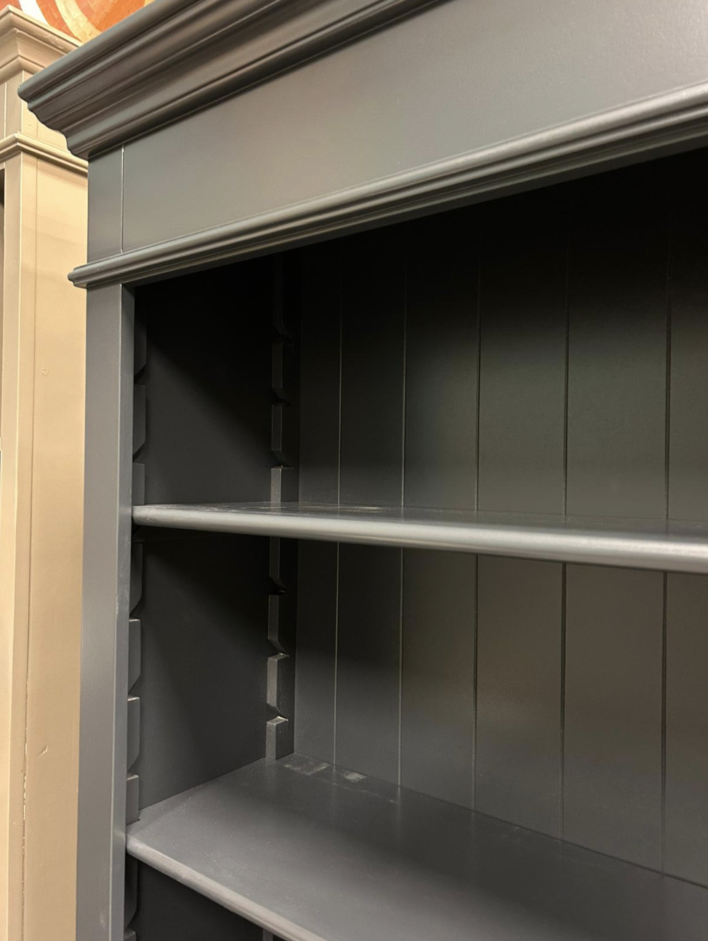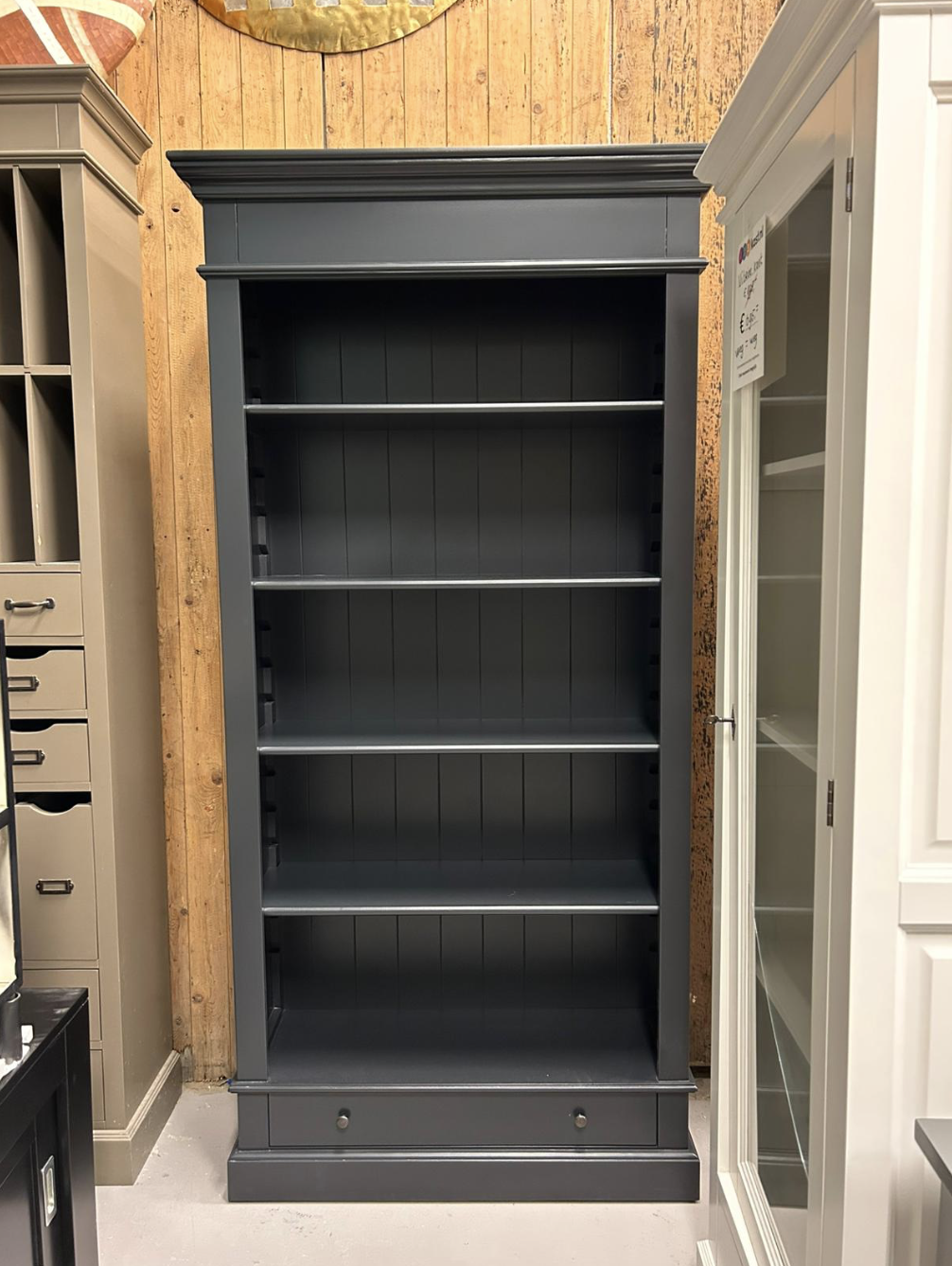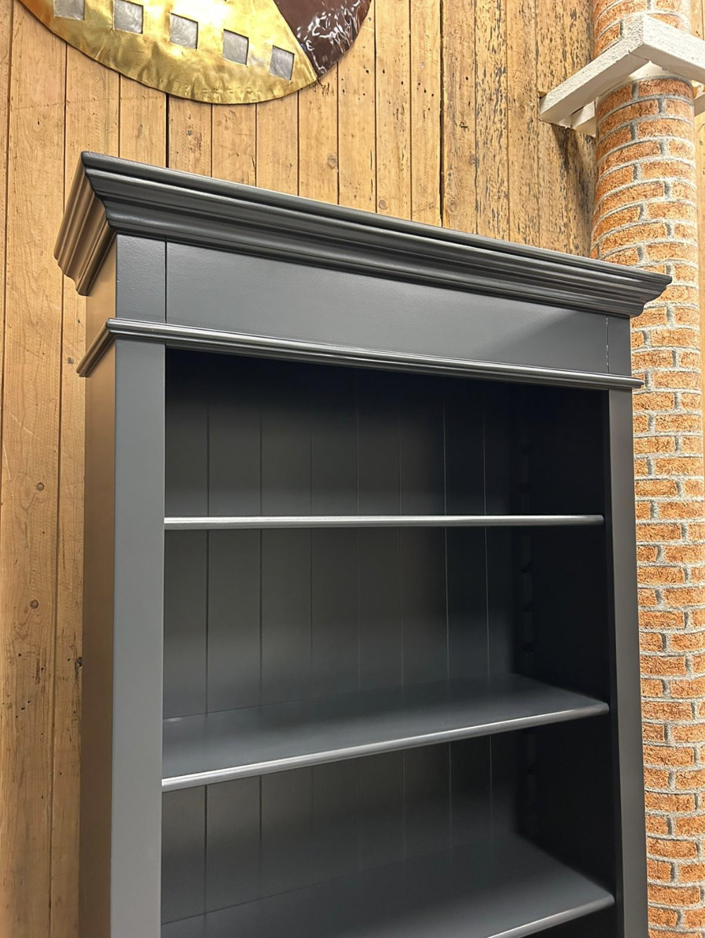 Der Schrank verfügt über mehrere offene Fächer, die perfekt geeignet sind, um Büchern, Dekorationsobjekten oder Wohnaccessoires einen prominenten Platz zu geben. Das schlichte Design und die tiefe, warme Farbe sorgen für einen modernen, aber dennoch stimmungsvollen Look, der sowohl in Landhaus- als auch in zeitgenössischen Interieurs gut aussieht.