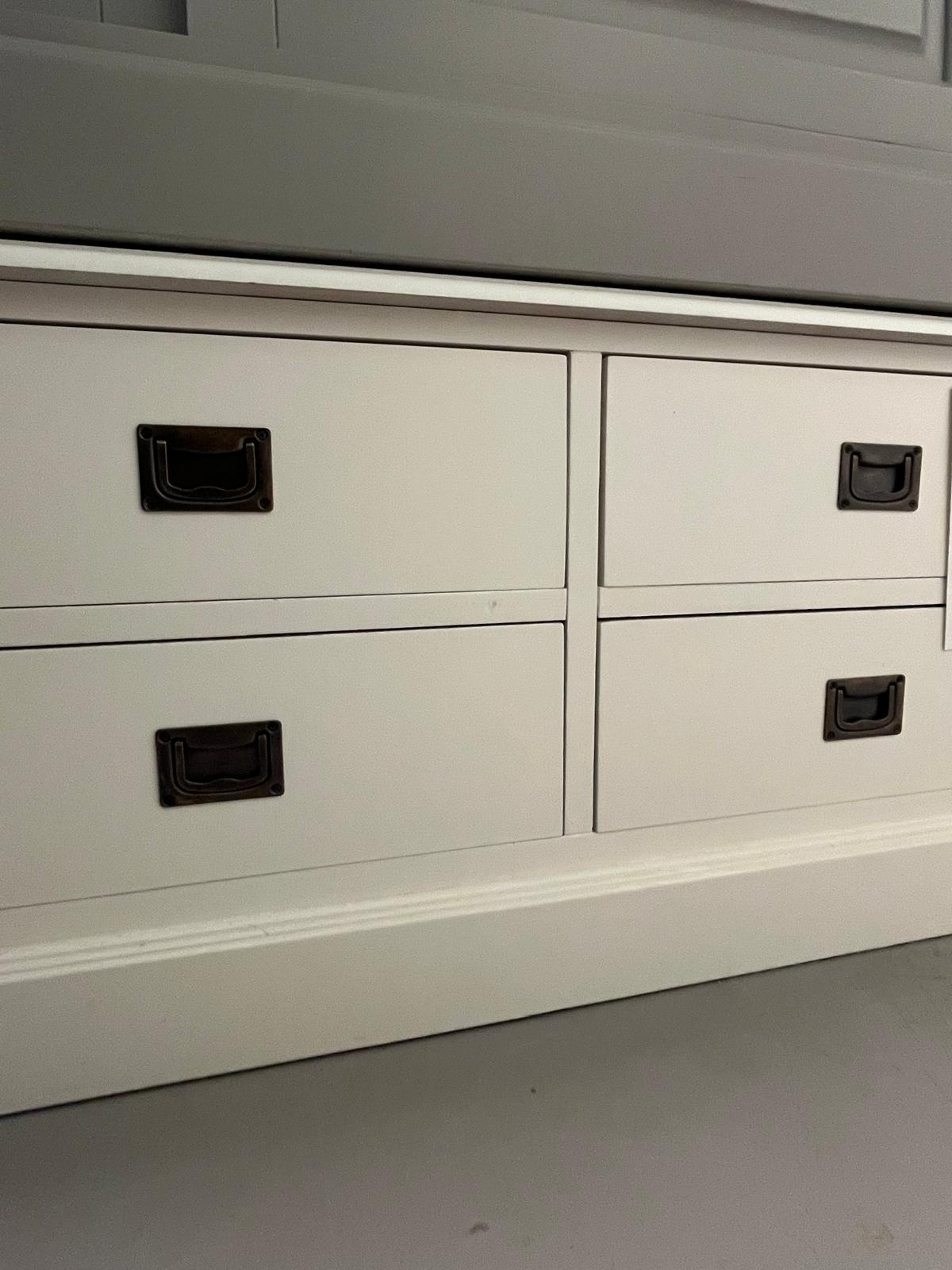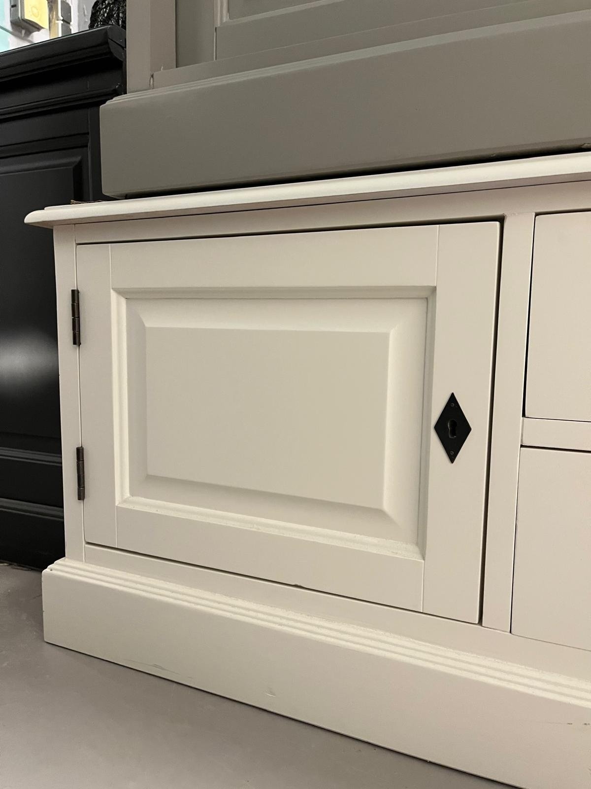 Das Lin 08 Sideboard ist ein stilvolles Möbelstück, das jedem Interieur Wärme und Charakter verleiht. In RAL 9001 (cremeweiß) gehalten, mit Zierleisten und bronzefarbenen Beschlägen versehen, strahlt dieses Sideboard einen klassischen Landhausstil aus. Dank der Kombination aus Schubladen und Flügeltüren bietet das Möbel viel Stauraum für Geschirr, Wohnaccessoires oder andere Dinge.