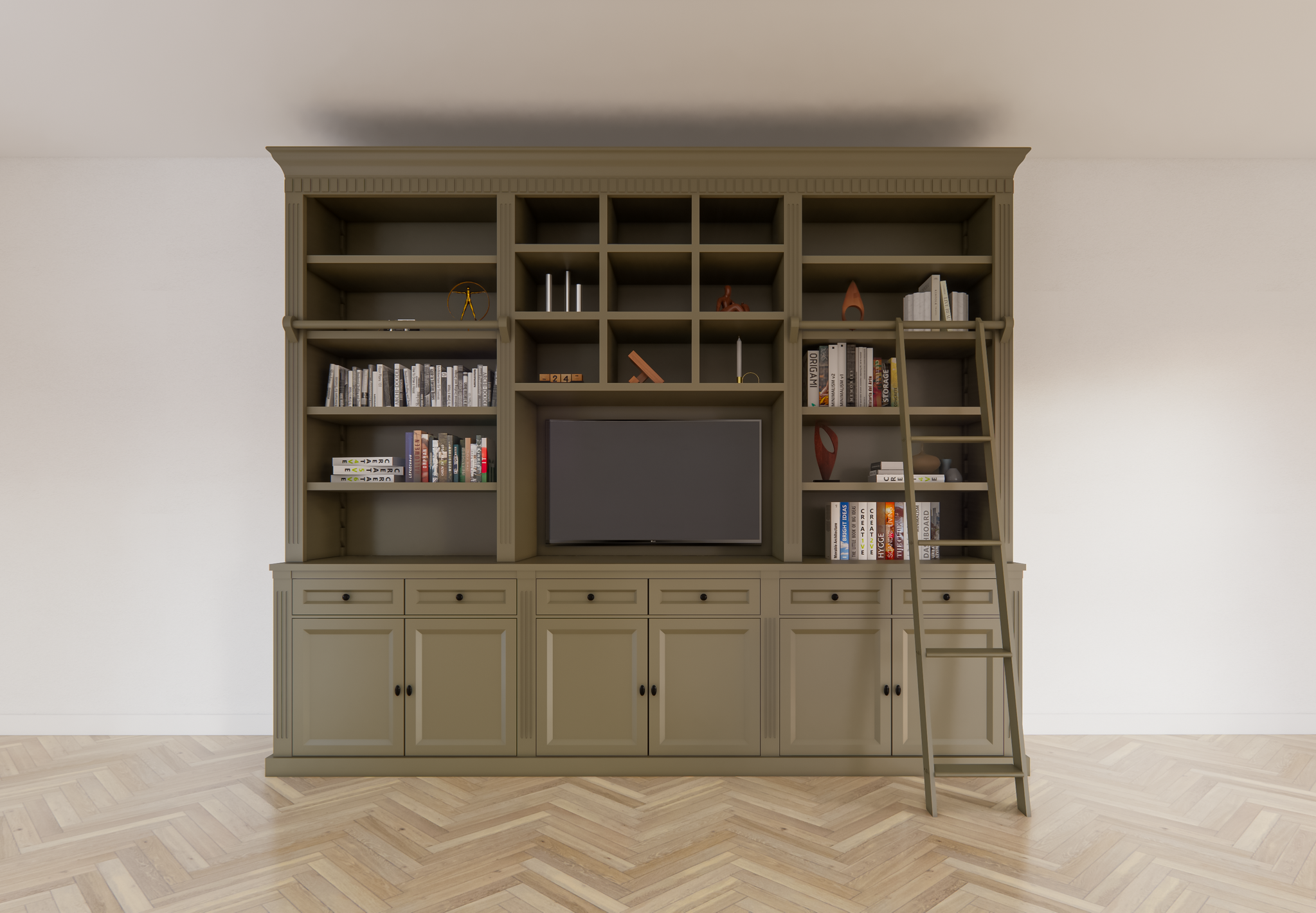 Die Crown Library ist ein beeindruckendes TV-Bücherregal, das Ruhe und Eleganz ausstrahlt und vom Charme ländlicher Interieurs inspiriert ist. Dieser Schrank kombiniert stilvoll offene Bücherregale, ein geräumiges TV-Fach und klassische Unterschränke mit zeitlosem Charme.