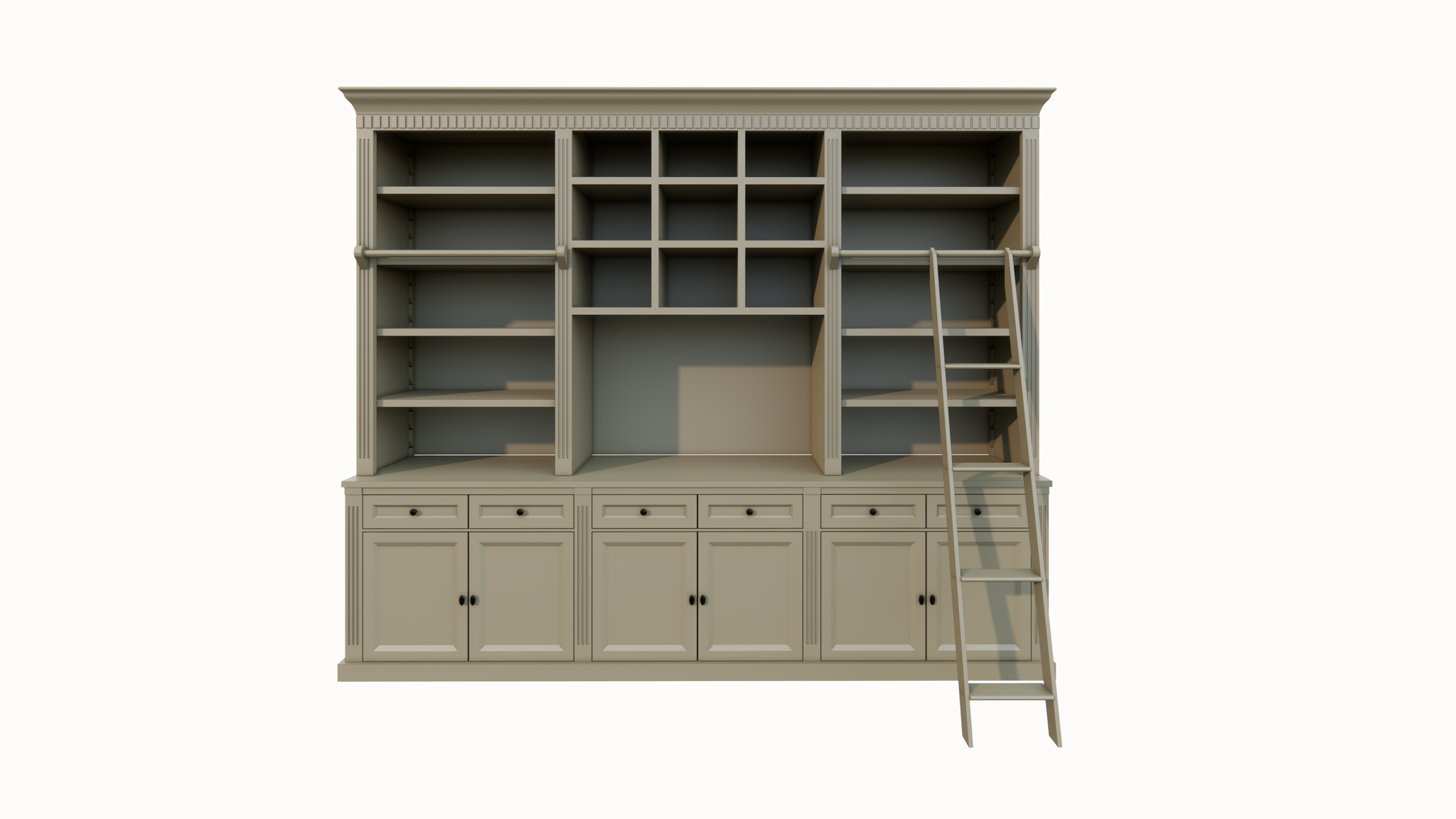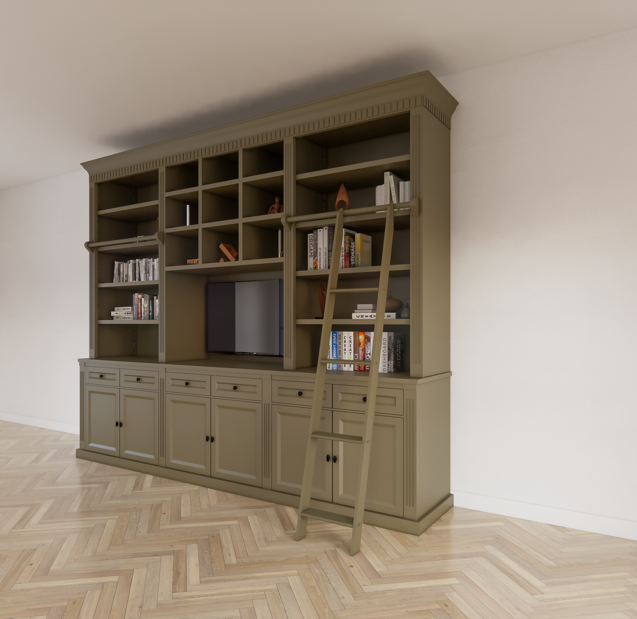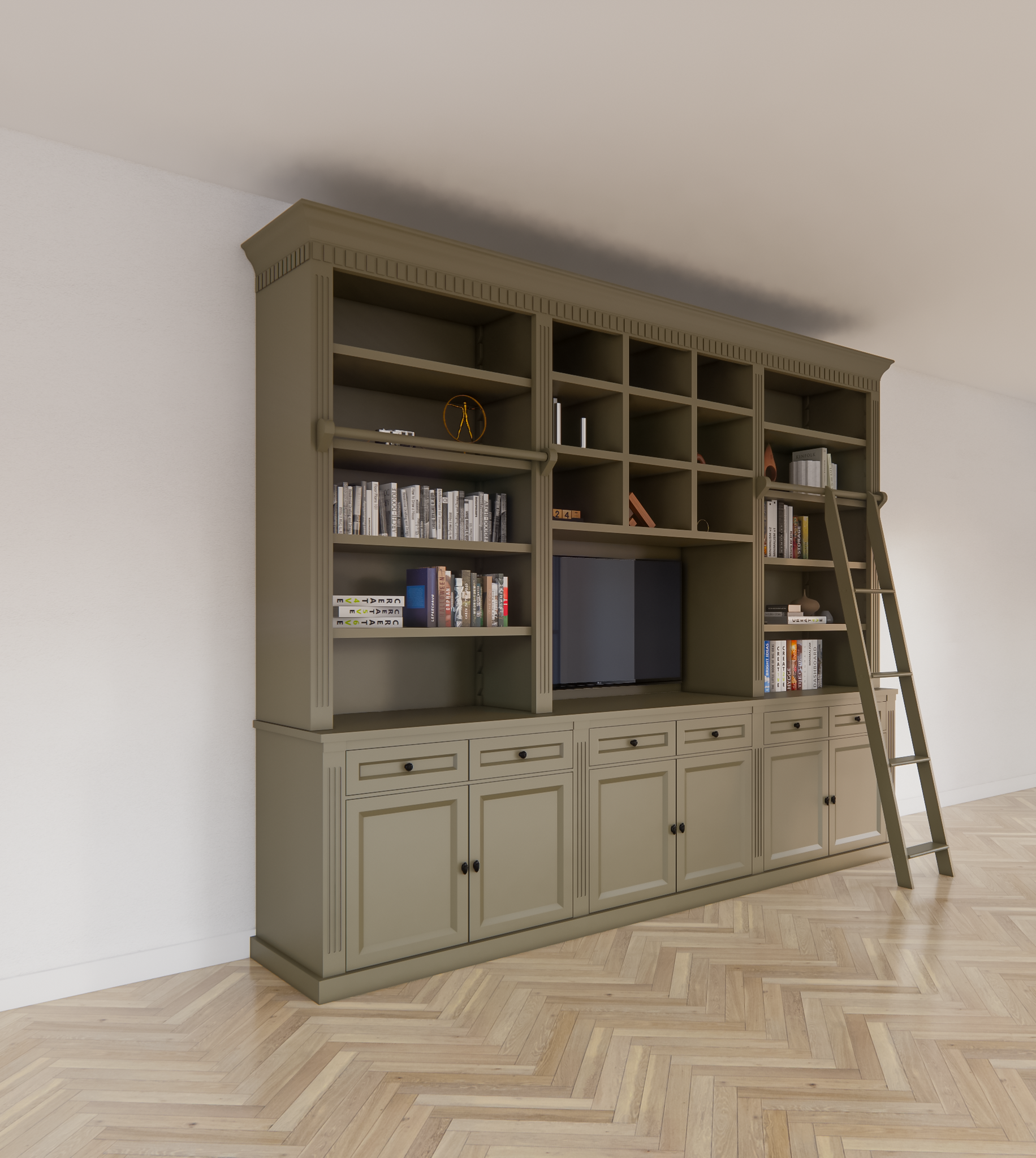 Das Gesims, die verschnörkelten Säulendetails und die vertäfelten Türen sorgen für einen klassischen und rustikalen Look, während die schlichte Unterteilung in Fächer und die grifflose Ausführung für einen modernen Twist sorgen. Die passende Holzleiter, die an einer festen Stange befestigt ist, macht nicht nur höhere Bücher zugänglich, sondern verleiht dem Schrank auch sein unverwechselbares Bibliotheksgefühl.