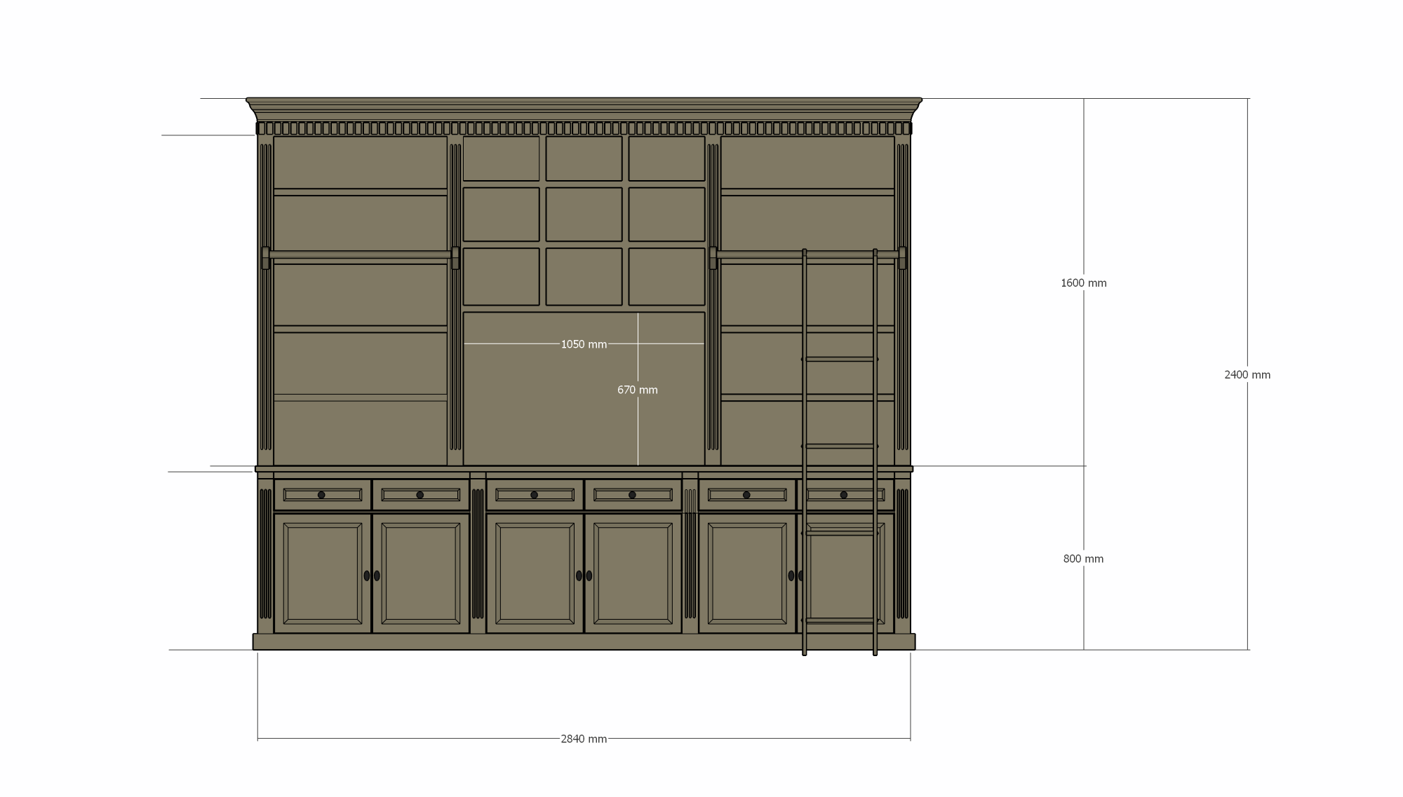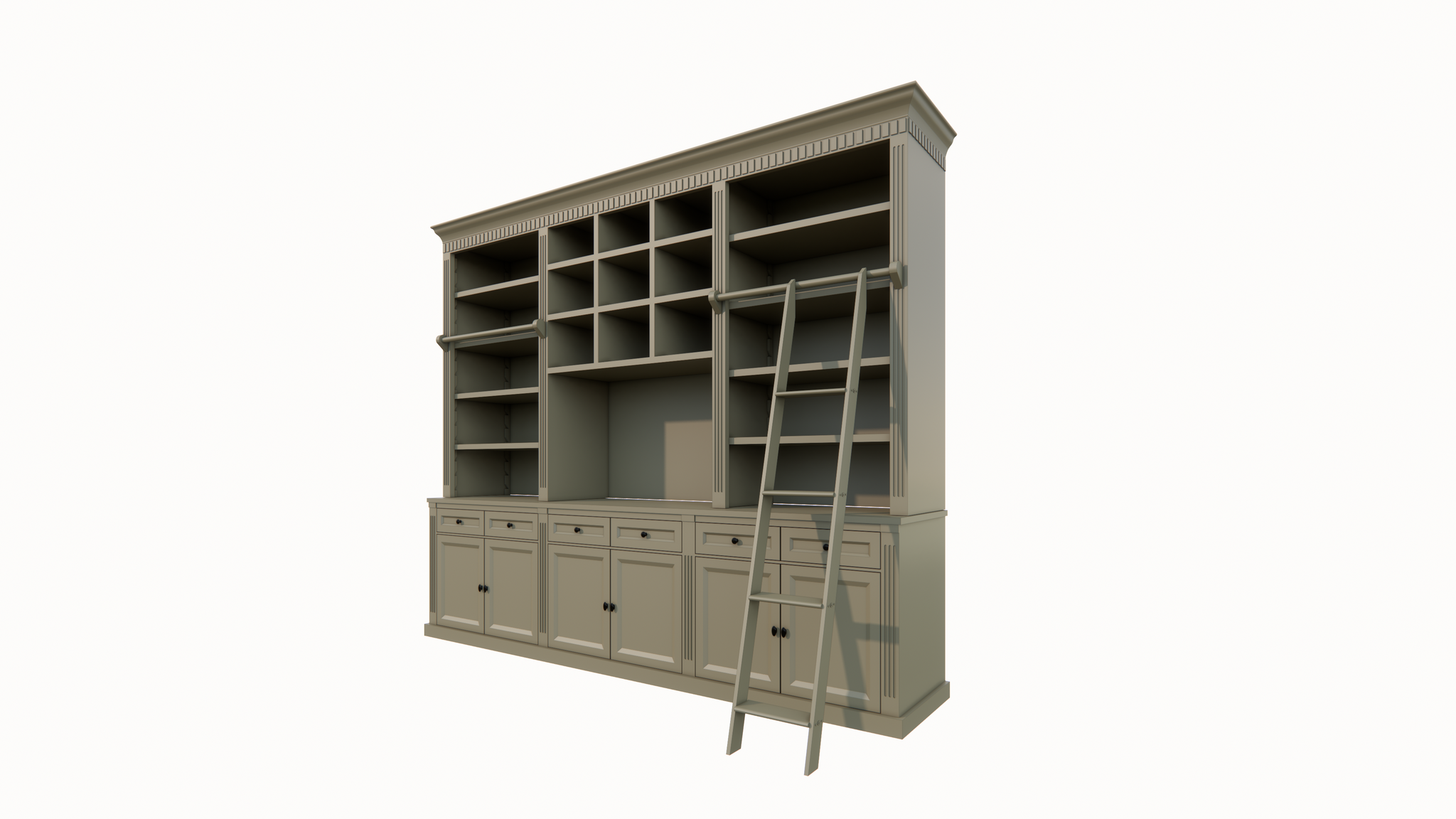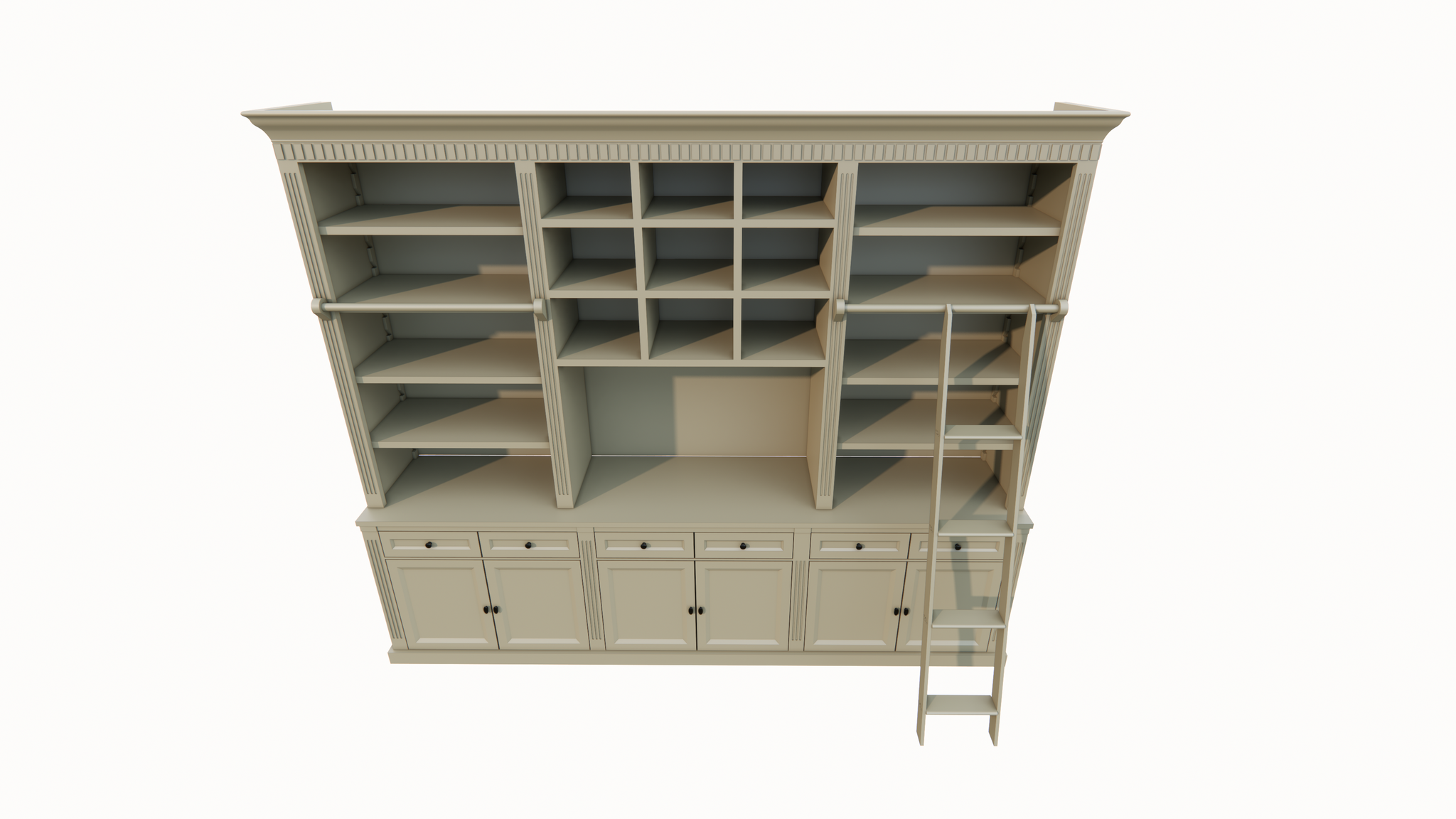 Das Gesims, die verschnörkelten Säulendetails und die vertäfelten Türen sorgen für einen klassischen und rustikalen Look, während die schlichte Unterteilung in Fächer und die grifflose Ausführung für einen modernen Twist sorgen. Die passende Holzleiter, die an einer festen Stange befestigt ist, macht nicht nur höhere Bücher zugänglich, sondern verleiht dem Schrank auch sein unverwechselbares Bibliotheksgefühl.
