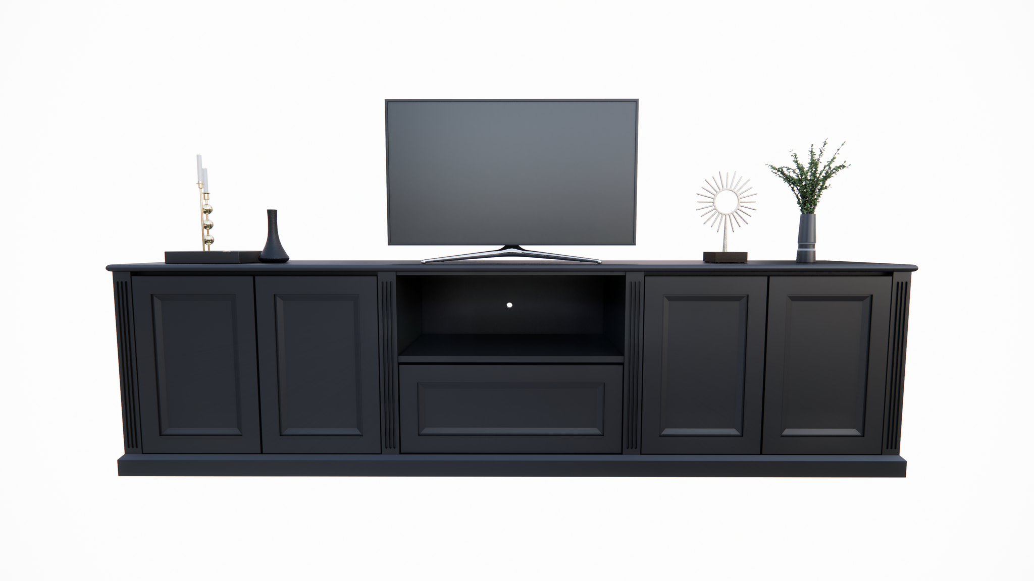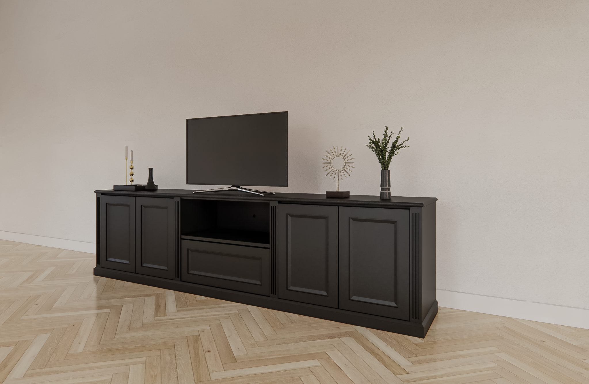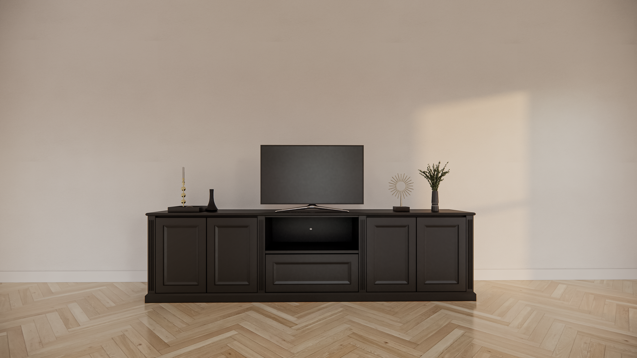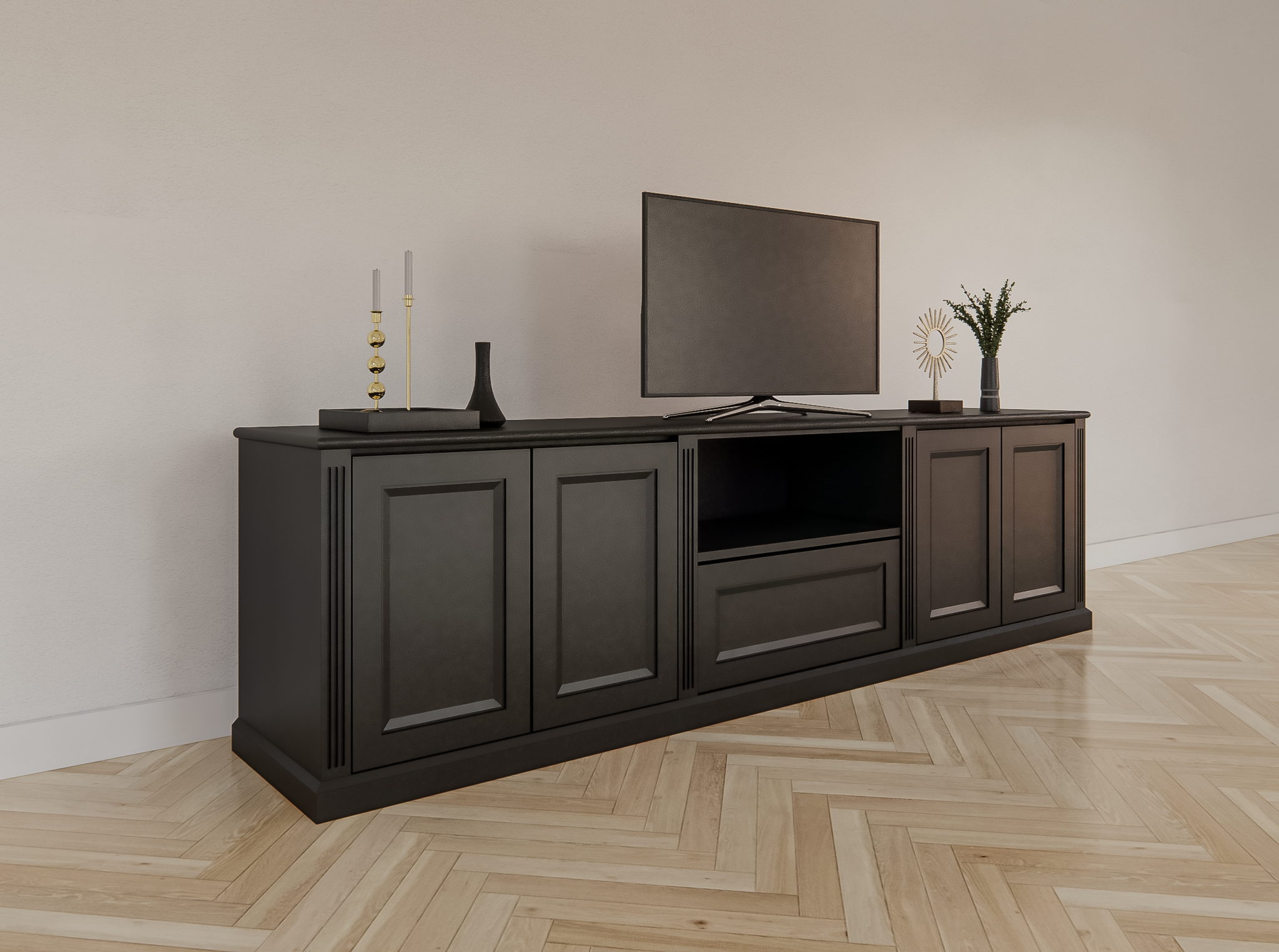 Ausgestattet mit vier grifflosen Türen und einer praktischen Schublade bietet das Amalfi TV-Sideboard viel Stauraum, während das offene Fach in der Mitte perfekt ist, um dekorative Objekte auszustellen oder Medienboxen zu platzieren.