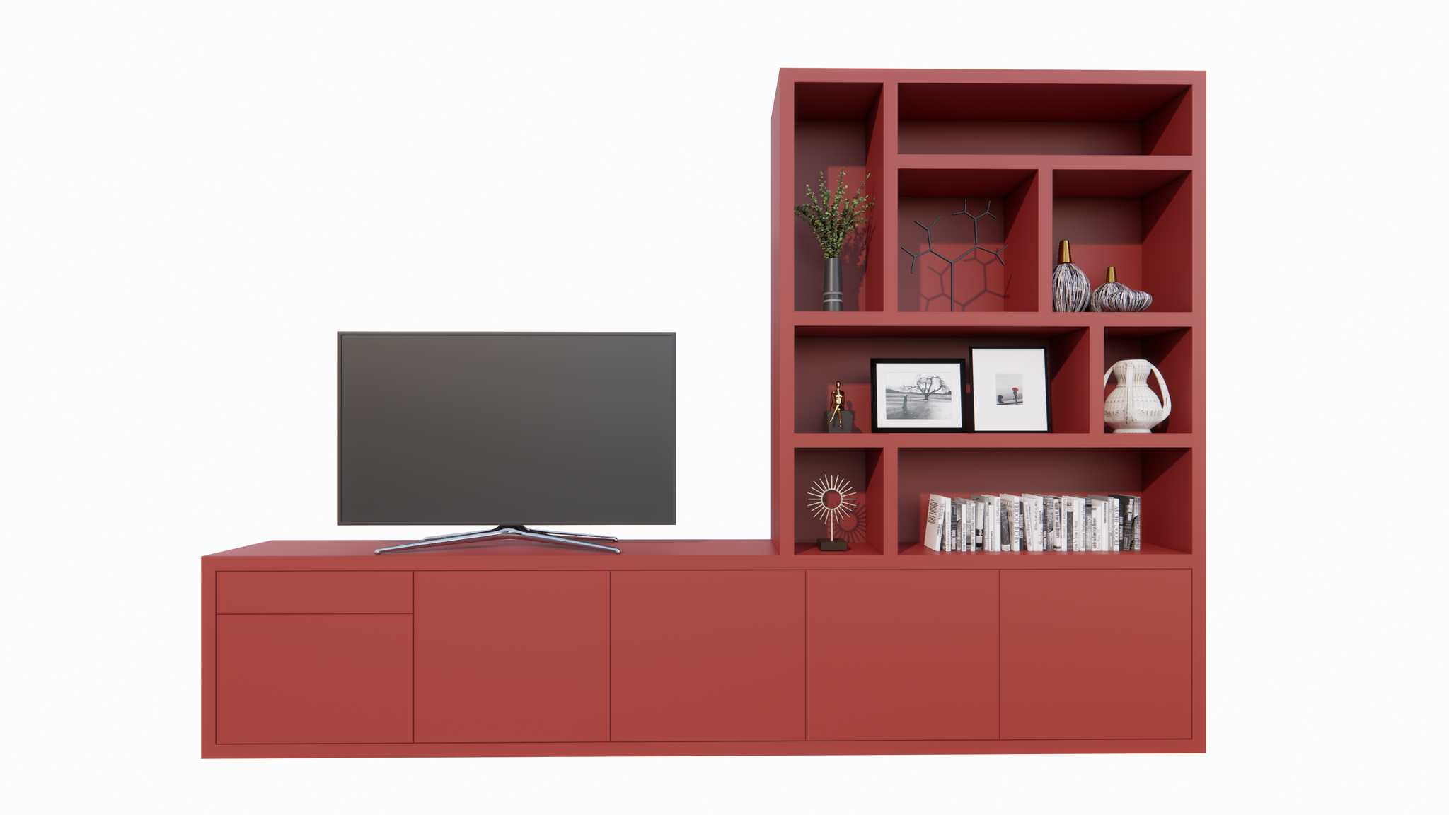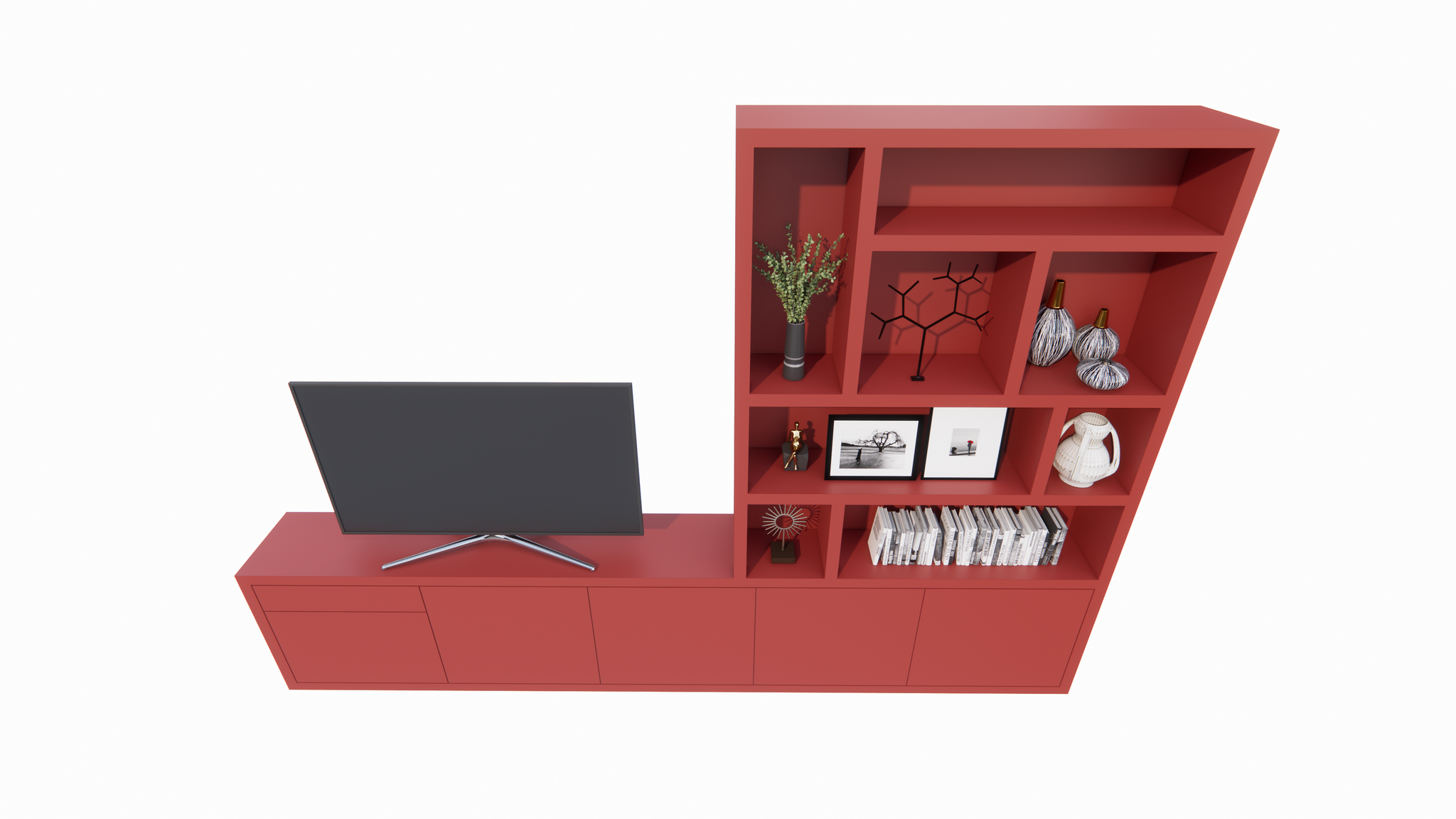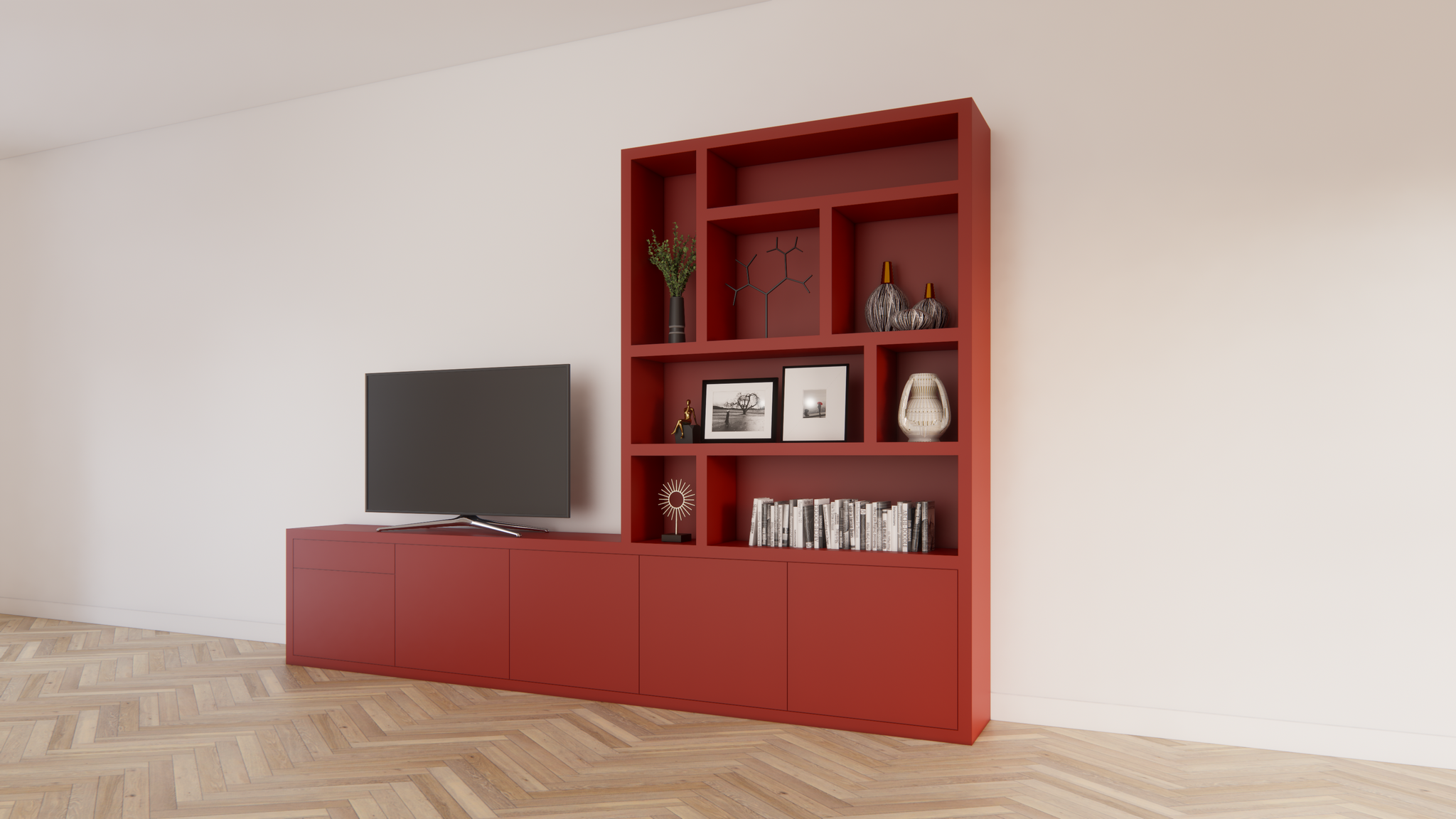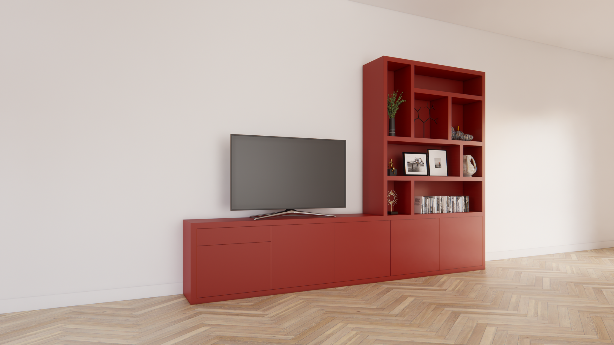 Das Limoges ist ein modernes TV-Sideboard kombiniert mit einem verspielten offenen Fächerbereich. Mit seinen großzügigen Maßen von 350 cm Breite, 40 cm Tiefe und 240 cm Höhe bietet dieser Schrank nicht nur Platz für Fernseher und Geräte, sondern auch viel Raum für Bücher, Kunst oder Dekoration.