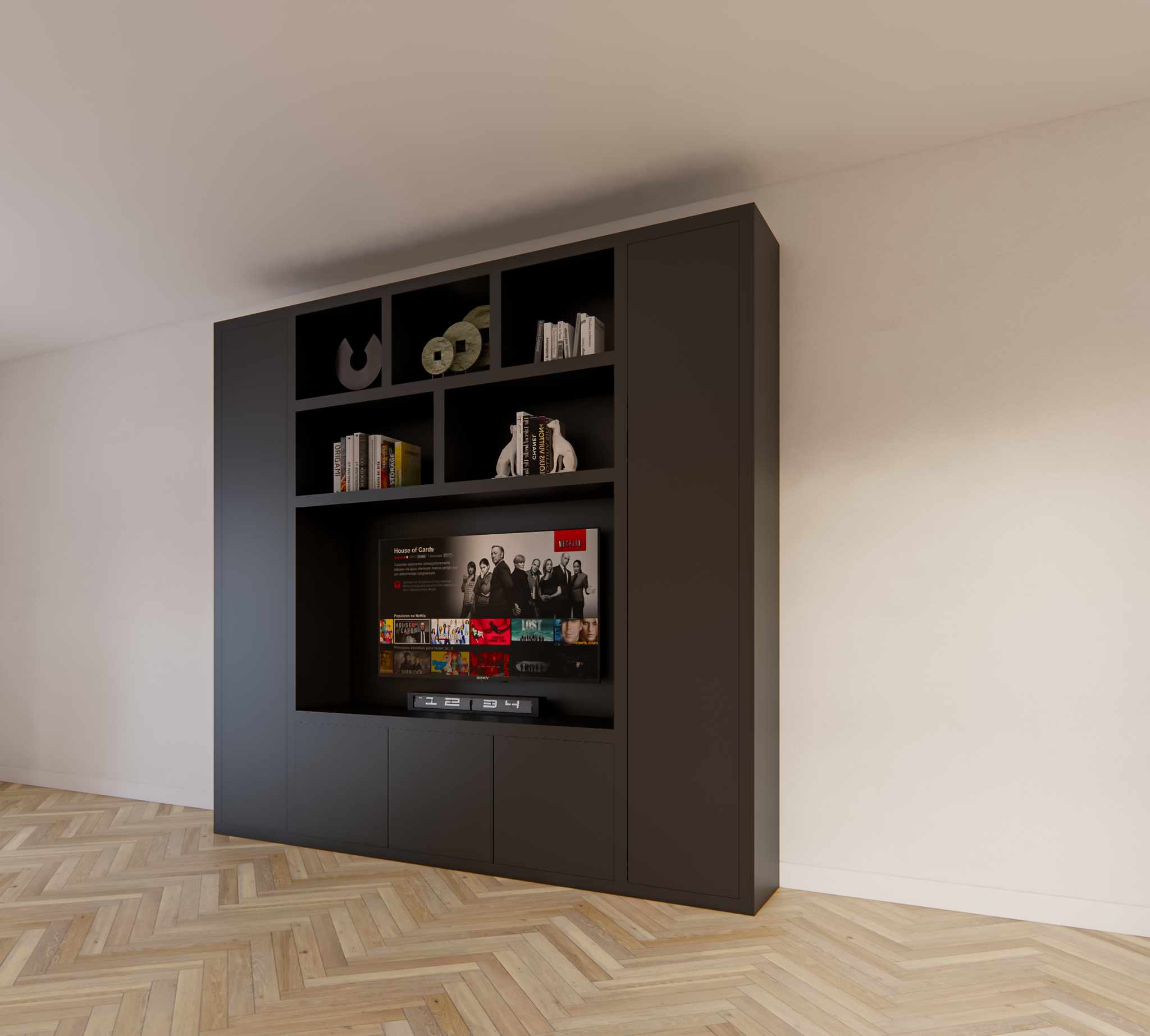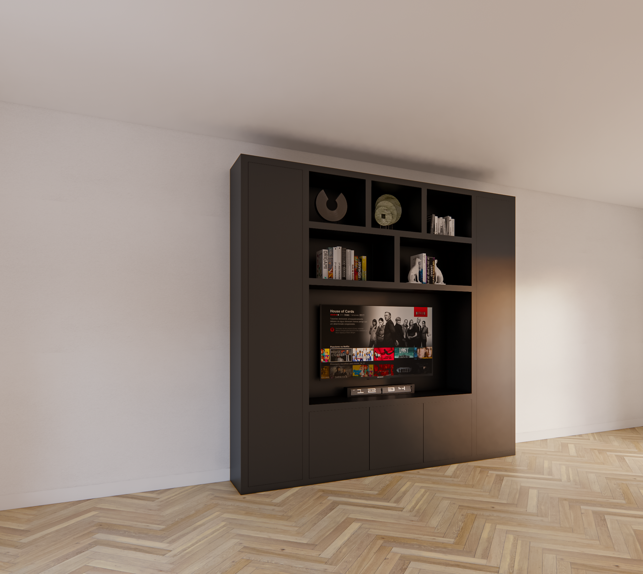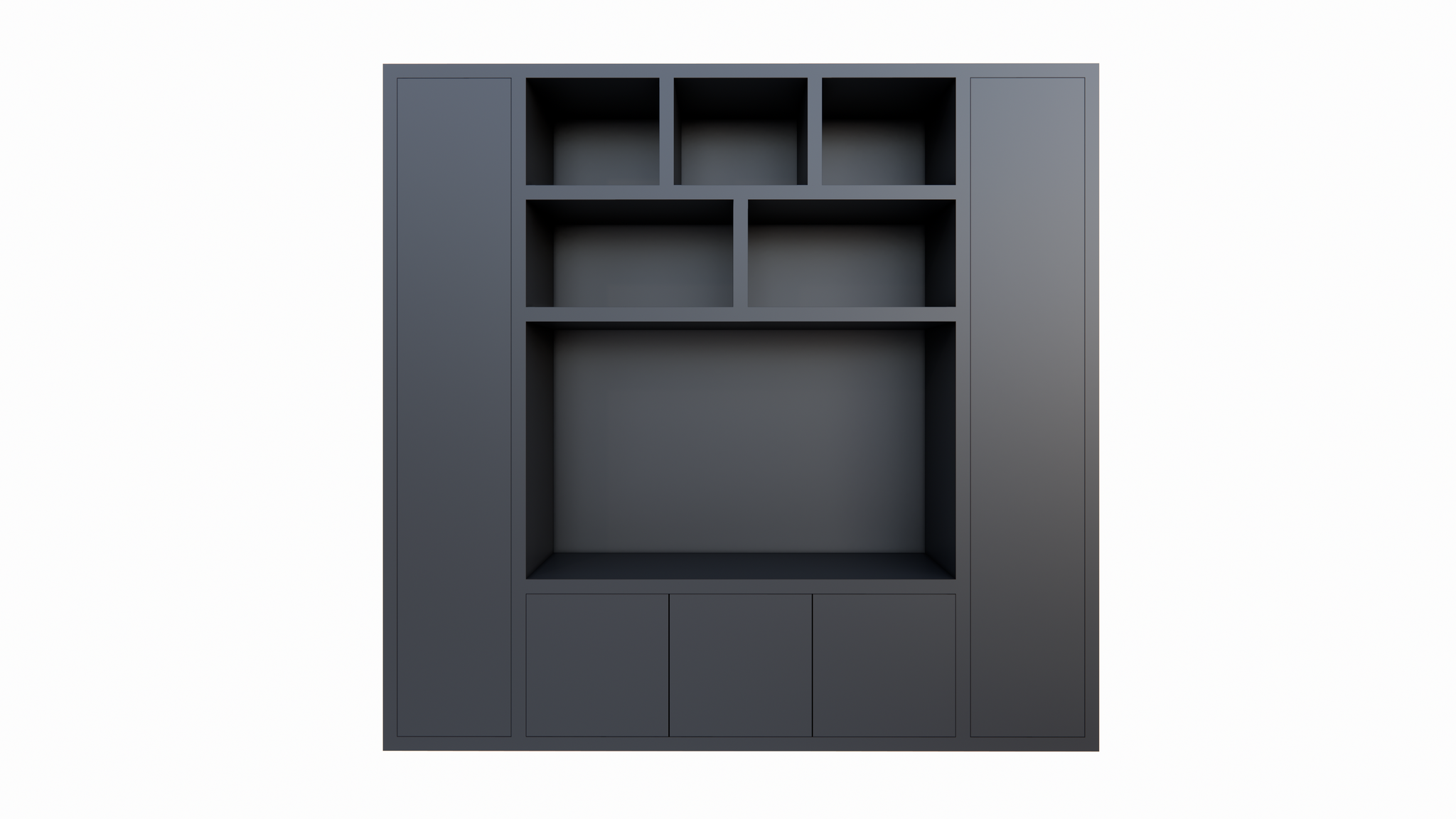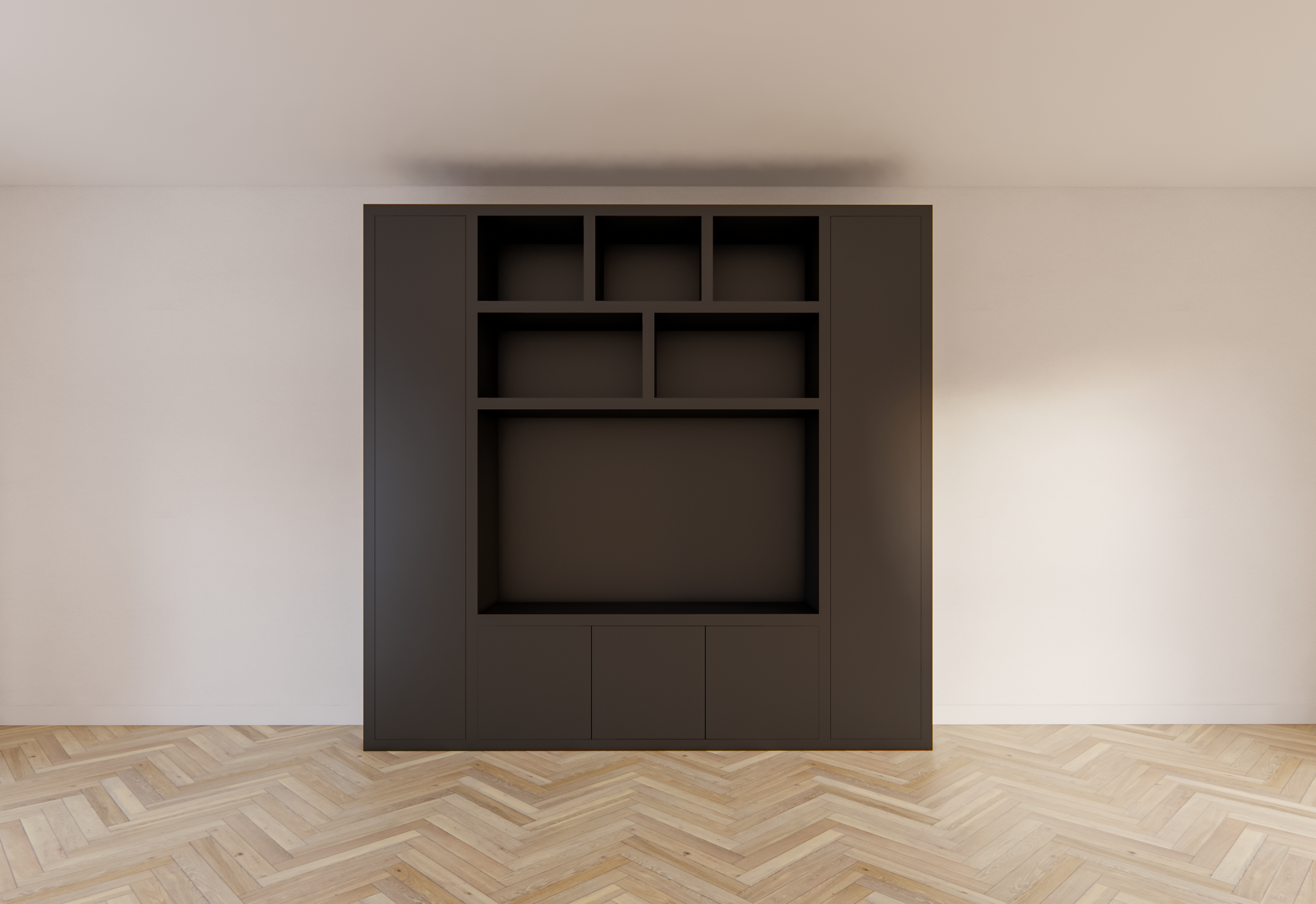 >Diese Version des Schranks Austin ist 250 cm breit, 40 cm tief und 240 cm hoch. Oben befinden sich mehrere offene Fächer, die sich perfekt zur Präsentation von Büchern, Kunst, Pflanzen oder persönlichen Accessoires eignen. In der Mitte ist Platz für einen Fernseher oder ein Kunstwerk, während unten drei grifflose Push-to-Open-Türen für Ordnung sorgen. Die flachen Fronten, die saubere Verarbeitung und der Verzicht auf sichtbare Griffe verleihen dem Schrank Schlichtheit und Klasse.