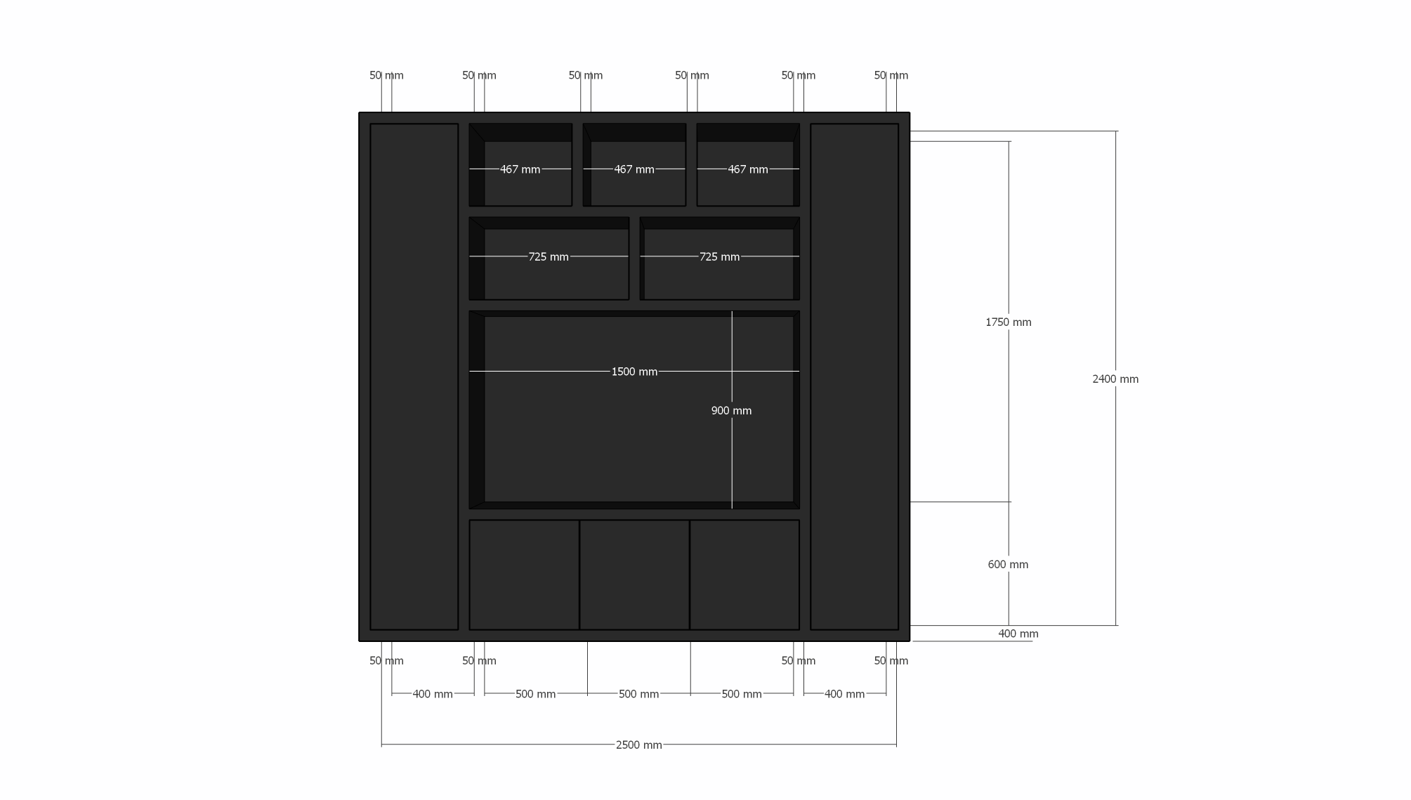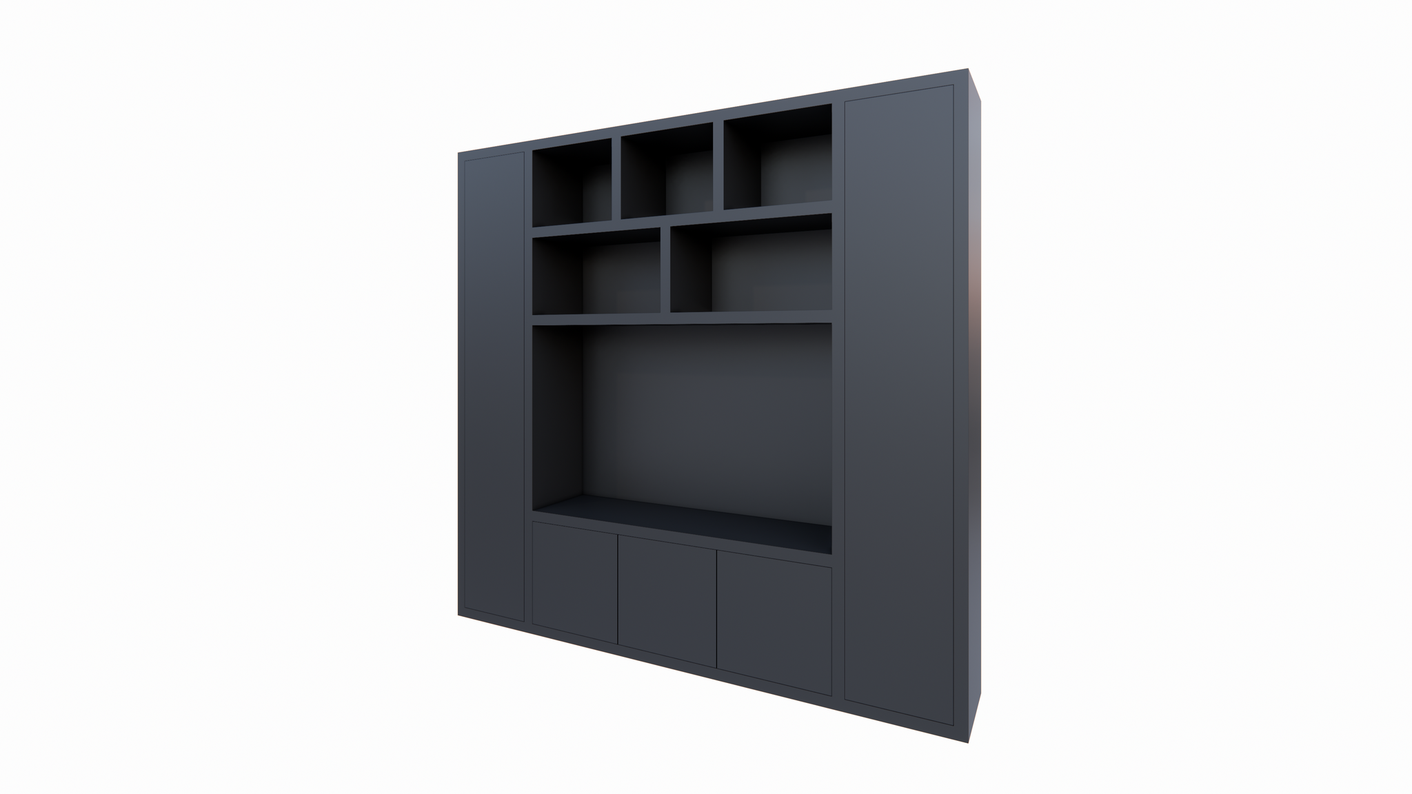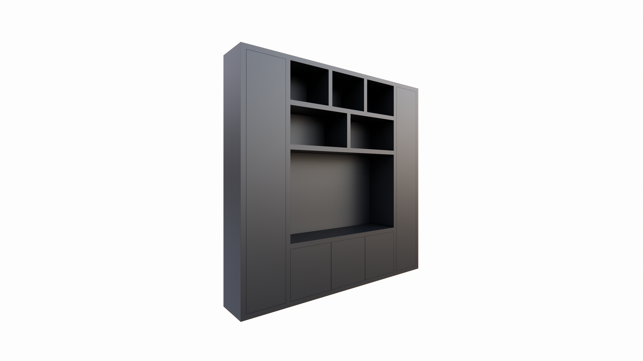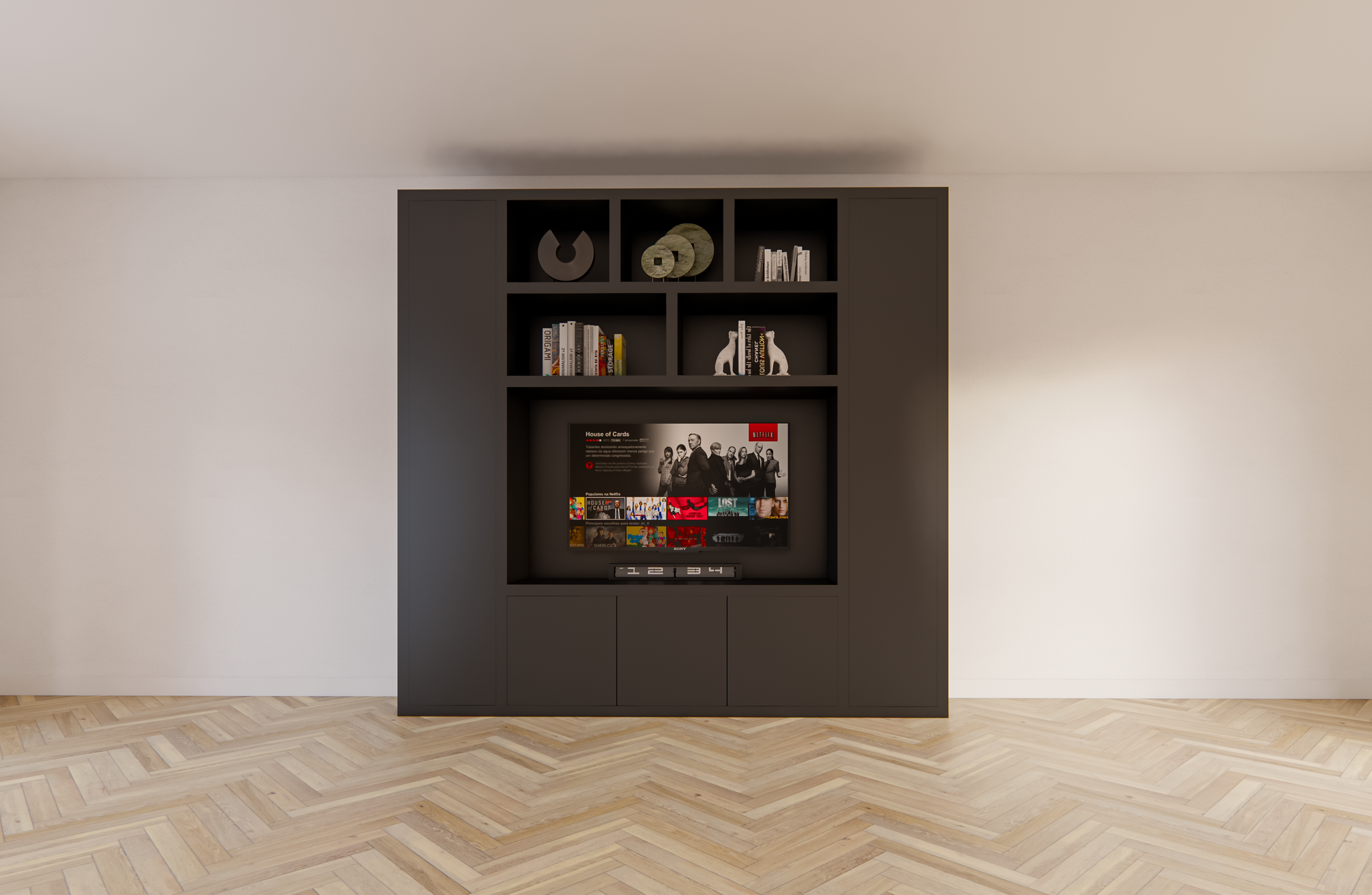 >Diese Version des Schranks Austin ist 250 cm breit, 40 cm tief und 240 cm hoch. Oben befinden sich mehrere offene Fächer, die sich perfekt zur Präsentation von Büchern, Kunst, Pflanzen oder persönlichen Accessoires eignen. In der Mitte ist Platz für einen Fernseher oder ein Kunstwerk, während unten drei grifflose Push-to-Open-Türen für Ordnung sorgen. Die flachen Fronten, die saubere Verarbeitung und der Verzicht auf sichtbare Griffe verleihen dem Schrank Schlichtheit und Klasse.