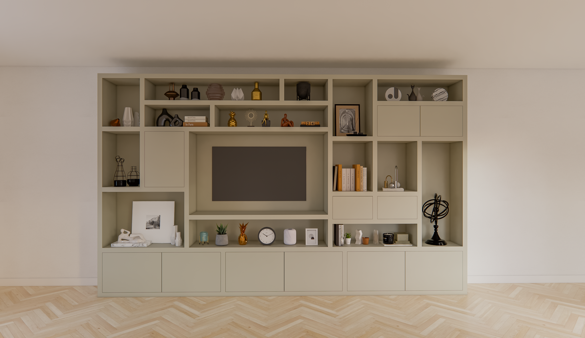 Der Vasto verfügt über schlichte, aufschiebbare Türen, die einen minimalistischen Look ohne sichtbare Griffe bieten. Die 5 cm dicken Einlegeböden verleihen dem Schrank einen robusten und soliden Charakter, während das offene Fächerkonzept Platz bietet, um Dekoartikel oder Bücher schön zu präsentieren.