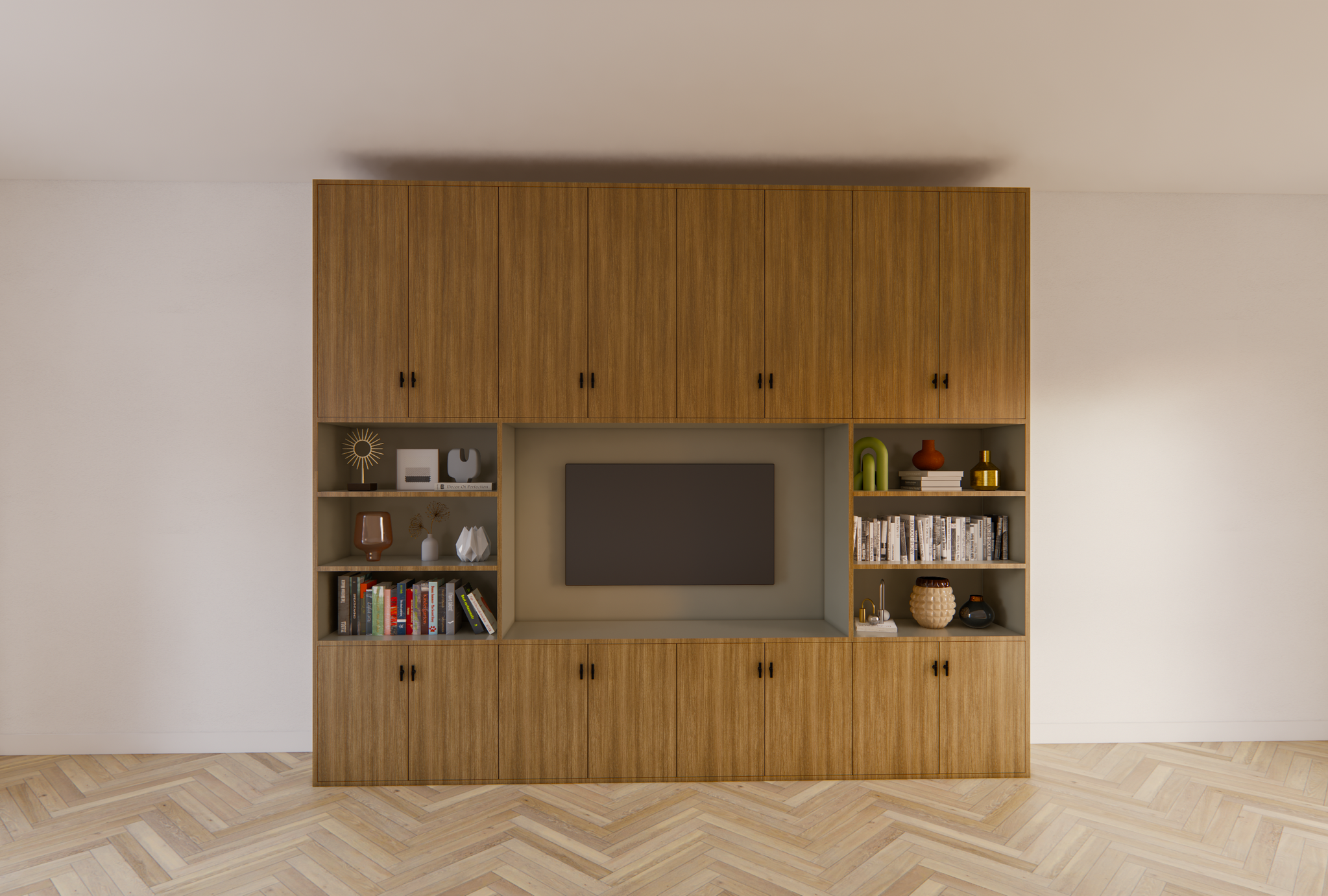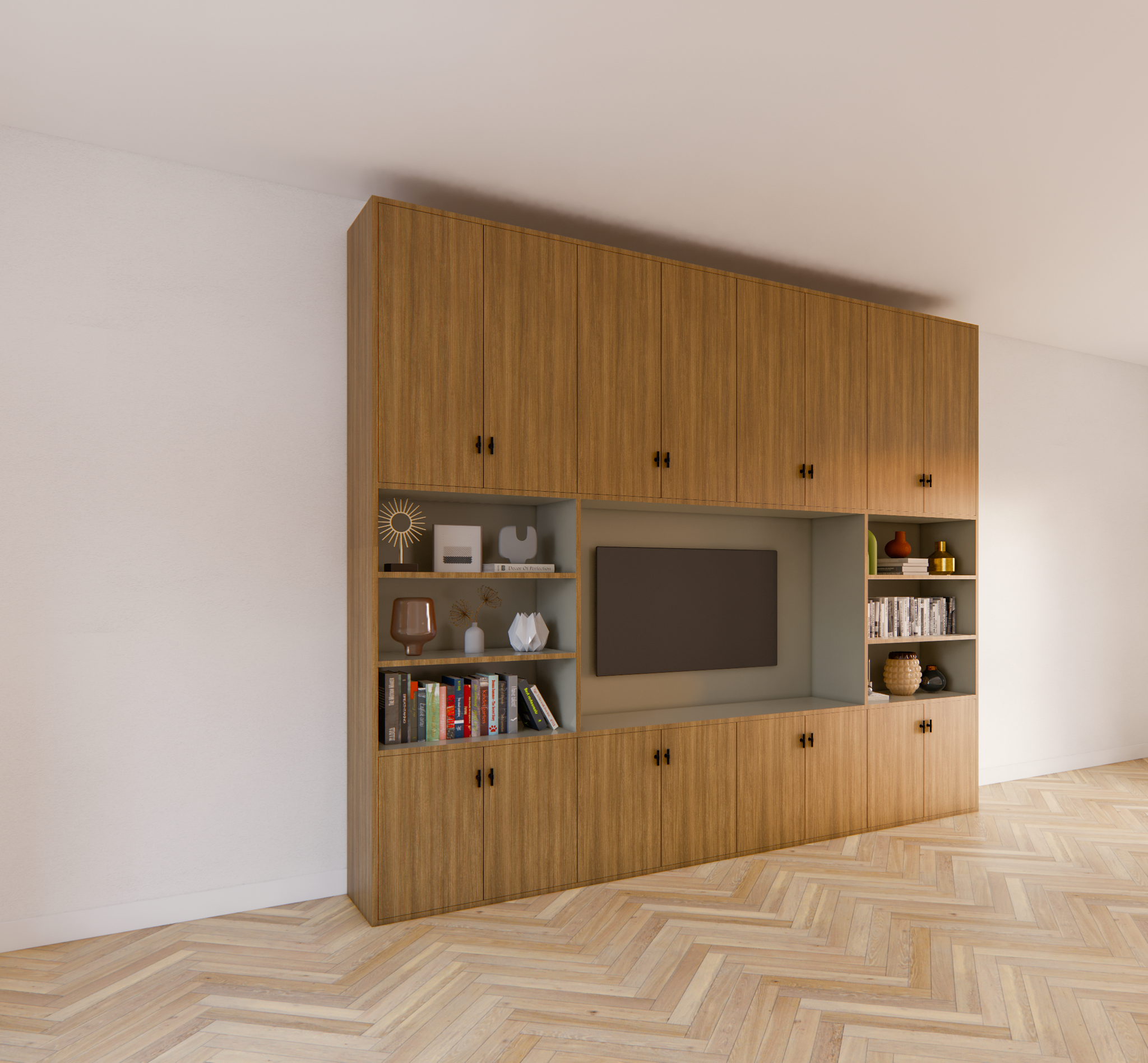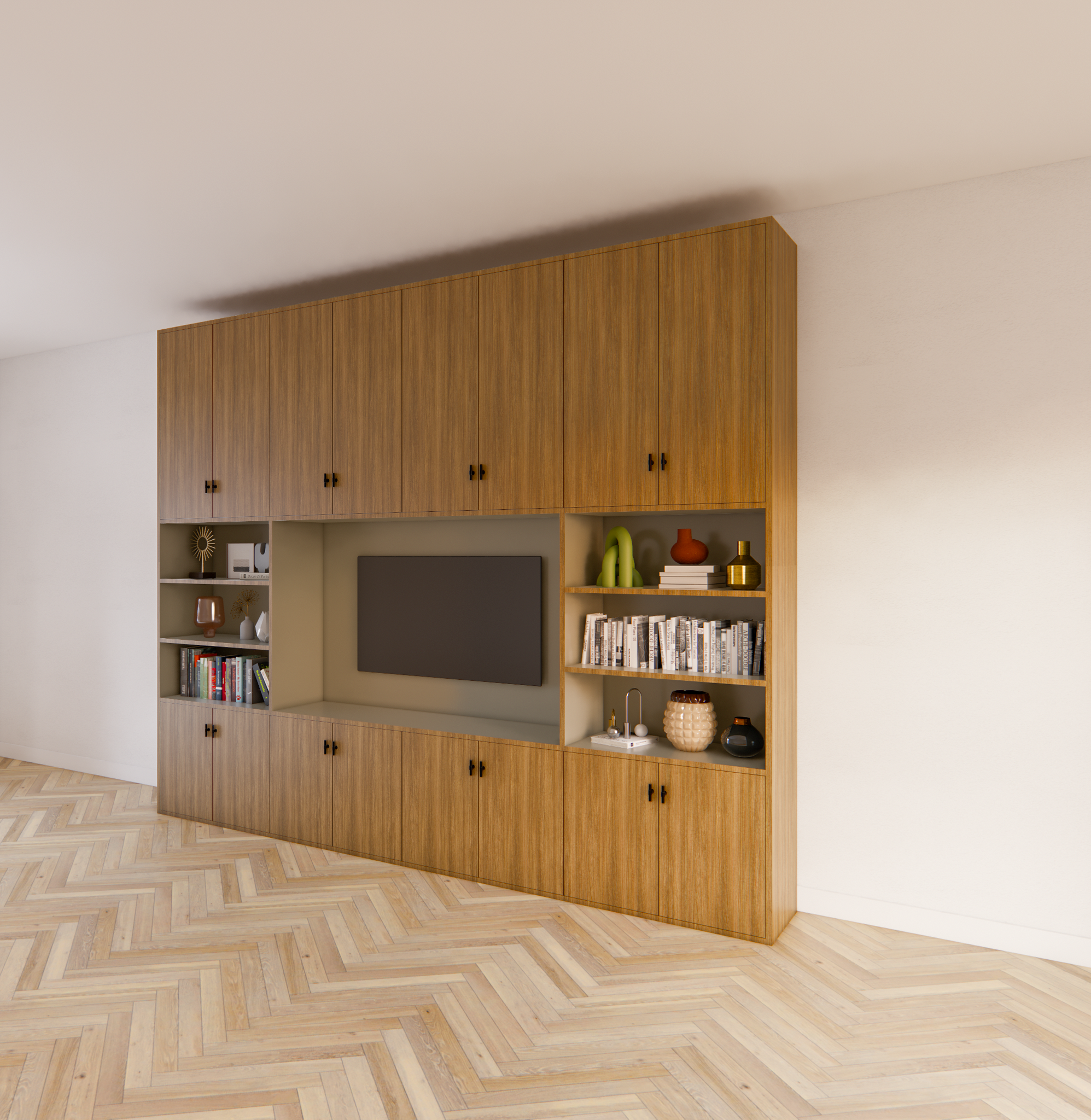 Der Schrank ist in Eiche natur lackiert, was ihm ein warmes und zeitloses Aussehen verleiht. Die clevere Aufteilung rund um ein geräumiges TV-Fach bietet nicht nur Platz für den Fernseher, sondern auch für Bücher, Accessoires, Geräte und andere persönliche Gegenstände. Der Schrank fügt sich nahtlos in die Wand ein und setzt in jedem Raum einen stilvollen Akzent.