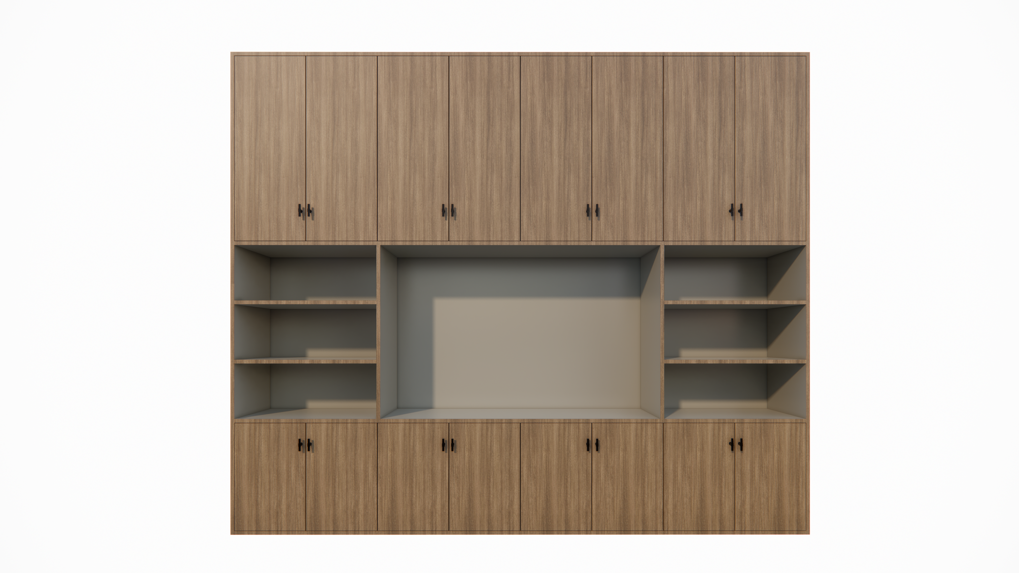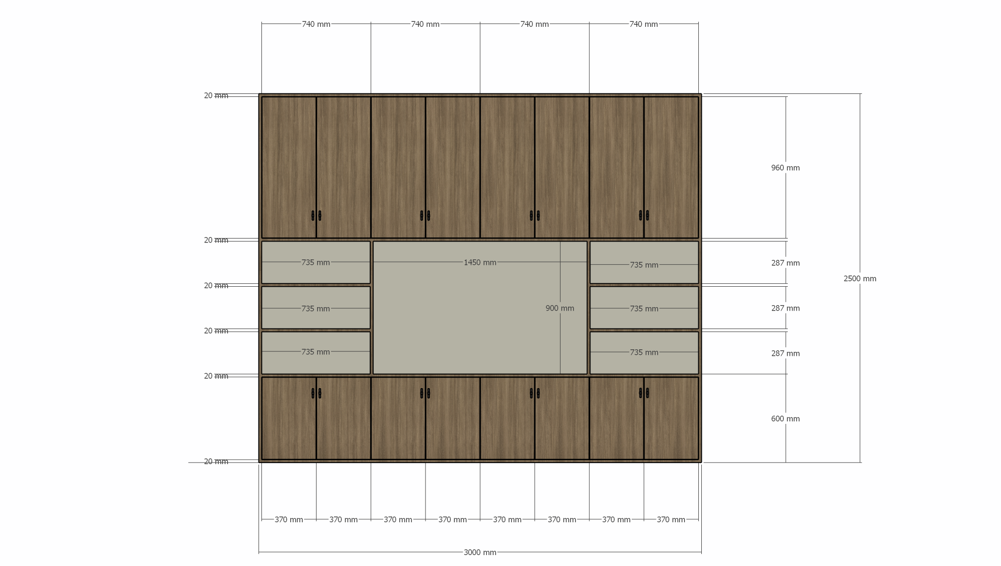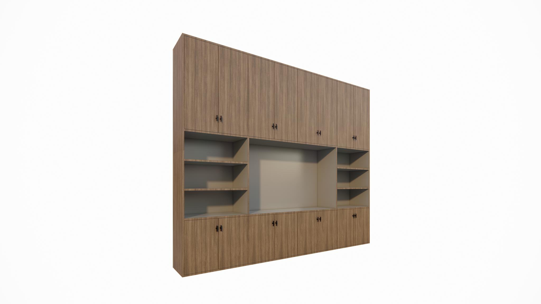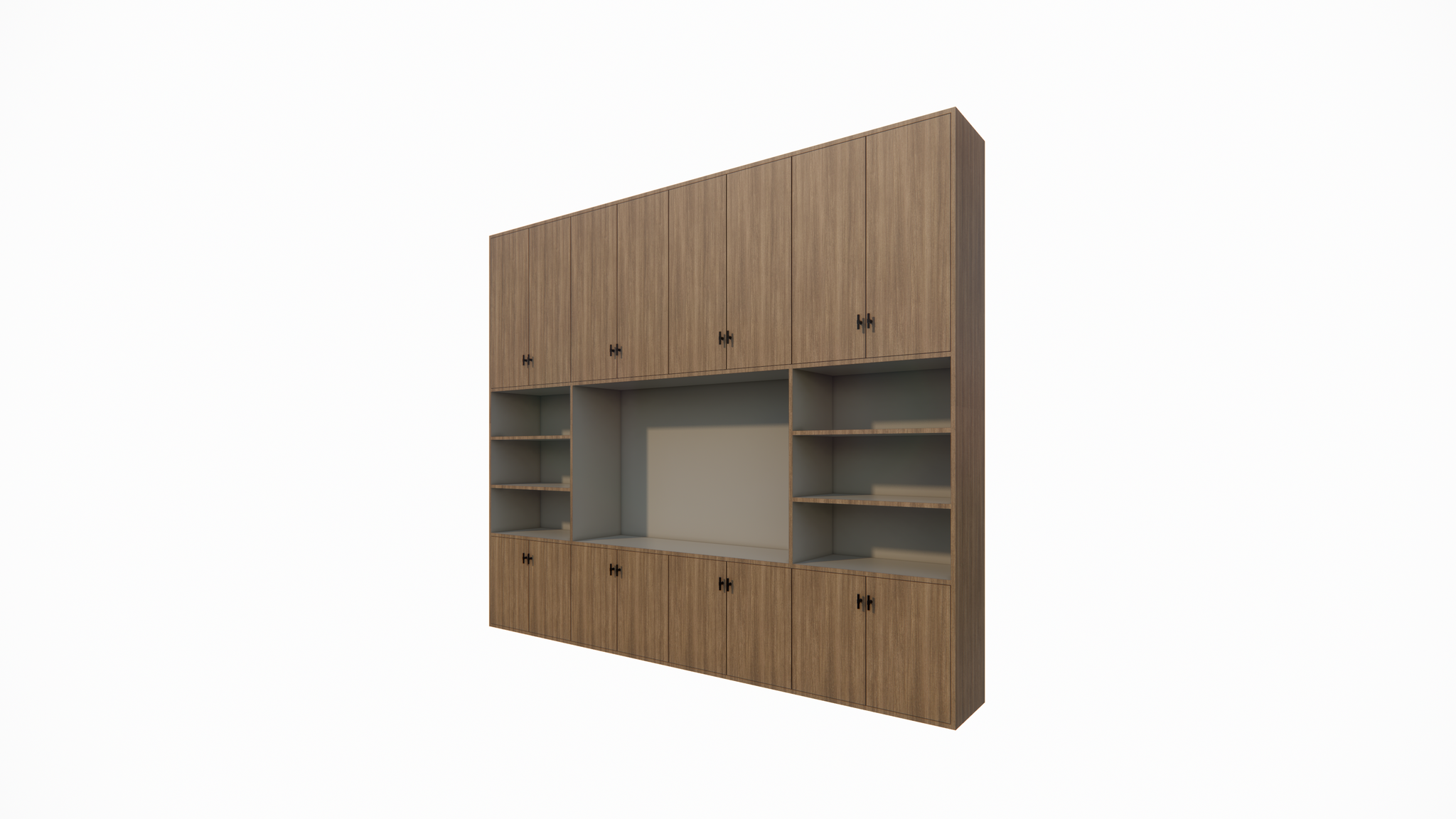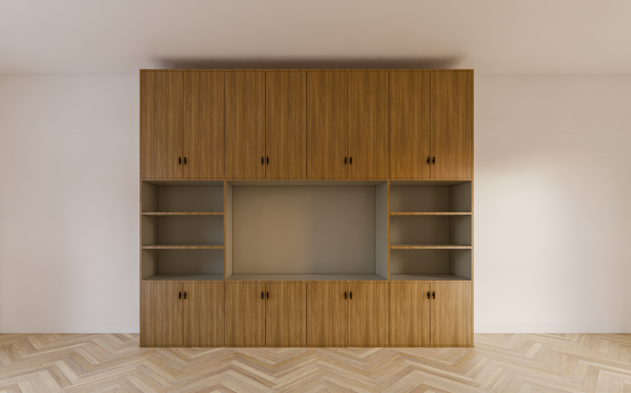 Dieser Schrank ist standardmäßig in den Maßen 300 x 40 x 250 cm erhältlich, kann aber bei Bedarf auch ganz individuell gestaltet werden. Denken Sie an eine individuelle Breite oder Höhe, eine andere Anordnung der Fächer oder das Hinzufügen von Beleuchtung oder Kabeldurchlässen.